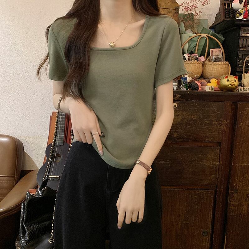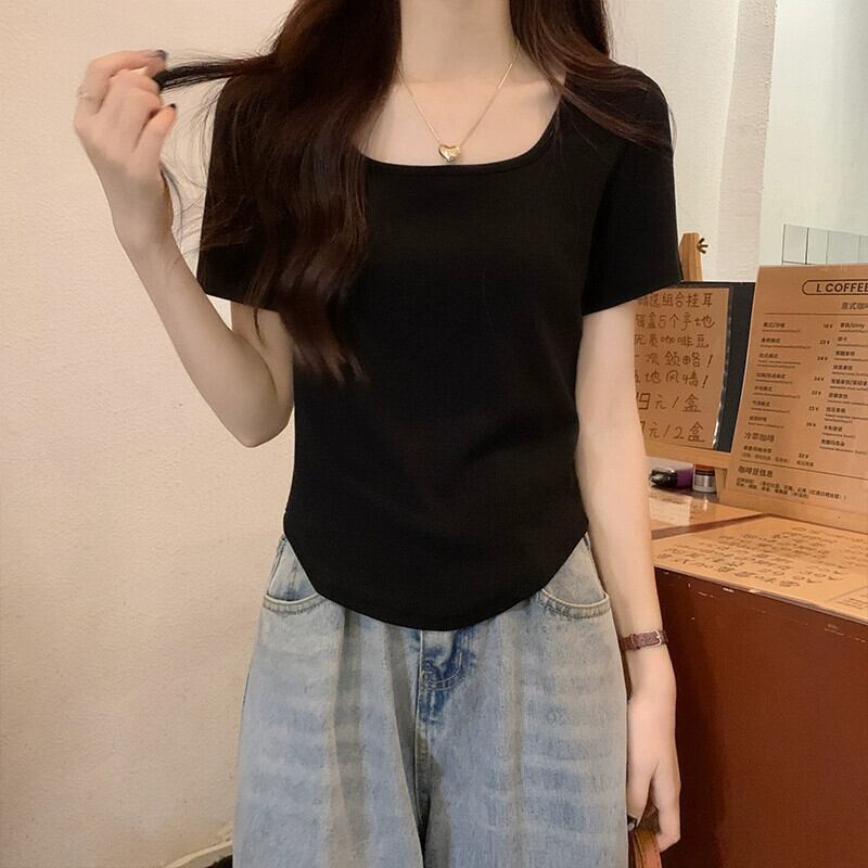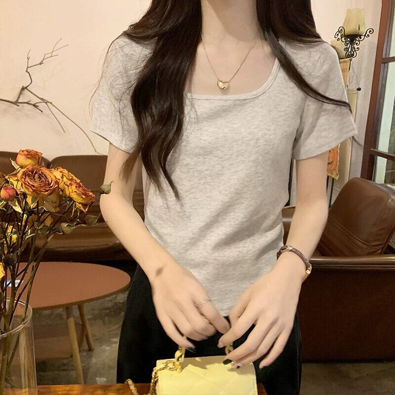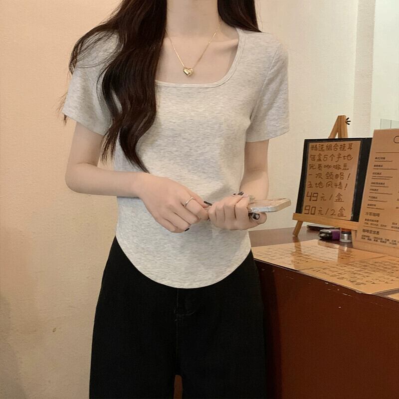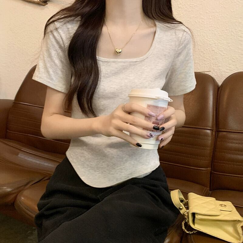 ホワイトフラワーグレーフロントショルダー半袖Tシャツレディース夏デザインセンスニッチシックスリムスリムスクエアカラーショートトップス サマー 夏物 フラワーデザイン スクウェア 8571635575128162