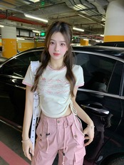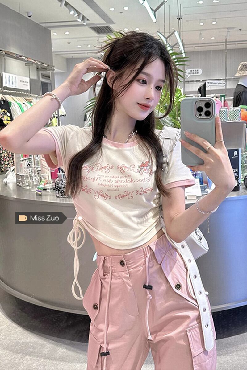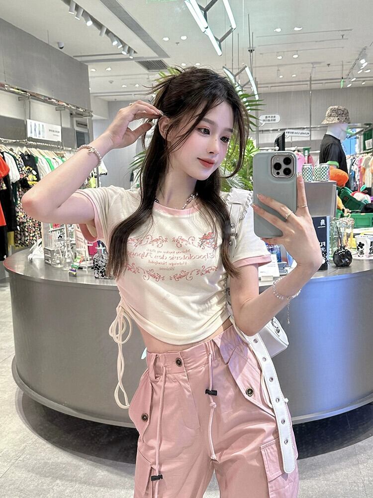 ミルクアプリコットカラー半袖Tシャツレディース2023年夏新デザインセンスニッチアメリカンスイートスリムショートトップ 大人ガーリー スウィート キュート カジュアル サマー 夏物 8571621122529436