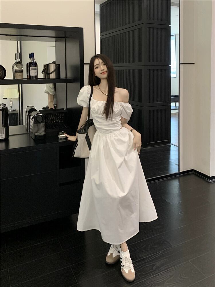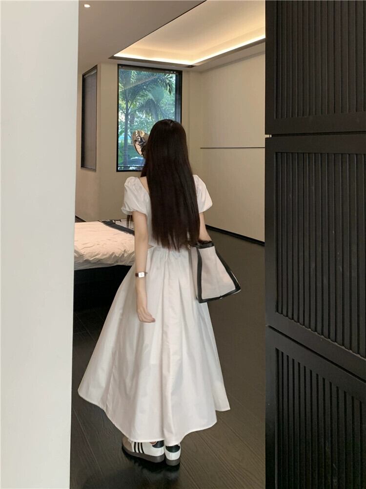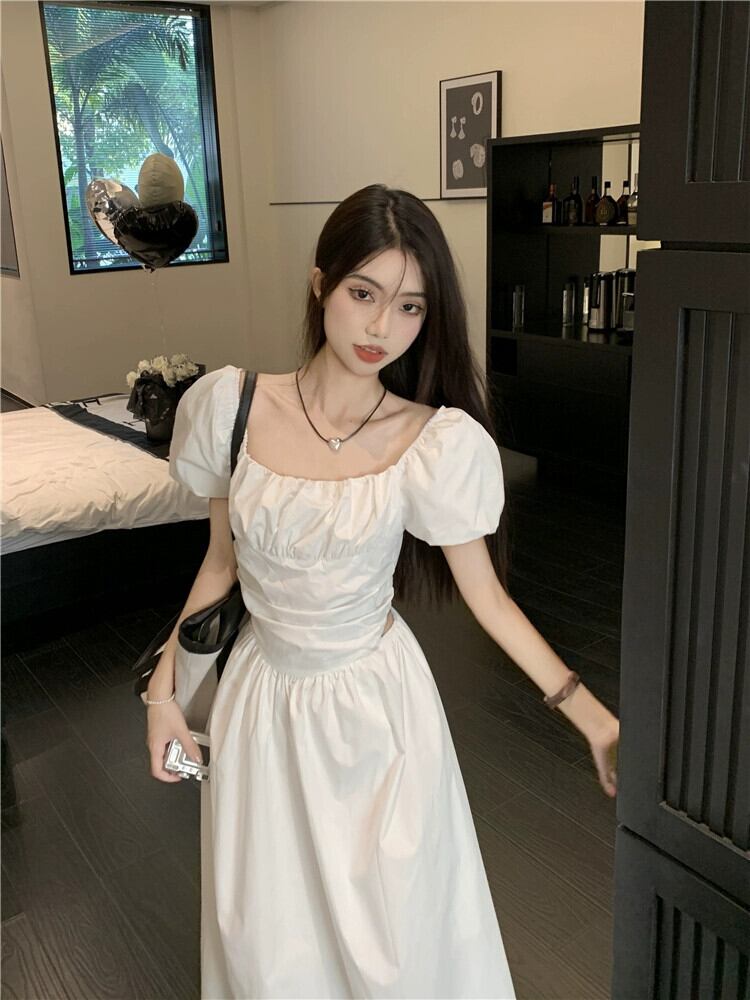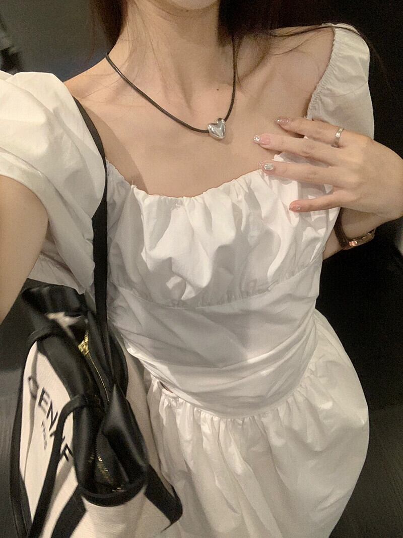 白いウエストレスドレス女性の夏 2023 新しいフランスの初恋優しい気質スクエアカラーパフスリーブロングスカート ホワイト サマー 夏物 スクウェア 8571624058607782