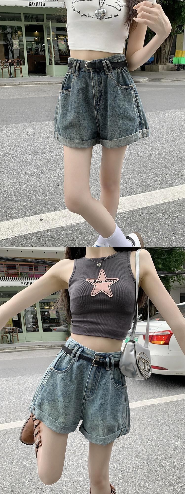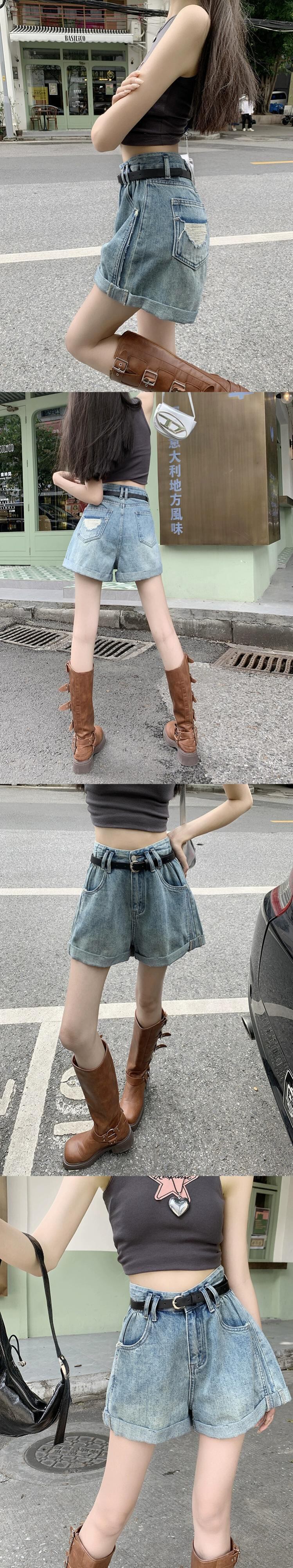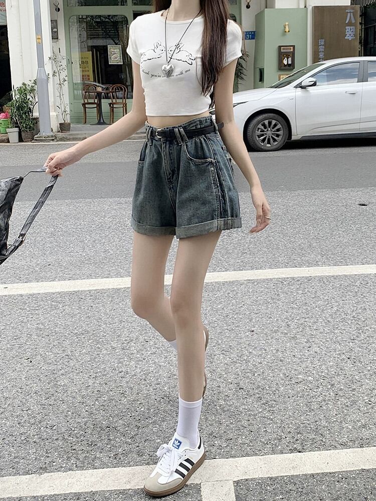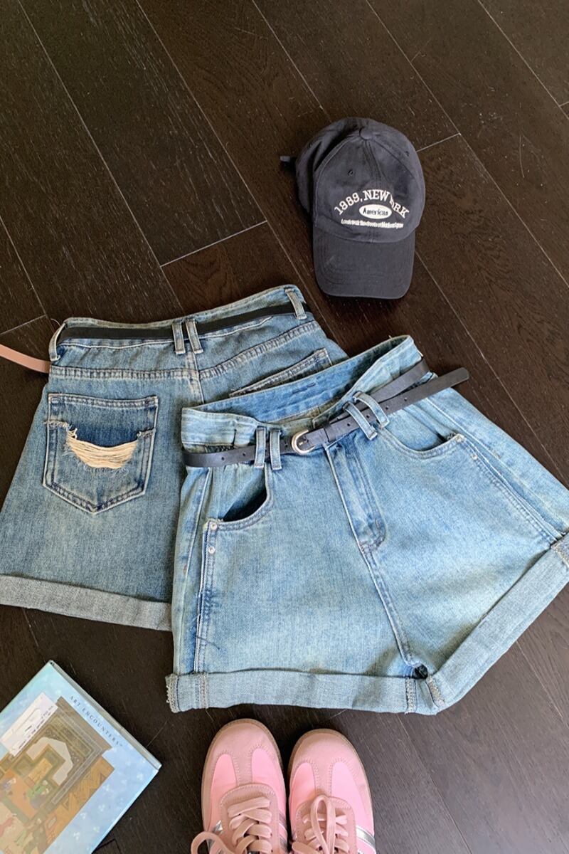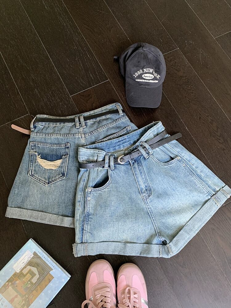 ライトブルーカーリーエッジデニムショートパンツ女性のデザインセンスニッチ夏の新しいハイウエスト痩身ベルト一言パンツ ハイウェスト サマー 夏物 ハーネス ショーツ ブルマー 8571633446558660