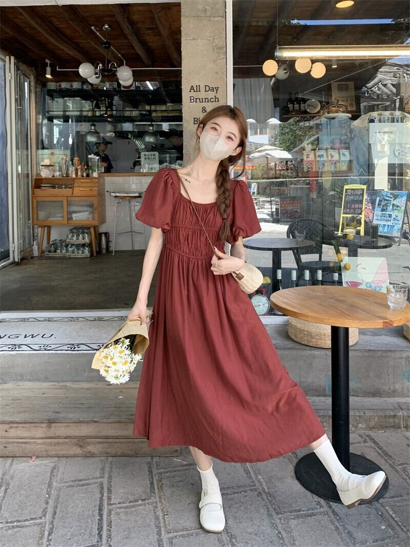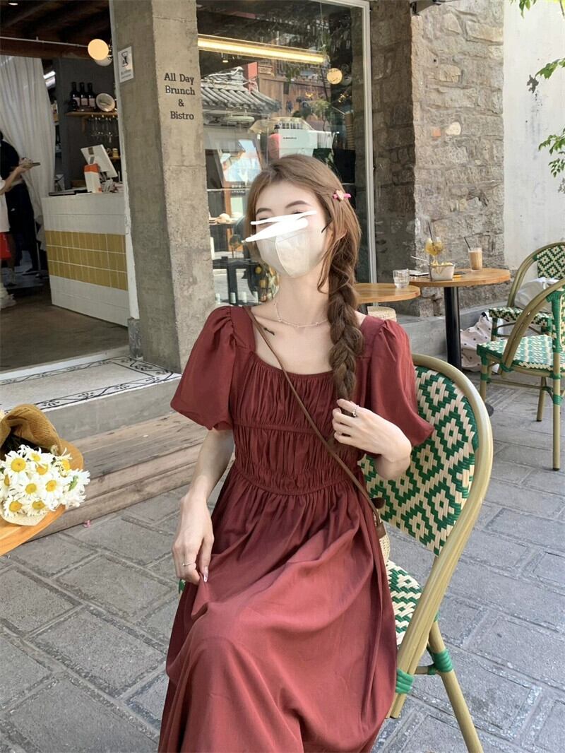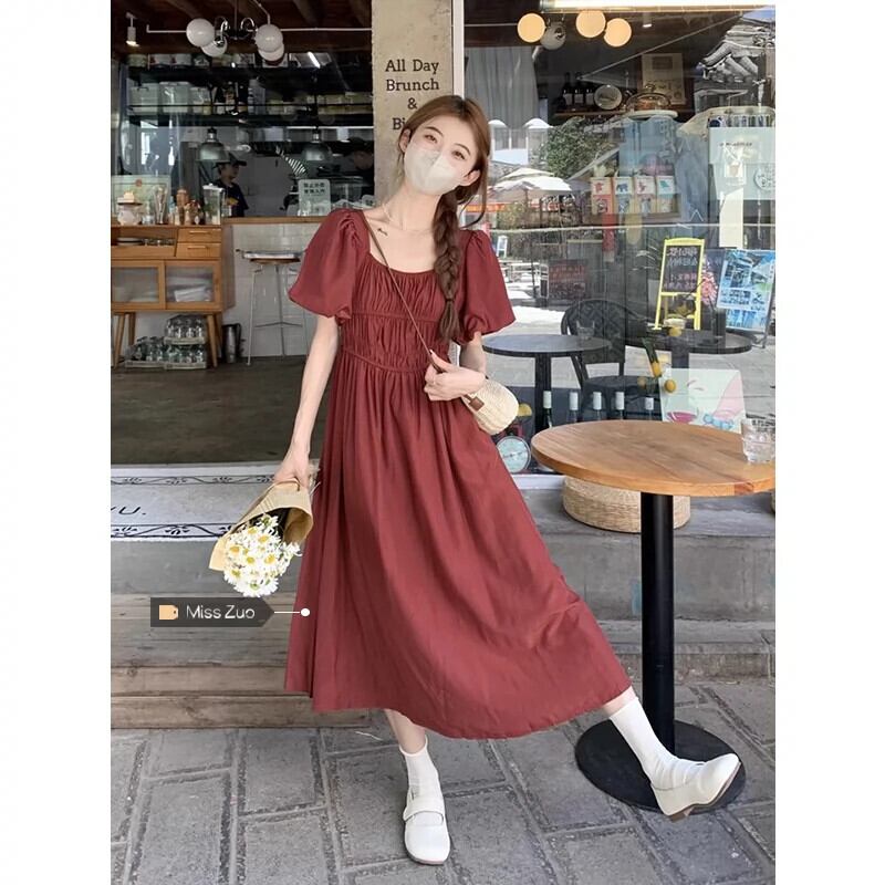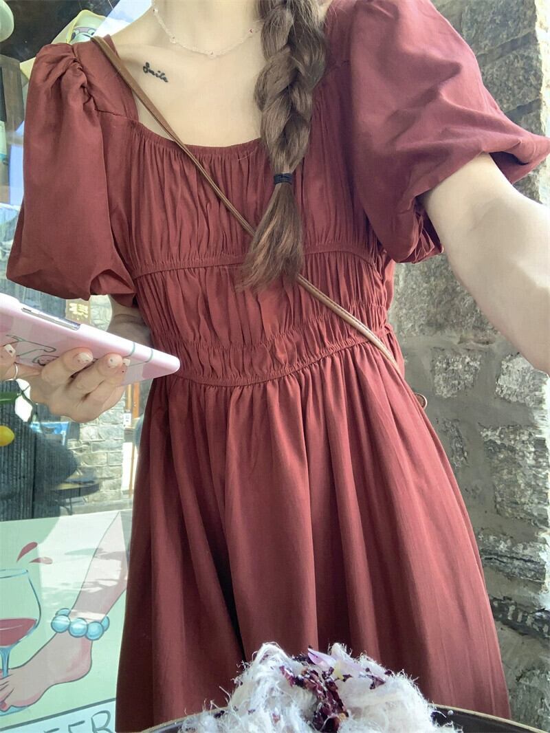 ワインレッドスクエアカラードレスレディース2023夏新作フレンチスタイル優しいスタイルパフスリーブウエストロングスカート サマー 夏物 スクウェア 8571683271788544