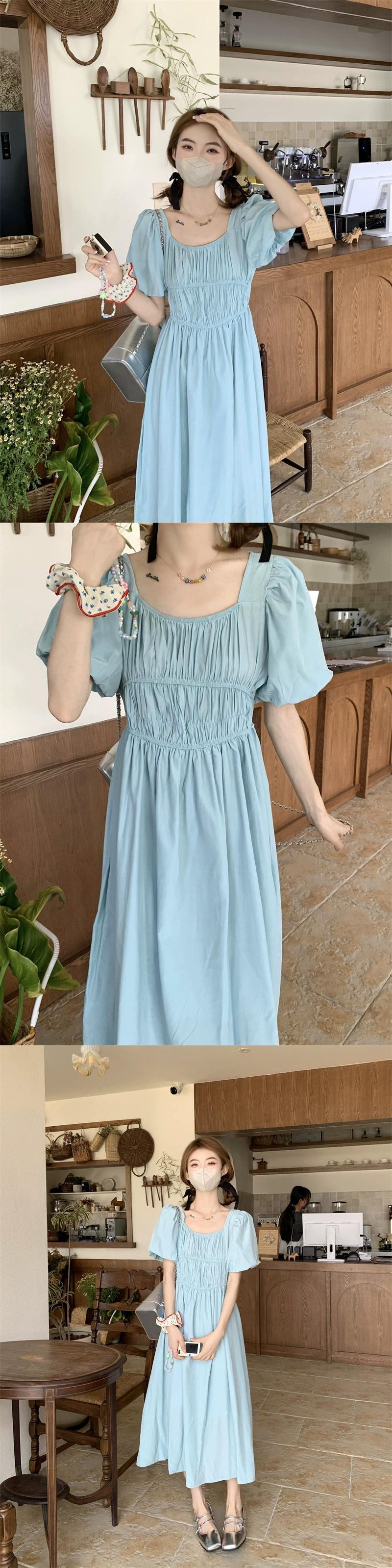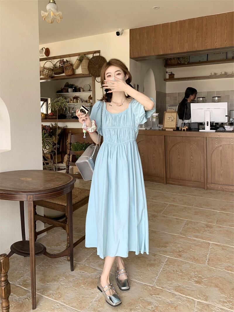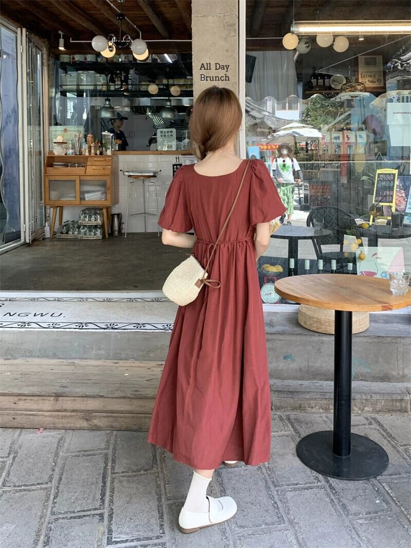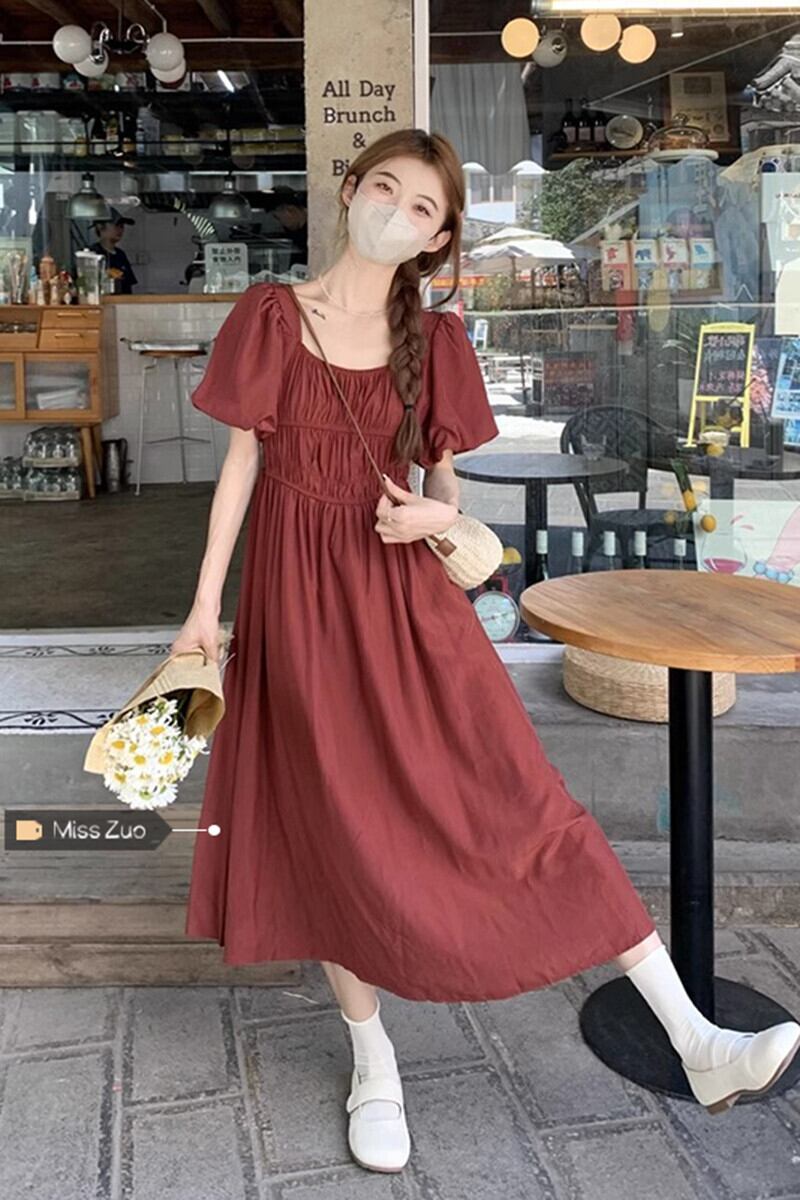 ワインレッドスクエアカラードレスレディース2023夏新作フレンチスタイル優しいスタイルパフスリーブウエストロングスカート サマー 夏物 スクウェア 8571683271788544