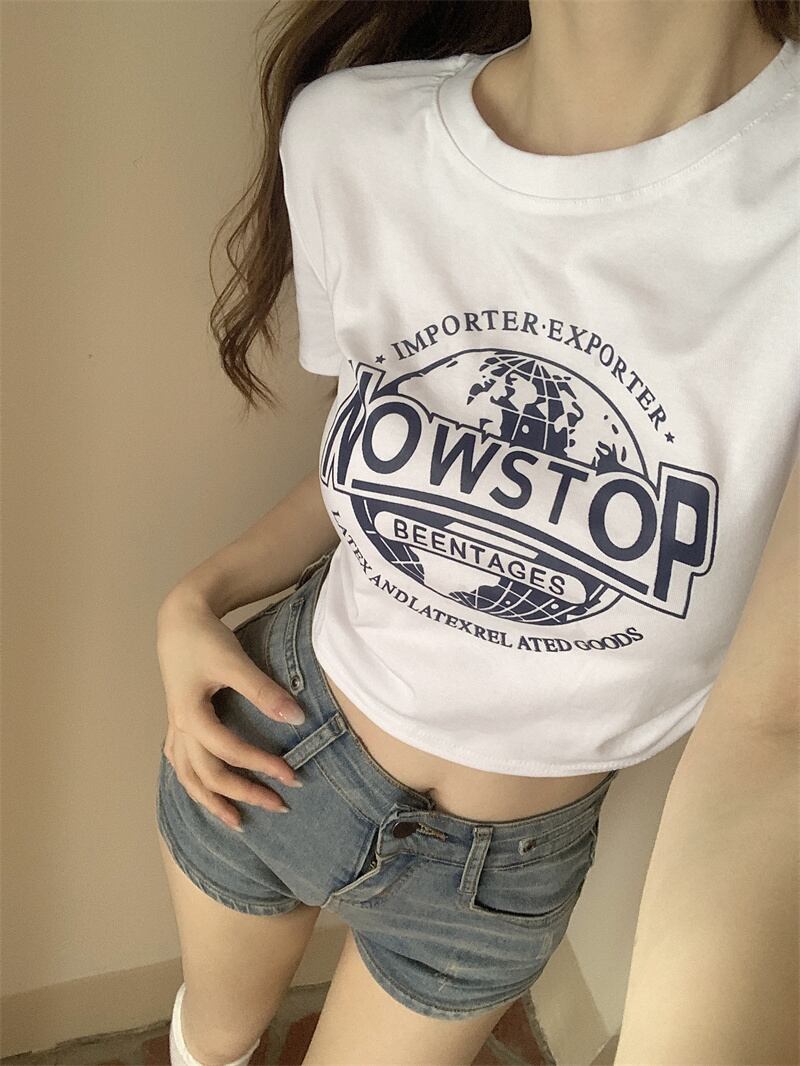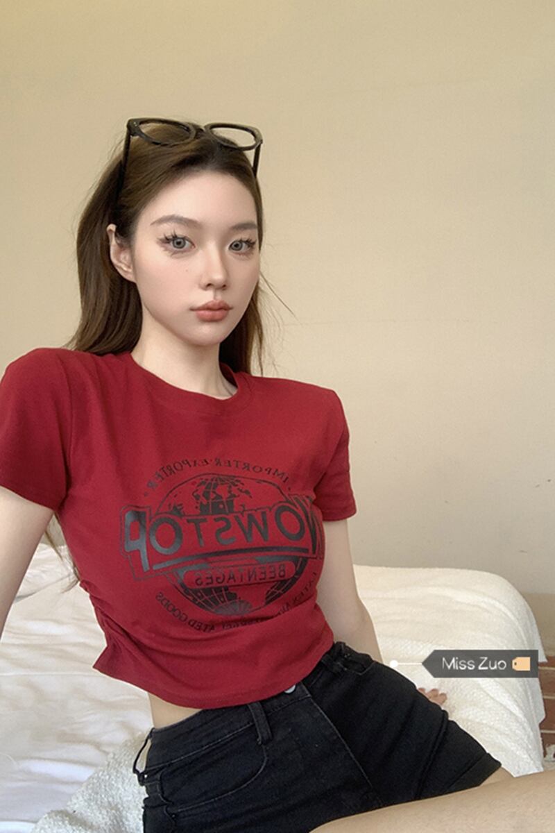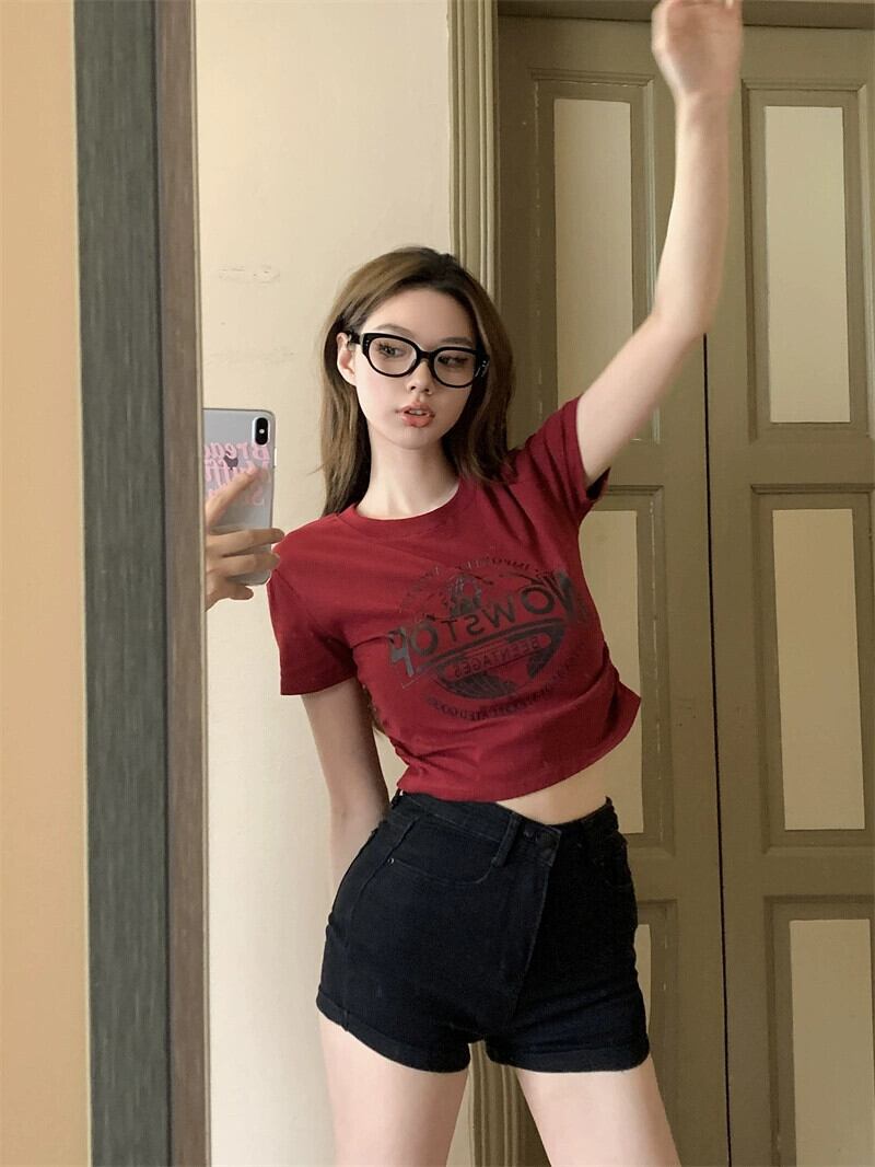 レッドフロントショルダー半袖Tシャツレディース夏デザインセンスニッチアメリカンレトロハイウエストクロップトップ ハイウェスト サマー 夏物 8571613922682755