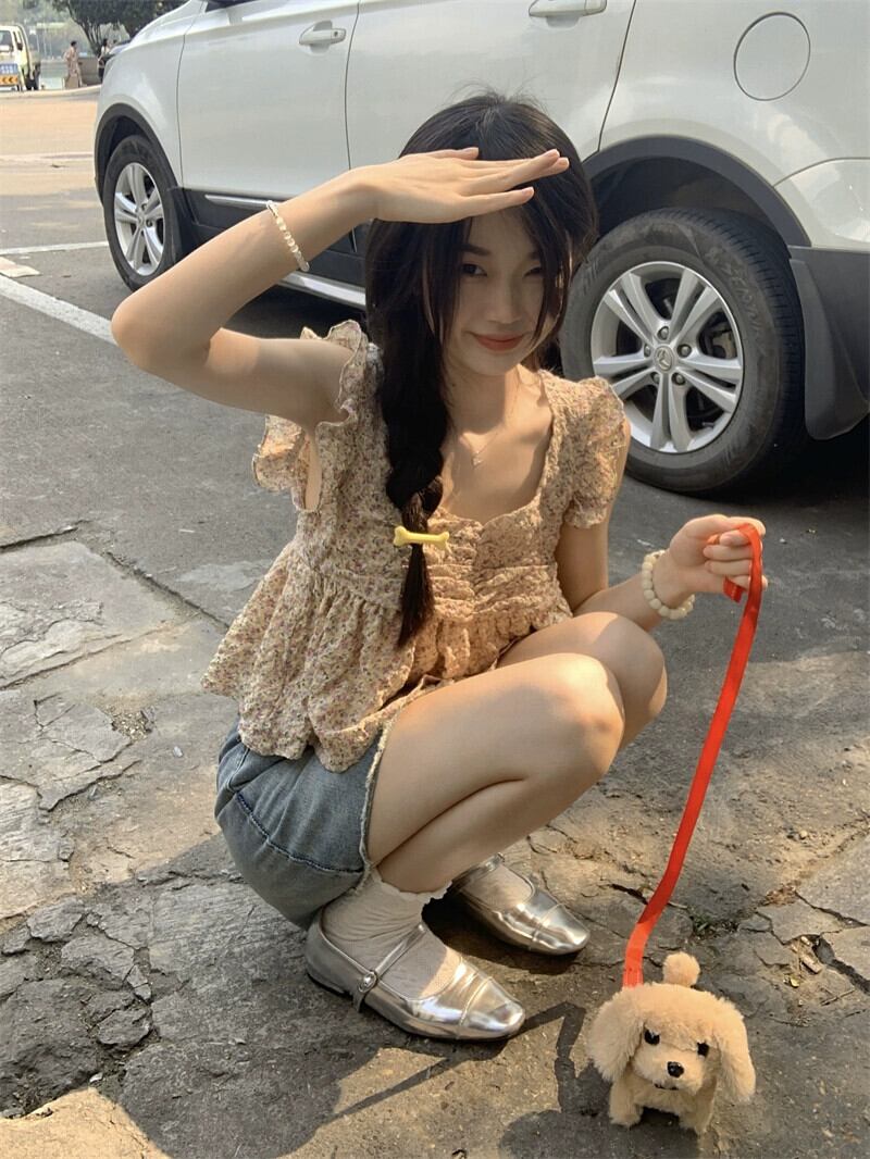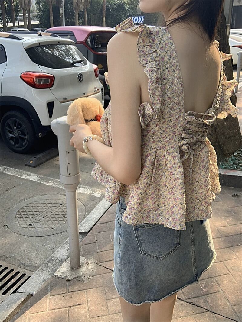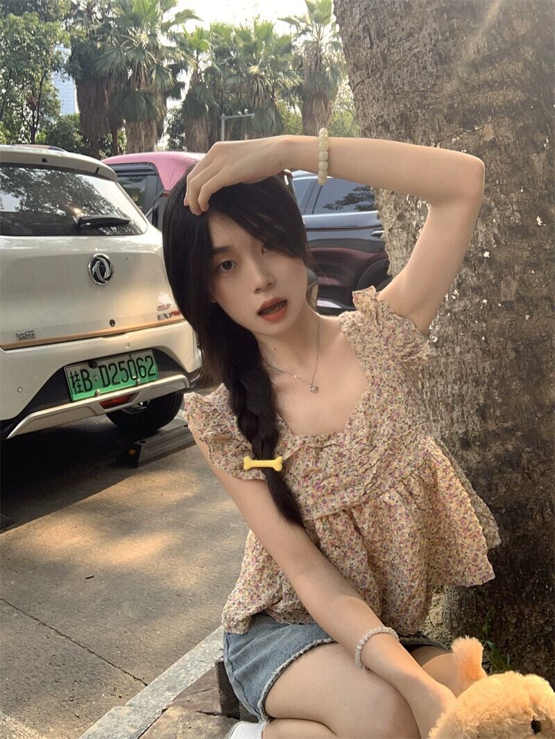 小さなフライングスリーブ、スクエアカラー、ショートトップ、レディースサマーデザイン、ニッチミルク、スイートバック、ストラップ付きシフォン花柄シャツ 大人ガーリー スウィート キュート カジュアル 夏物 スクウェア 8571630871510047