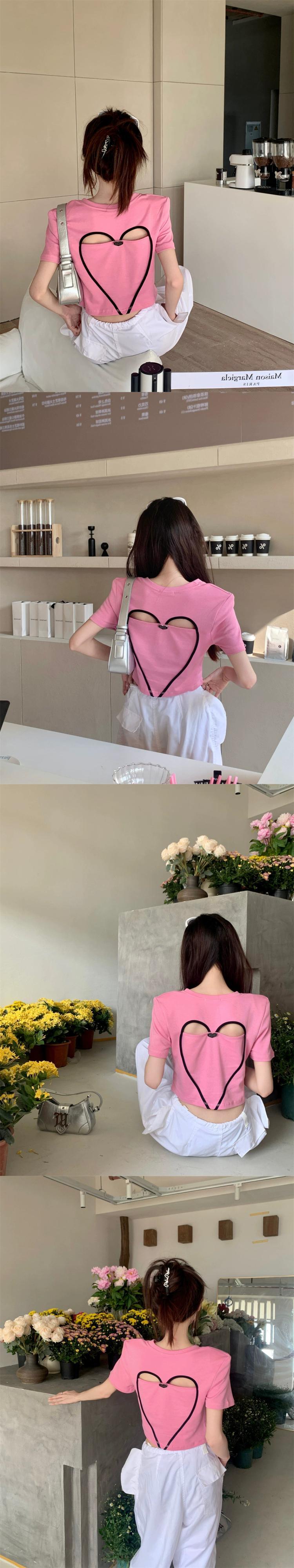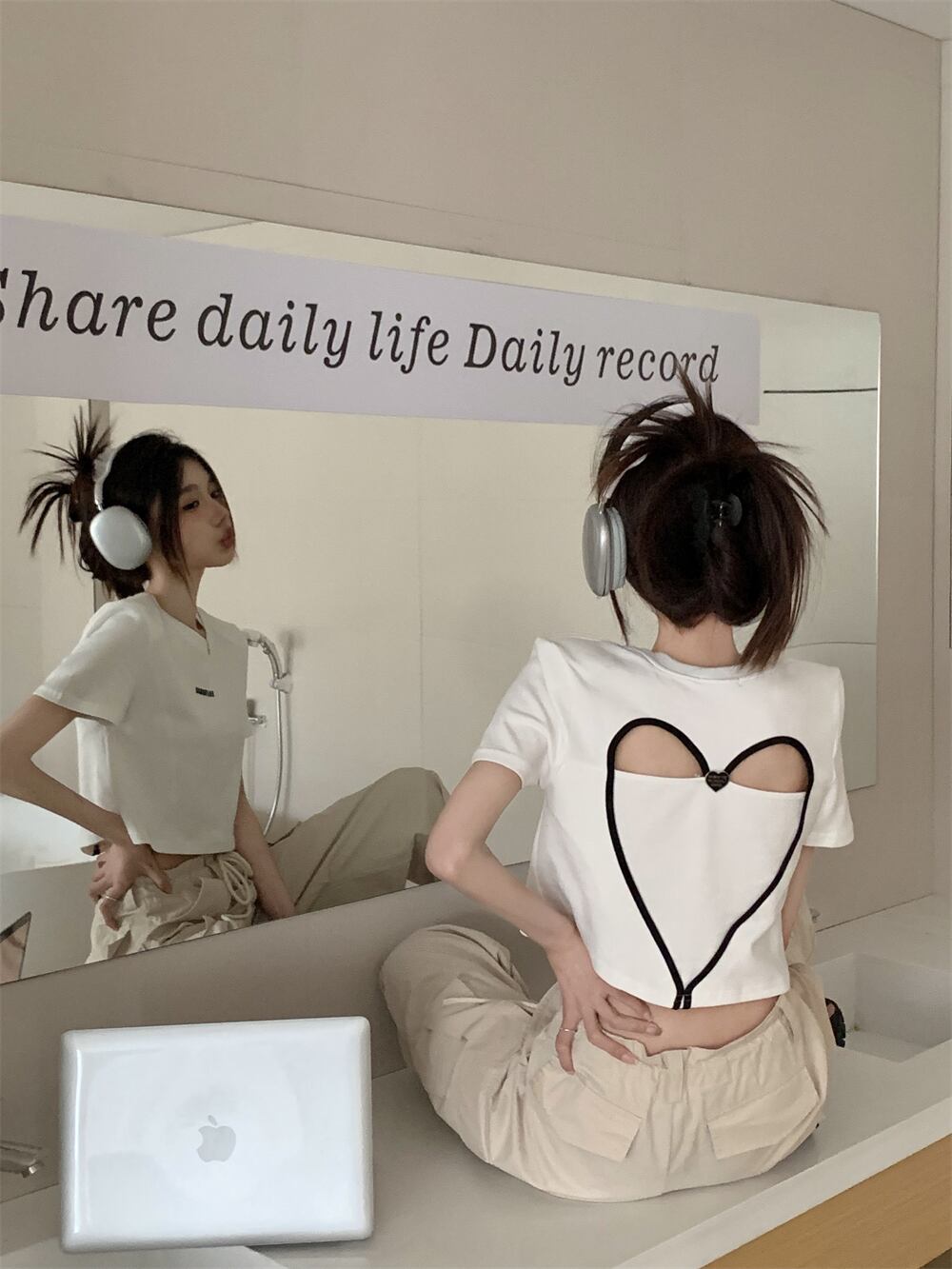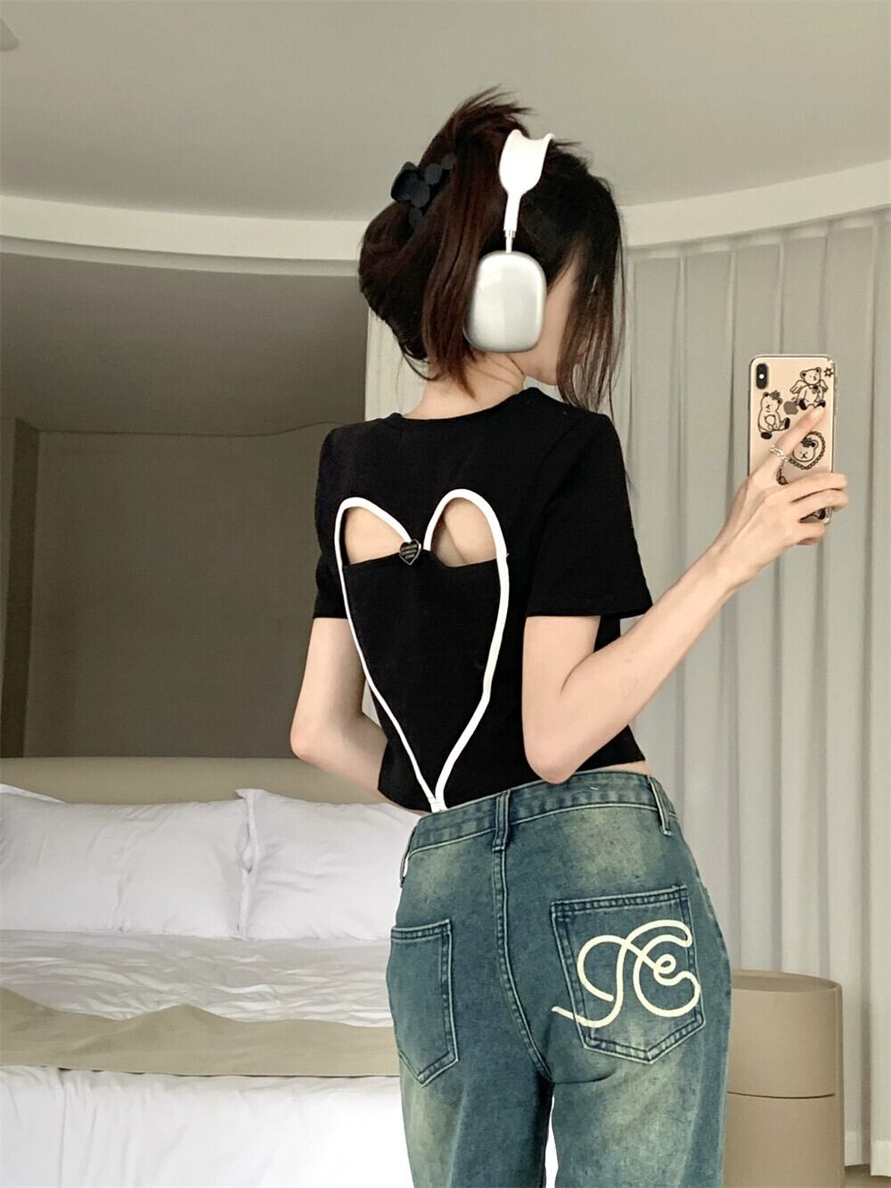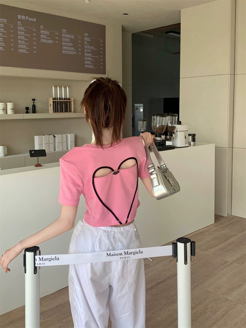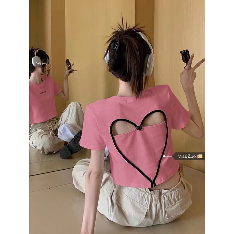 バックラブ中空半袖Tシャツレディース2023年夏新作ユニークでユニークな甘いフロントショルダーショートトップ 大人ガーリー スウィート キュート カジュアル サマー 夏物 8571684043305092