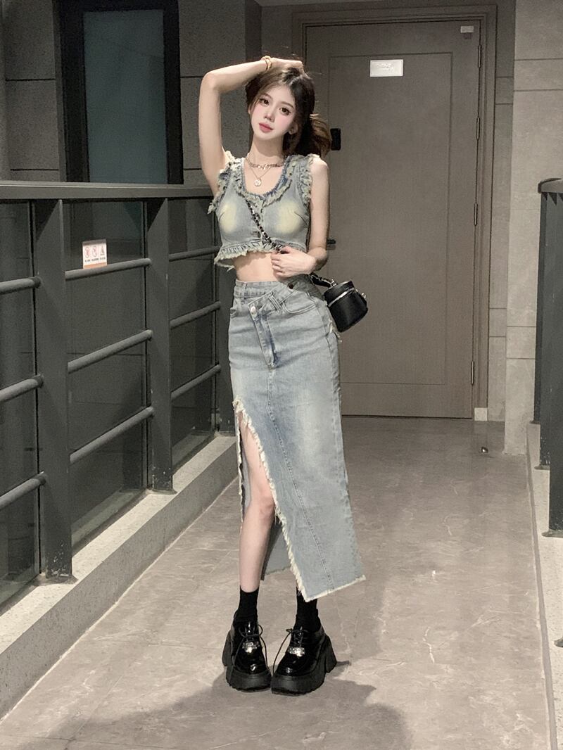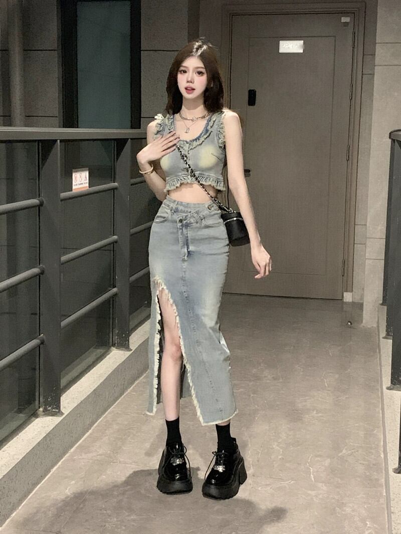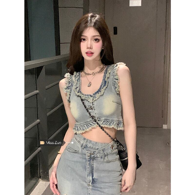 ローエッジデニムベスト女性の夏アウターラップ胸デザインセンスニッチ香港スタイル女の子セクシーなノースリーブショートトップ サマー 夏物 8571676641379937