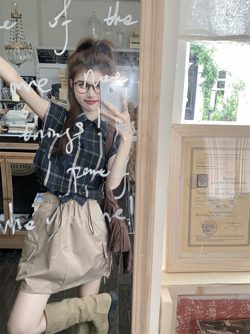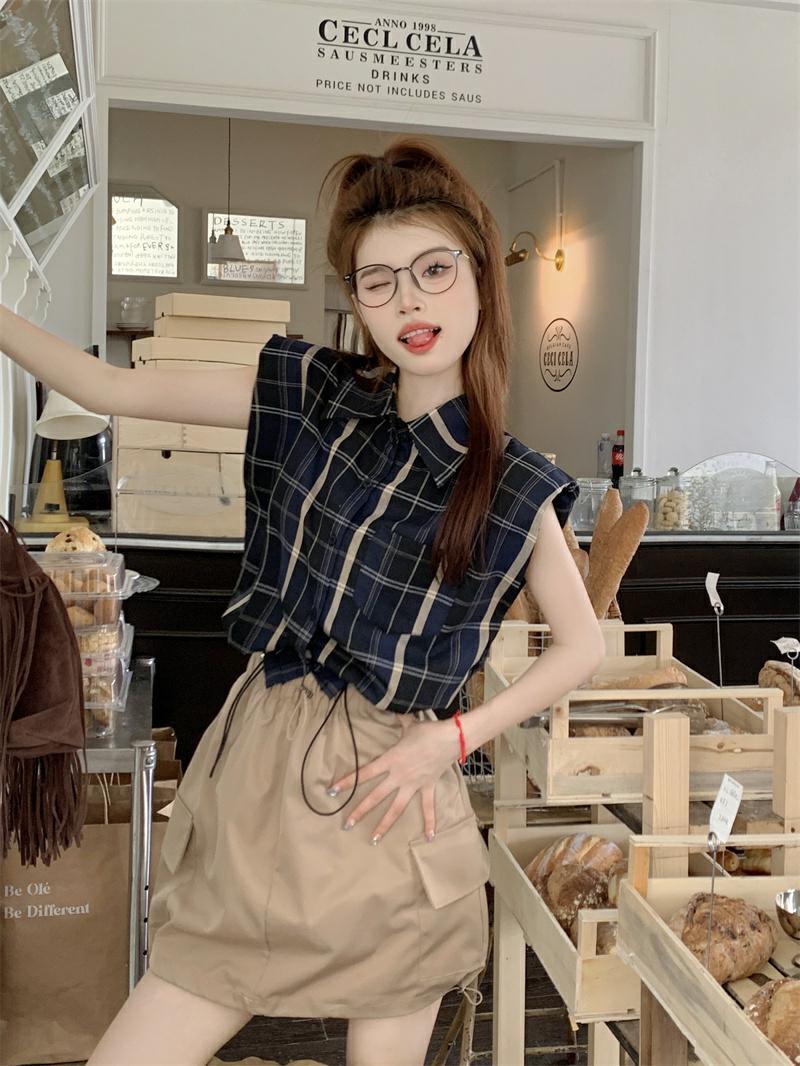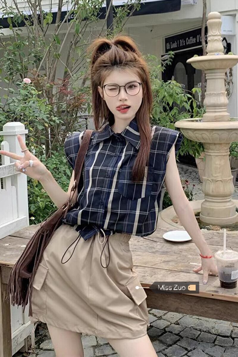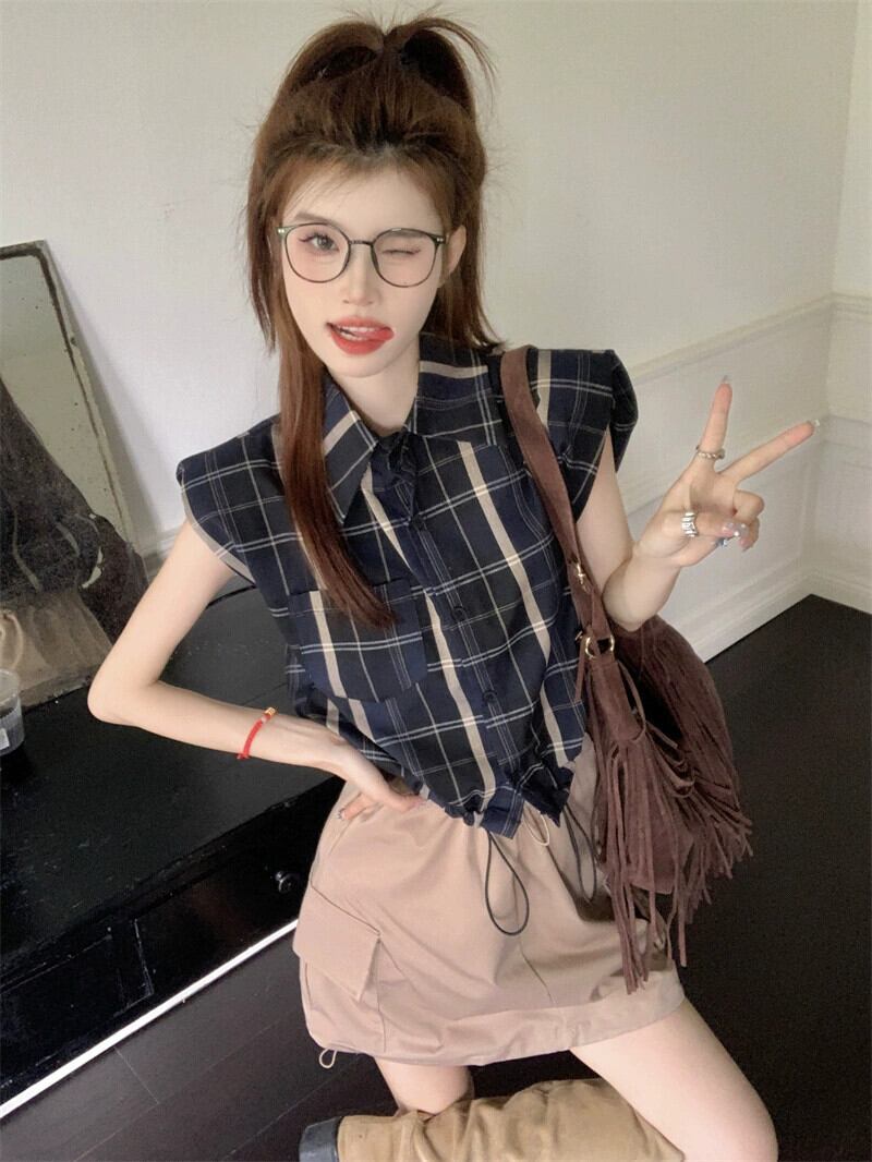 ノースリーブチェック柄シャツ女性の夏のデザインセンスニッチ 2023 新しい小さなレトロなポロカラーショートトップ サマー 夏物 8571647770142366