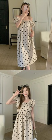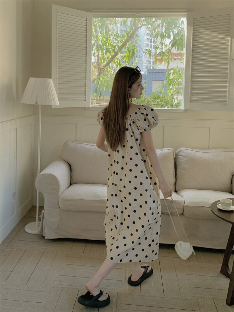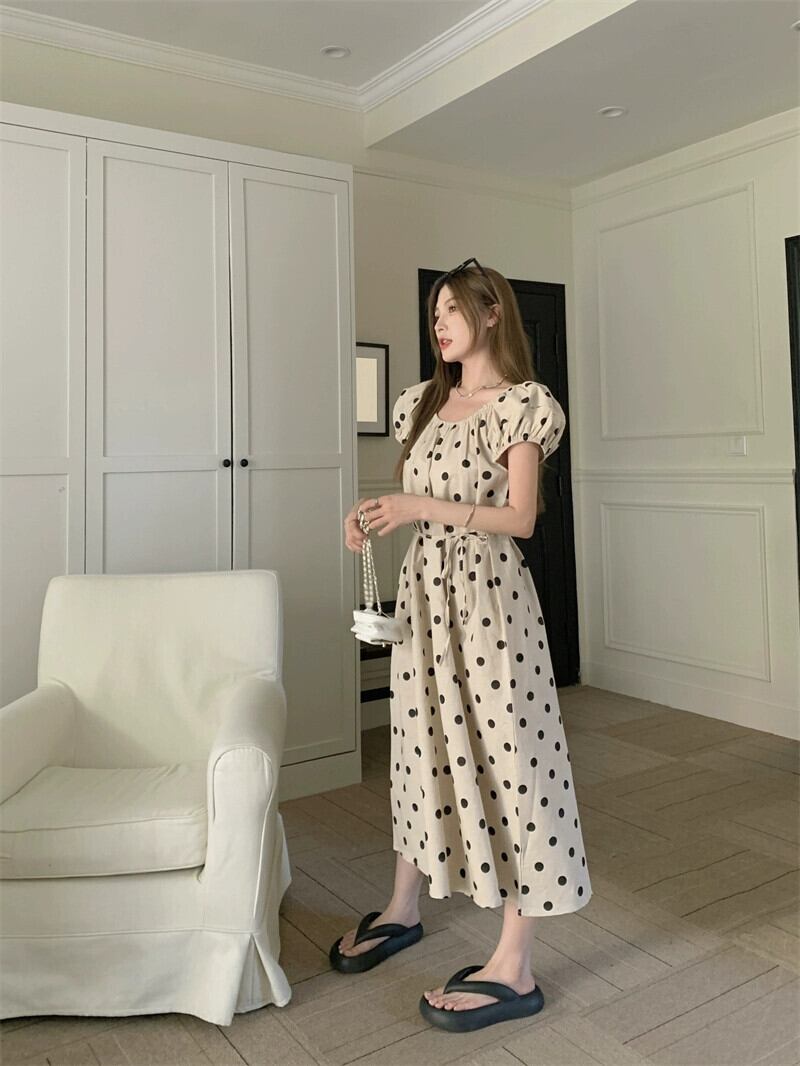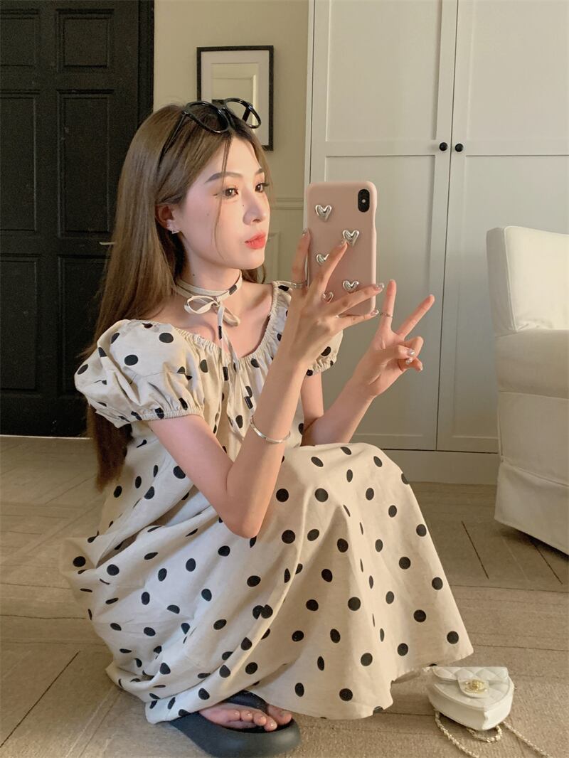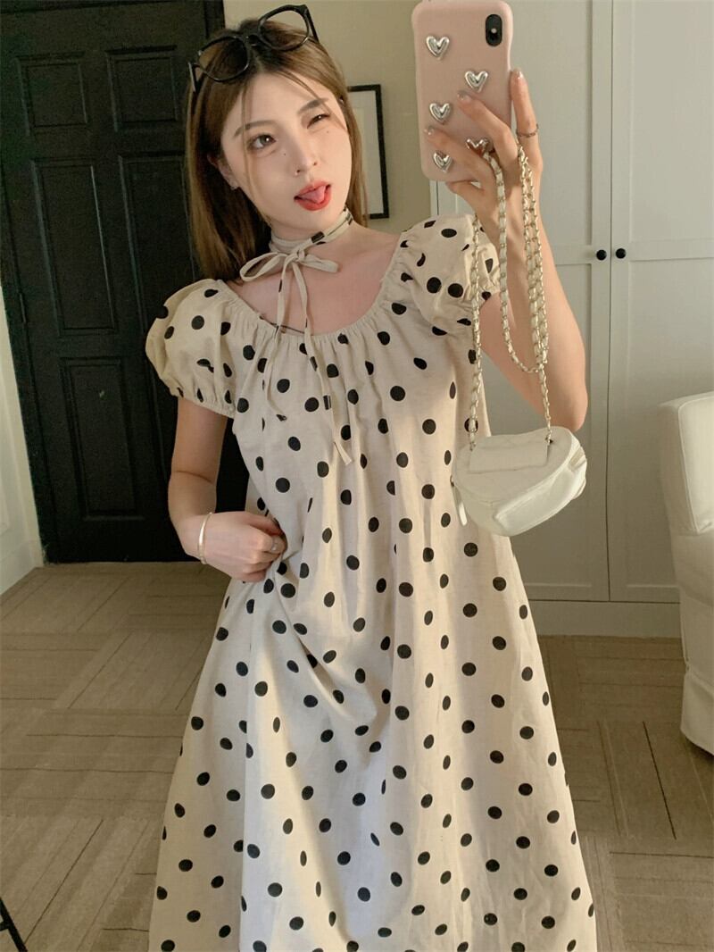パフスリーブ水玉ドレスの女性の夏の 2023 新しいレトロな優しいスタイルの気質ハイレベルルーズロングスカート サマー 夏物 8571696610676232