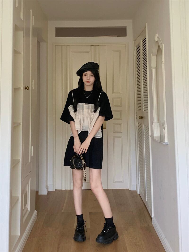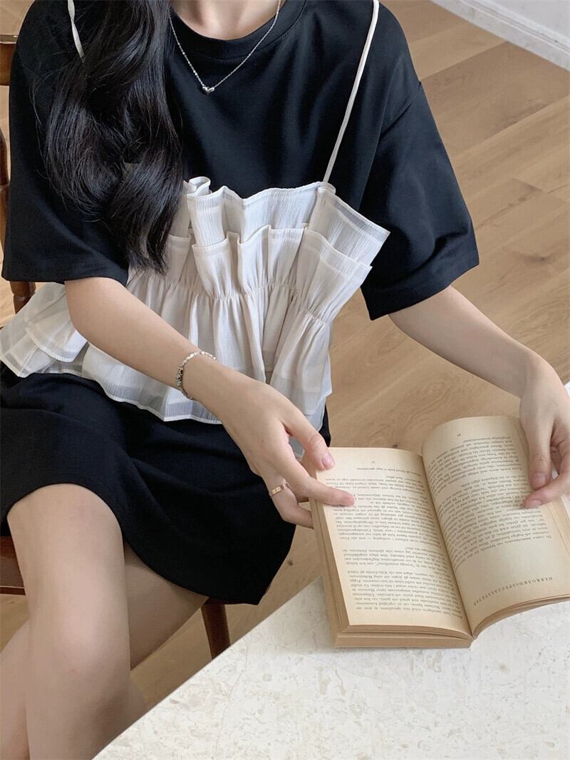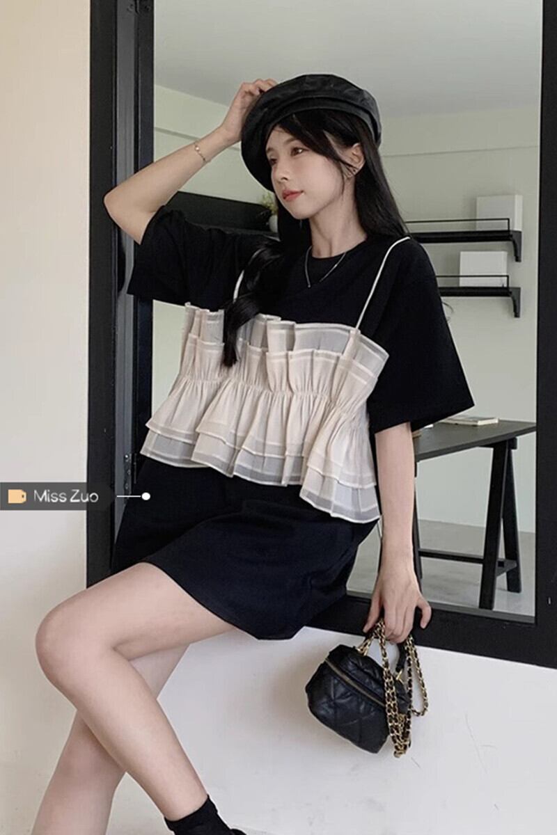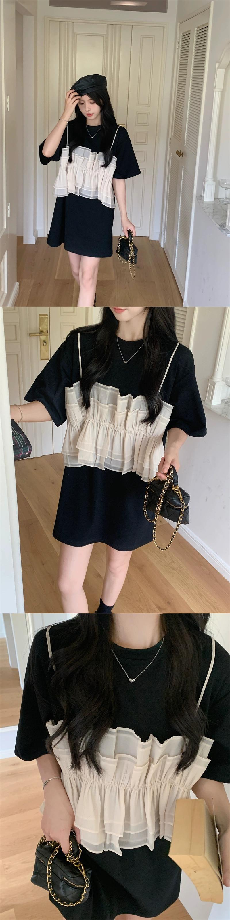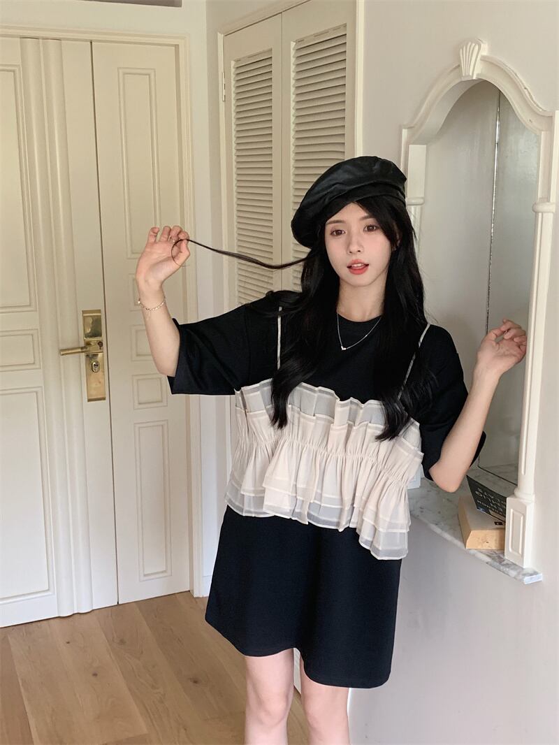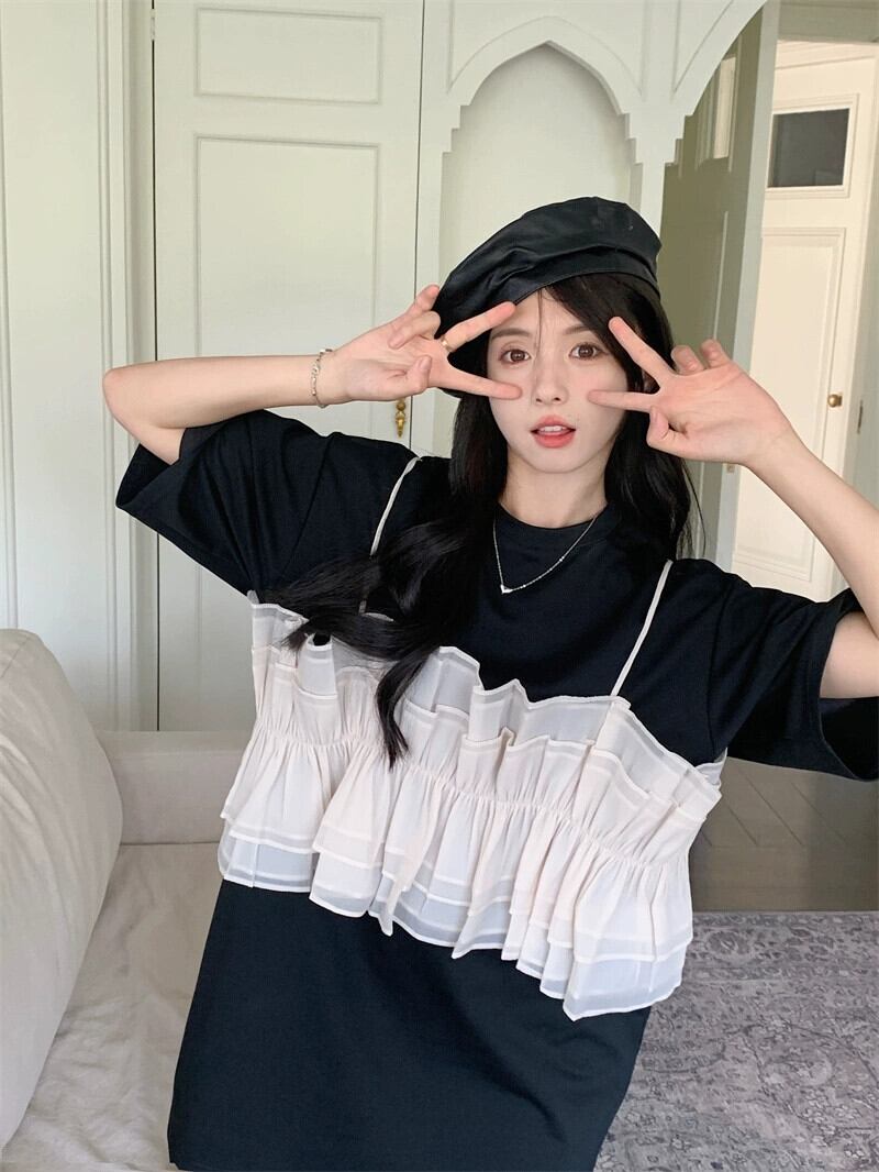 フェイク 2 枚の対照的な色の半袖 T シャツの女性の夏の新しい eign スタイル年齢を軽減するミドル丈ボトムボトム欠落フリルトップ サマー 夏物 Tシャツ 8571668984401825