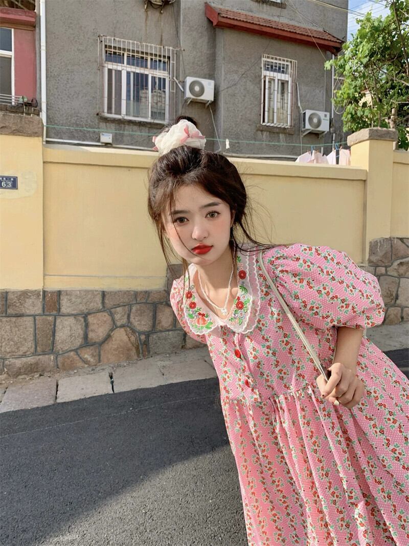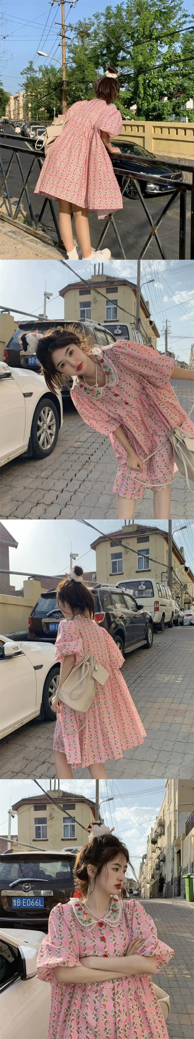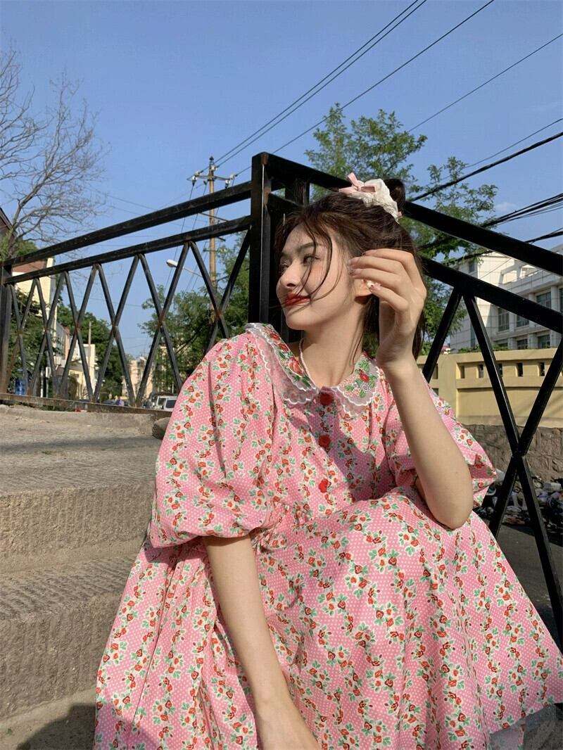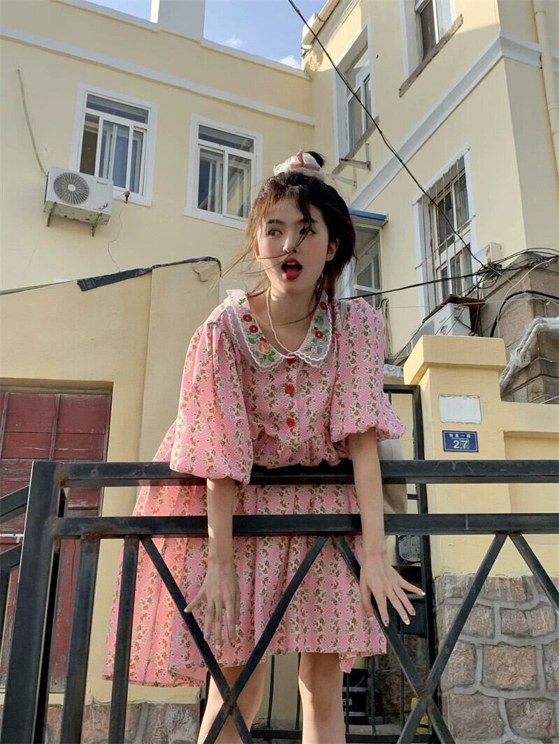 ドールカラー花柄ドレス女性の夏の 2023 新しい甘い甘いカバー腹年齢を減らす小さなパフスリーブスカート 大人ガーリー スウィート キュート カジュアル サマー 夏物 8571643787714246