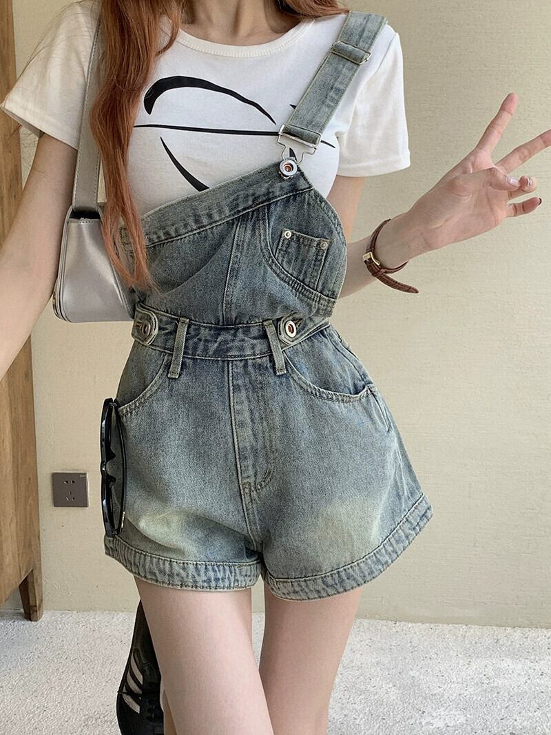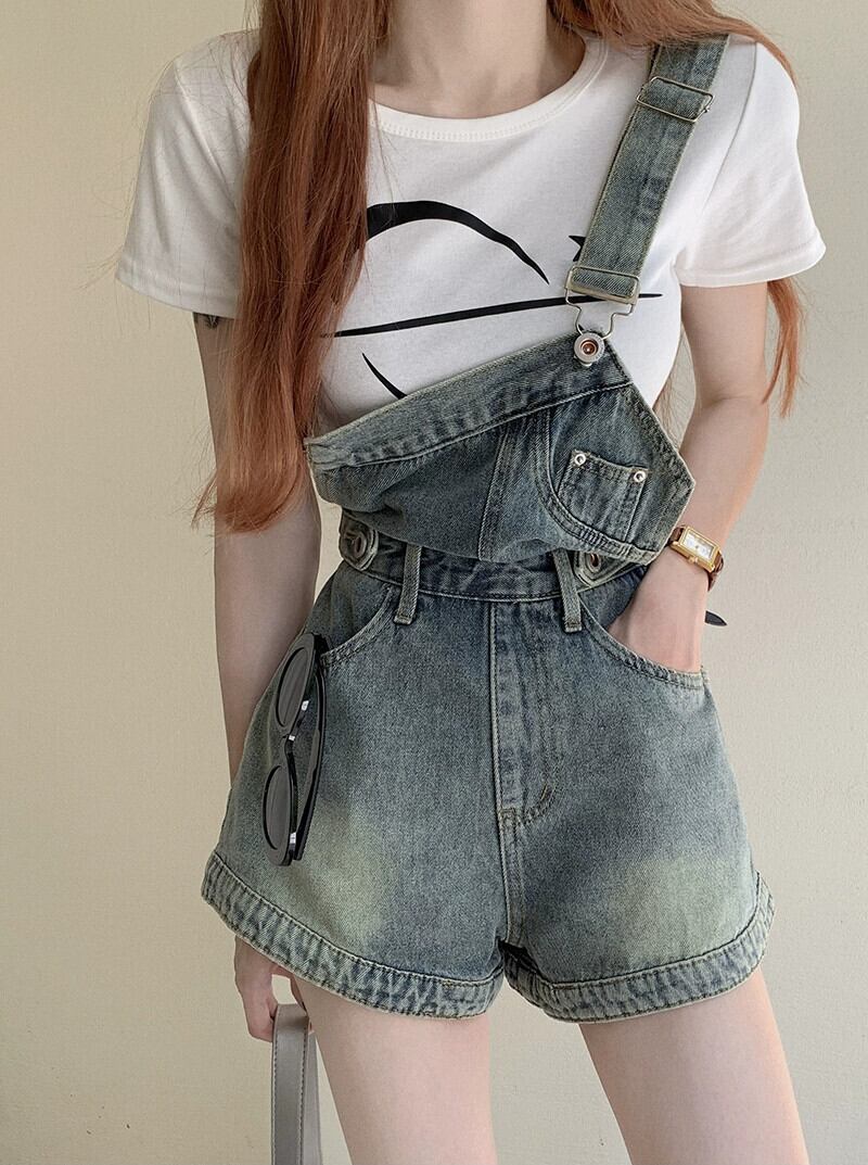 ワンショルダーストラップ デニム オーバーオール ショートパンツ レディース 夏 デザイン感 ニッチ ネット レッド 小さめ 変則ワイドパンツ サマー 夏物 ショーツ ブルマー 8571672777230434