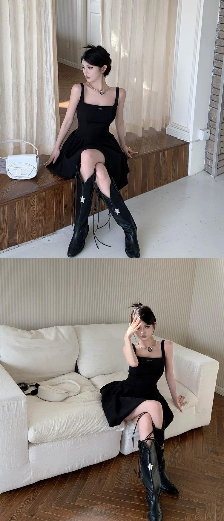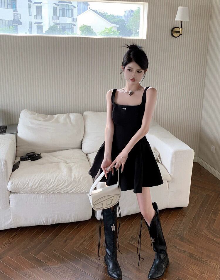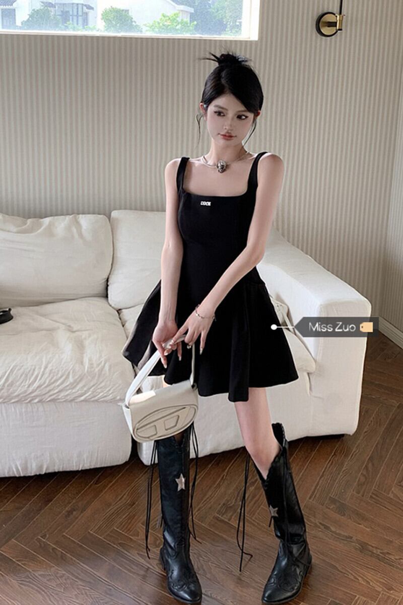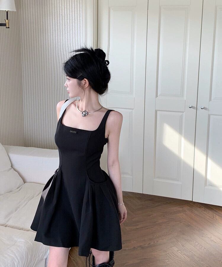 黒サスペンダードレス女性の夏フレンチヘップバーンスタイルリトルブラックドレス小さなウエスト痩身ショートスカート サマー 夏物 8571678252837237
