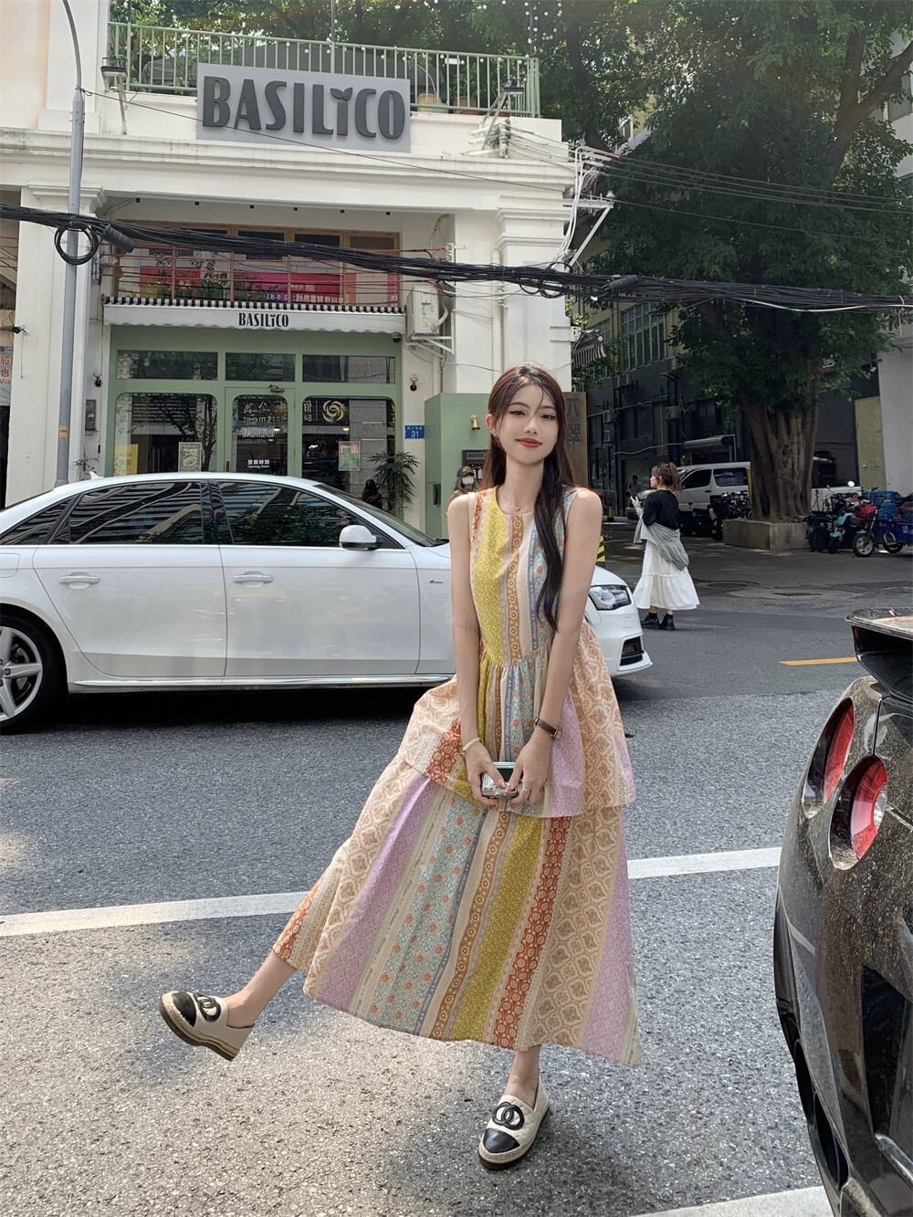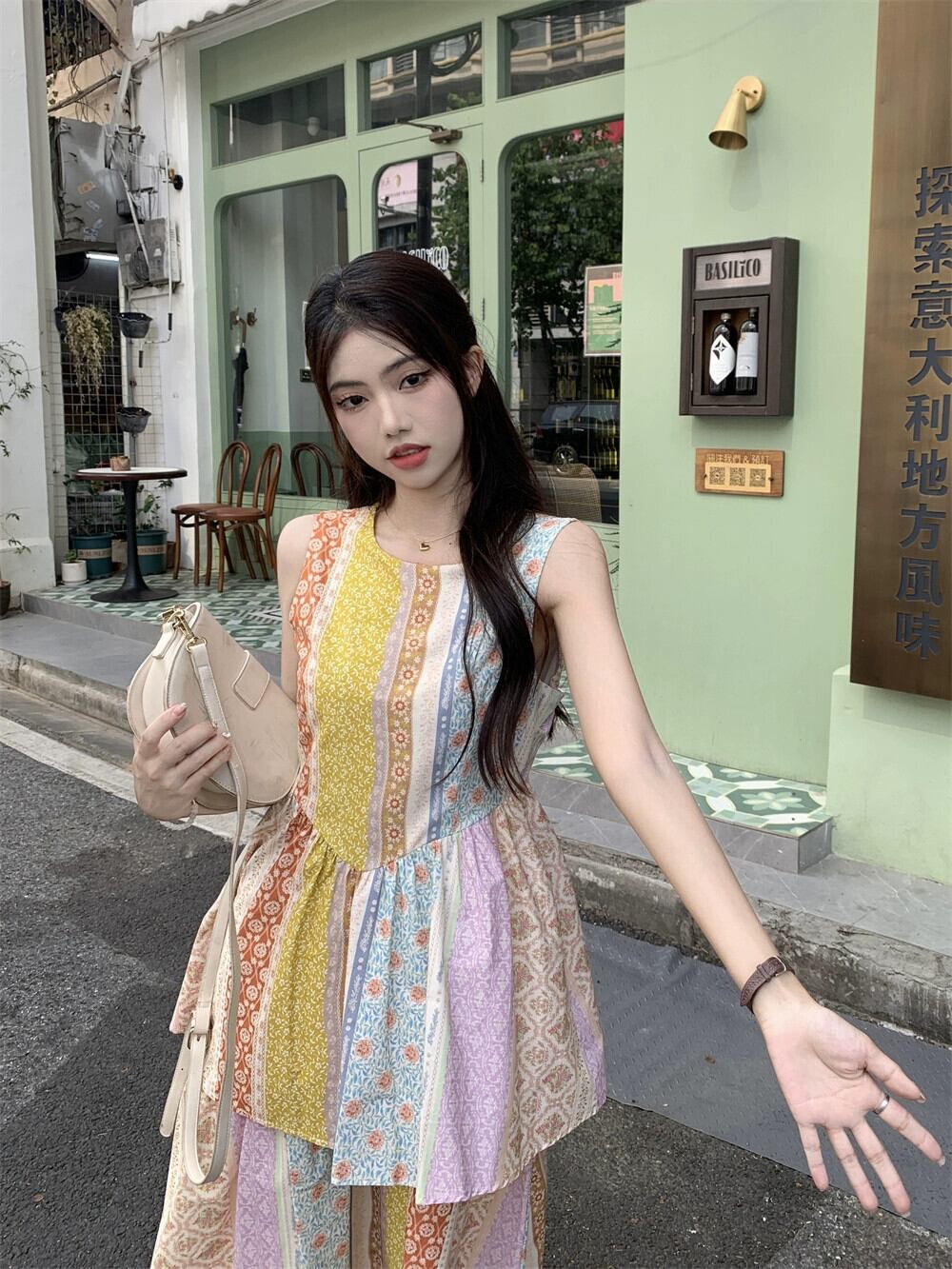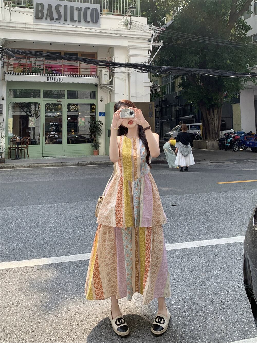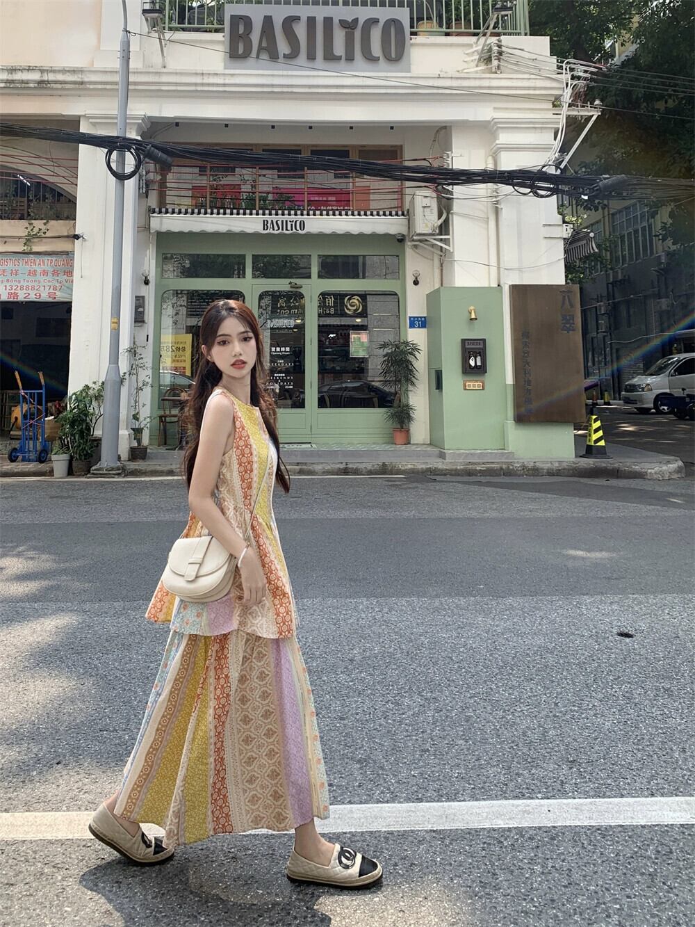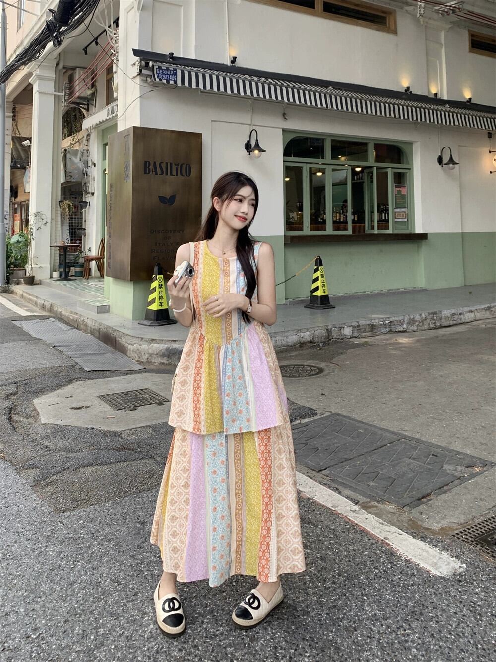 ステッチフェイクツーピース花柄ドレス女性の夏の新しいフレンチレトロロマンチックな摩耗ノースリーブホリデーロングスカート サマー 夏物 8571618108216999