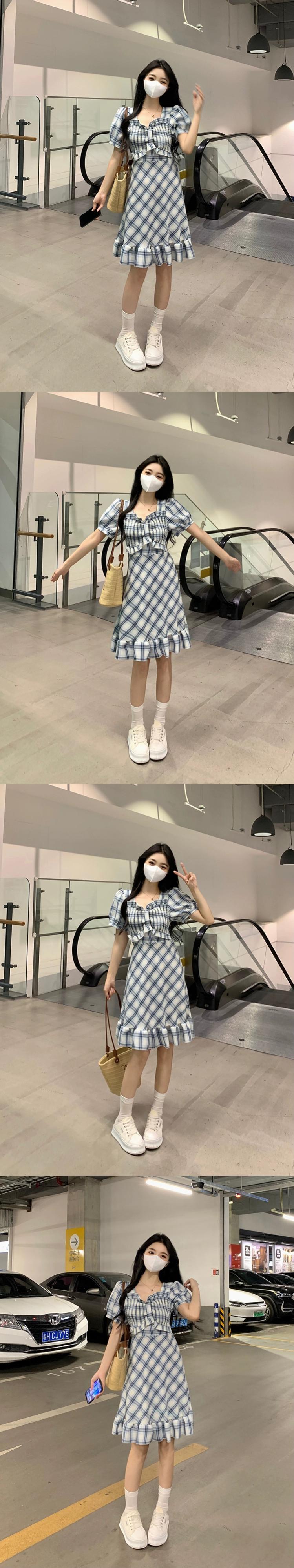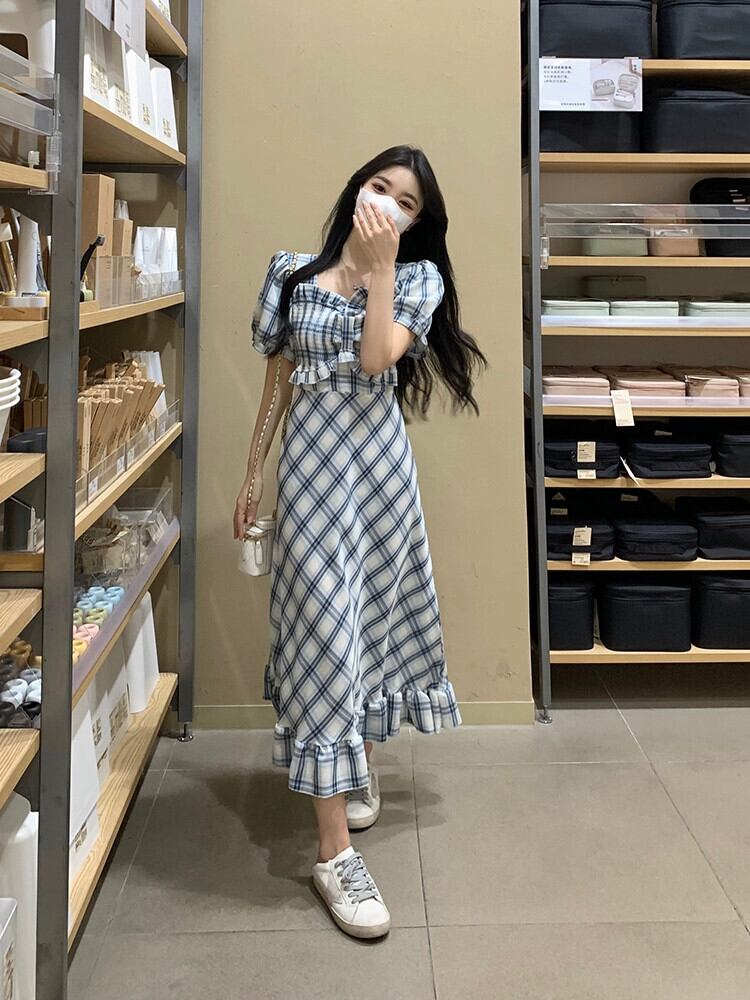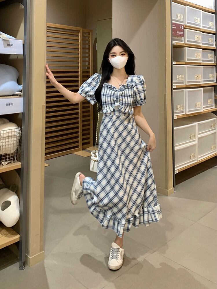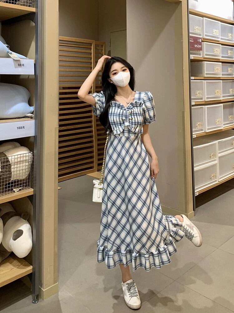 私室ハニーチェック柄ドレス女性の夏 2023 新しいフレンチスタイル優しいスタイルの気質スクエアカラー蓮の葉エッジロングスカート サマー 夏物 スクウェア 8571676334758605