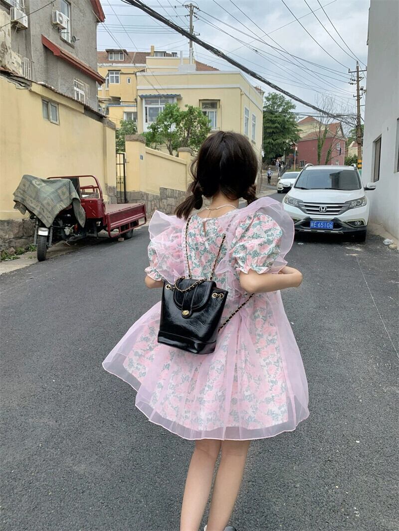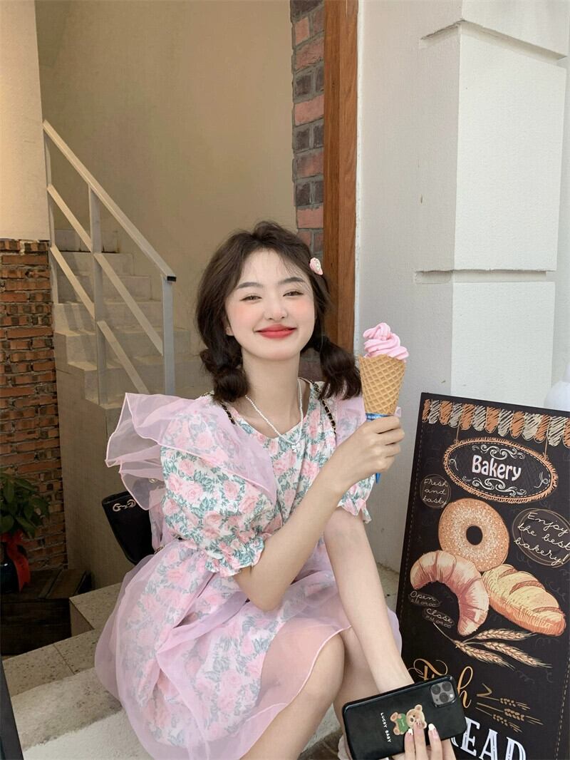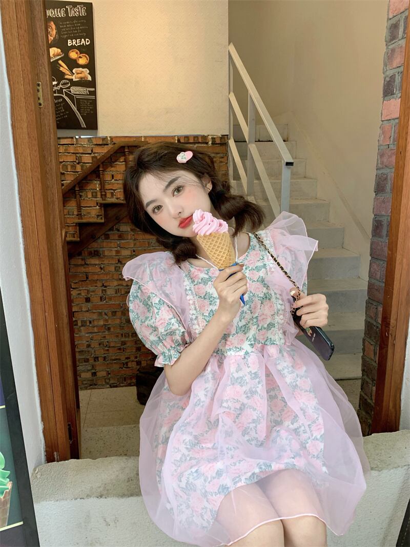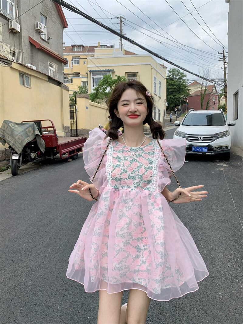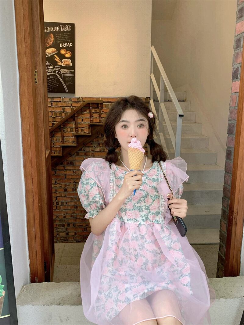 重工業花柄ドレス女性の夏ニッチセンスステッチメッシュ甘い西洋スタイル小さなふくらみスカート 大人ガーリー スウィート キュート カジュアル サマー 夏物 857164427771322