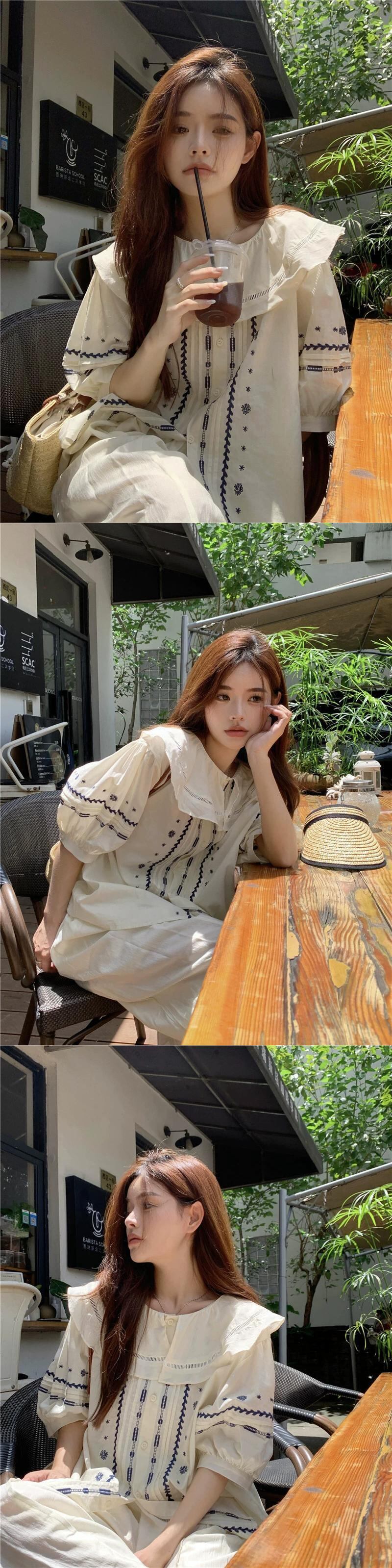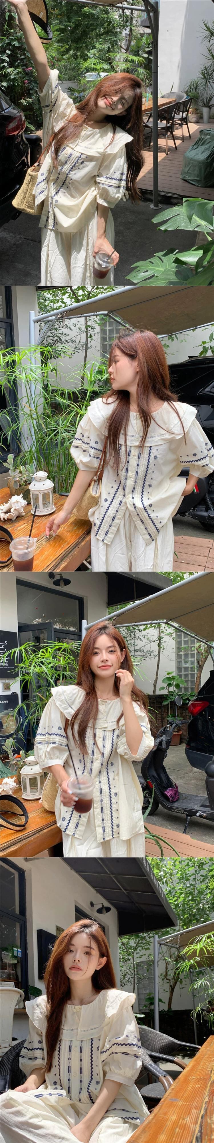 ドールカラー半袖シャツレディース夏デザインセンスニッチ2023新重工業刺繍優しいパフスリーブトップ サマー 夏物 857166879735499