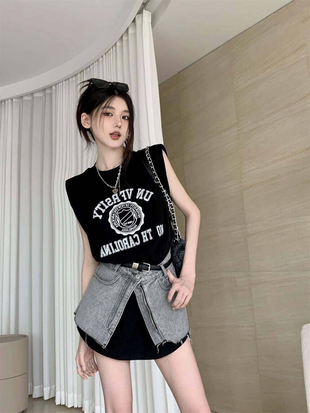 黒ノースリーブ Tシャツベスト女性の夏 2023 新しい香港スタイルのレトロシックなプリントミッドレングスショルダーパッドトップ ブラック サマー 夏物 8571684324721154