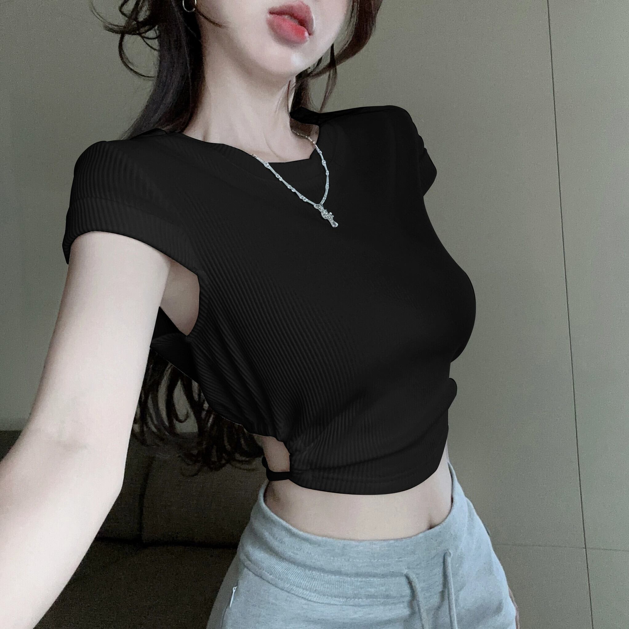 ウエストレス陰謀ストラップショートトップ女性の夏のデザイン純粋な欲望セクシーな黒フロントショルダー半袖 Tシャツ ブラック サマー 夏物 ピュア 8571660270677987