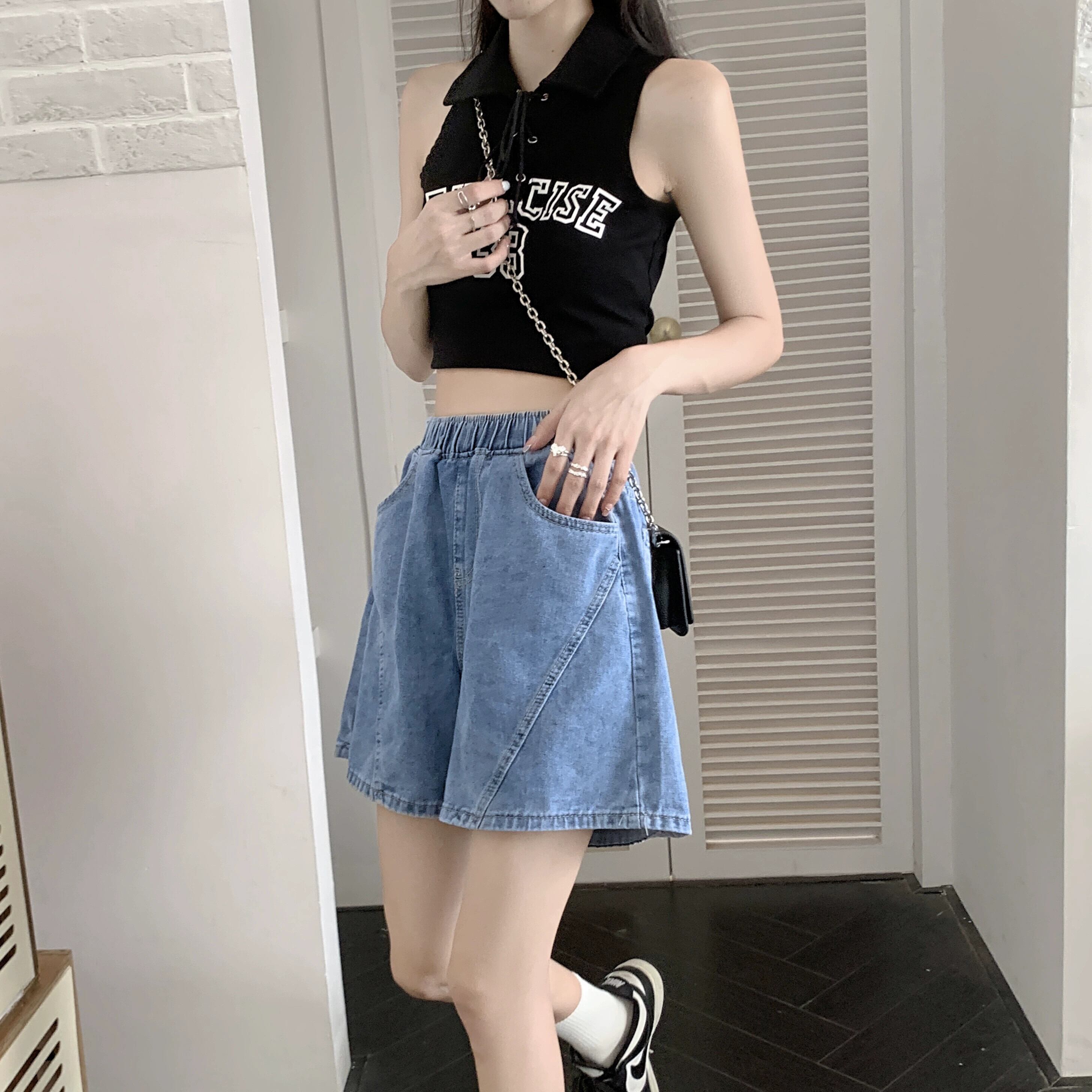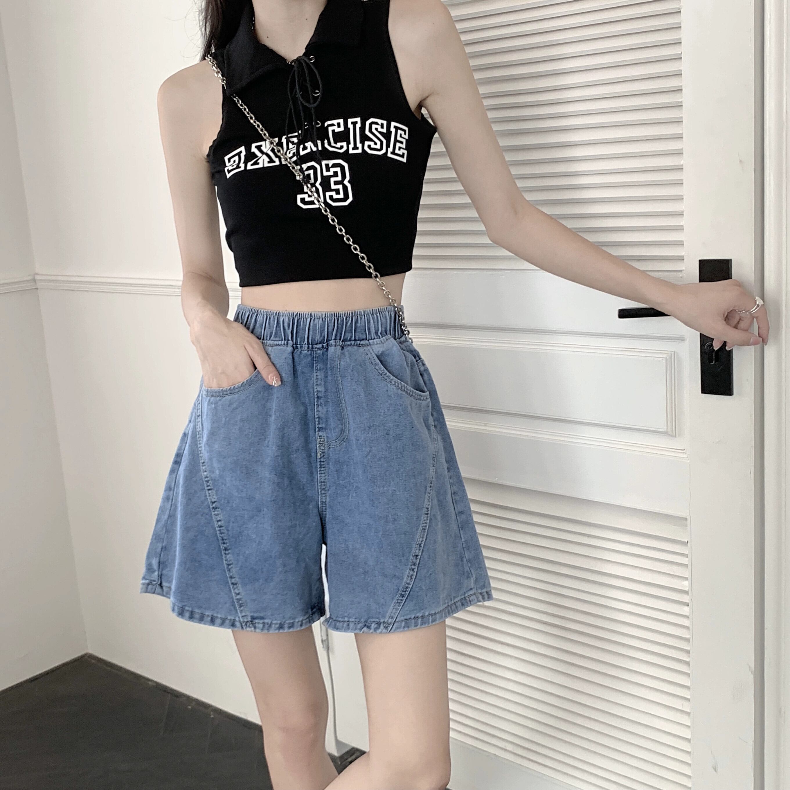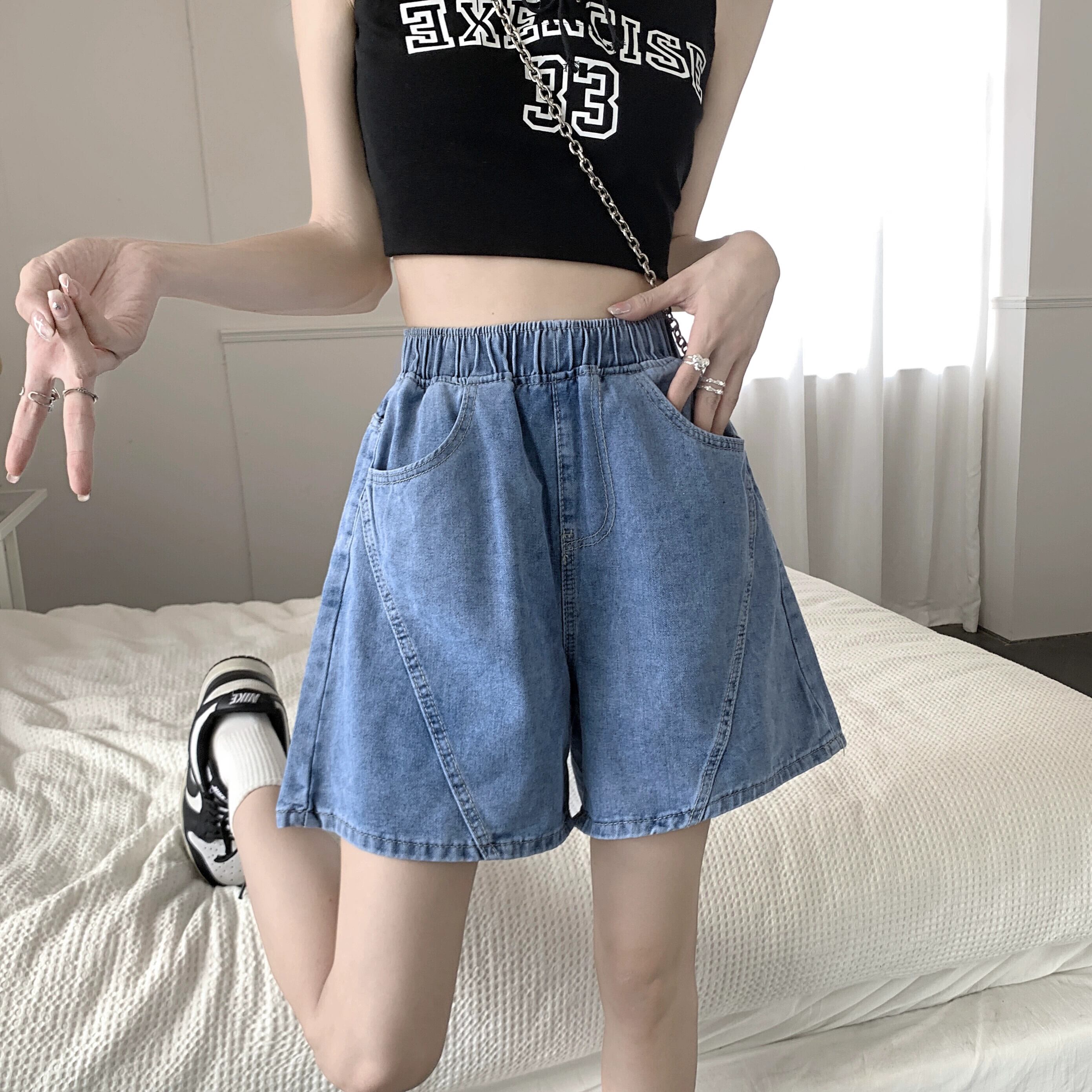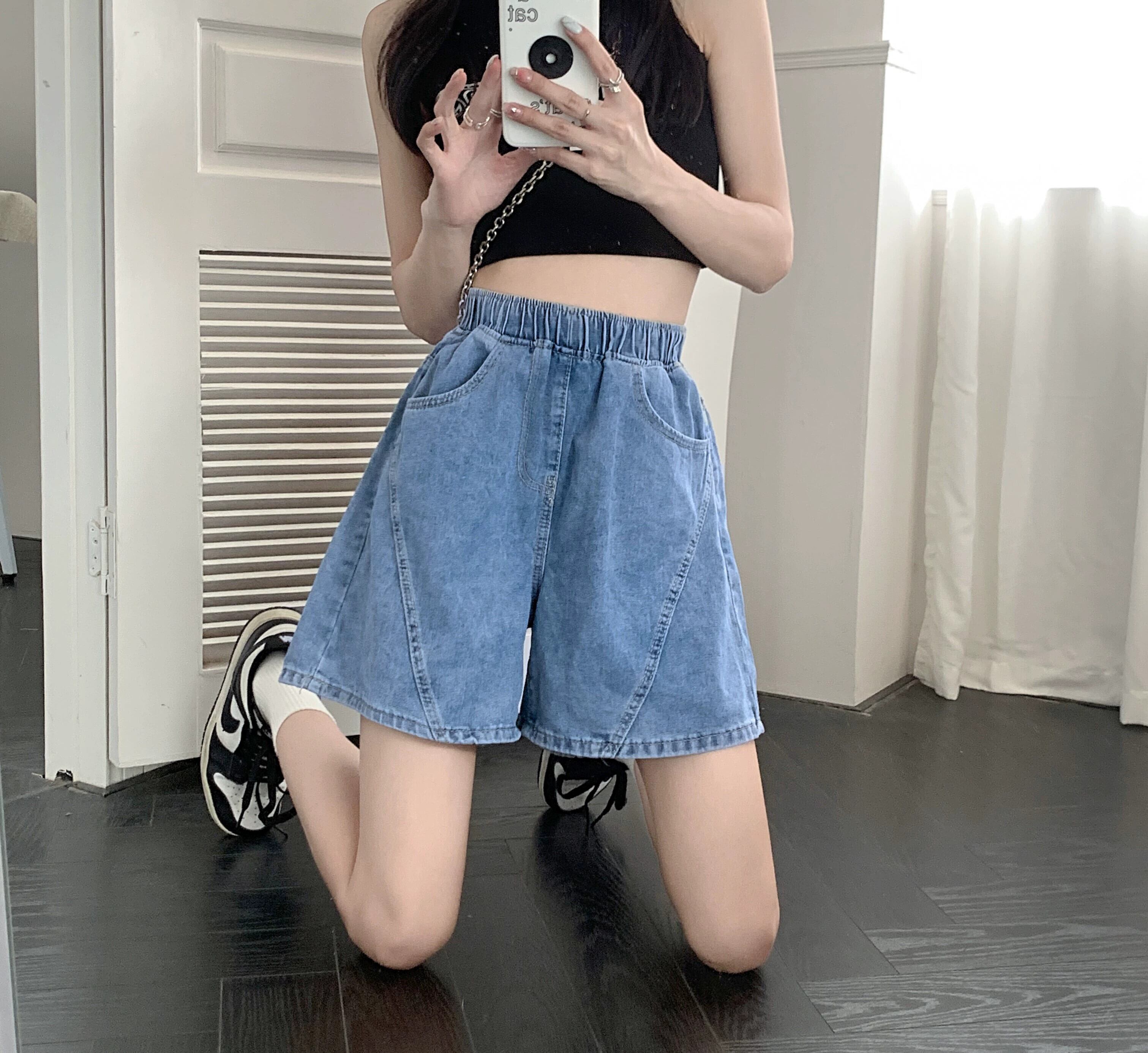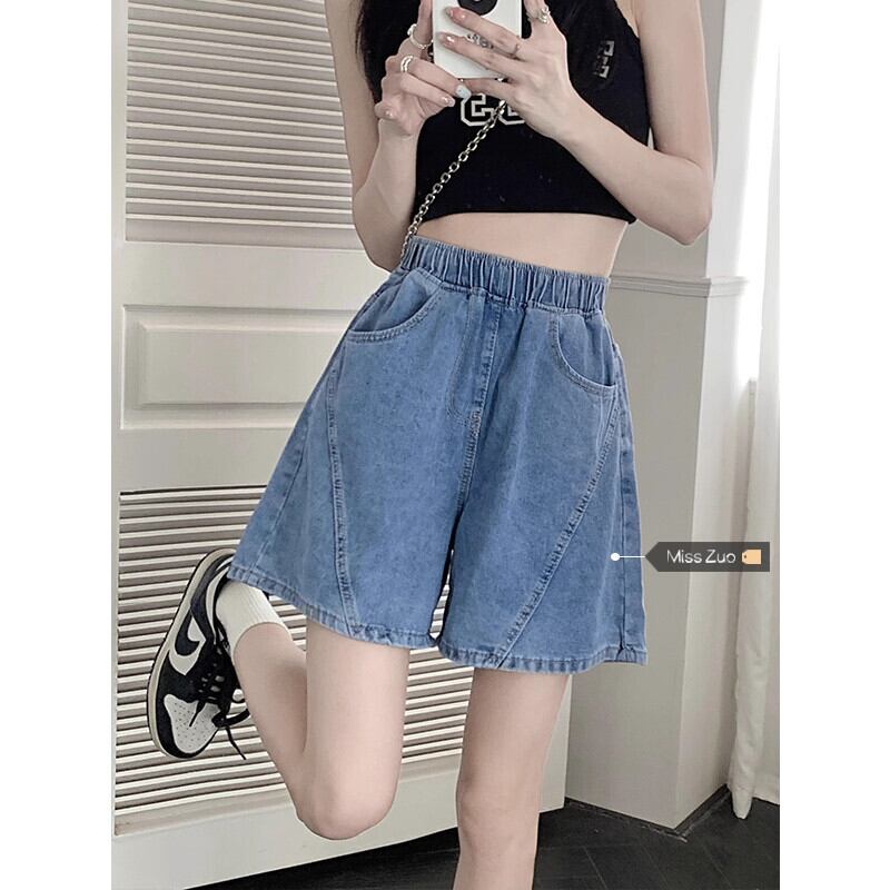 デニムショートパンツの女性の夏のAラインパンツ2023新しい小さな梨型の図ハイウエストルーズワイドレッグパンツ ハイウェスト サマー 夏物 ショーツ ブルマー 8571677600545034