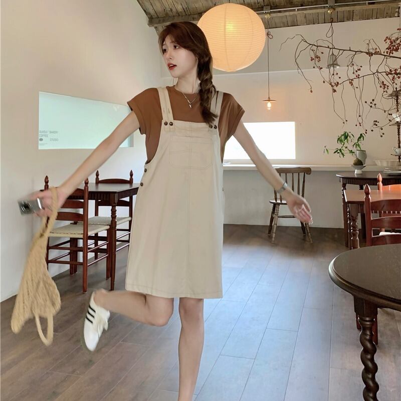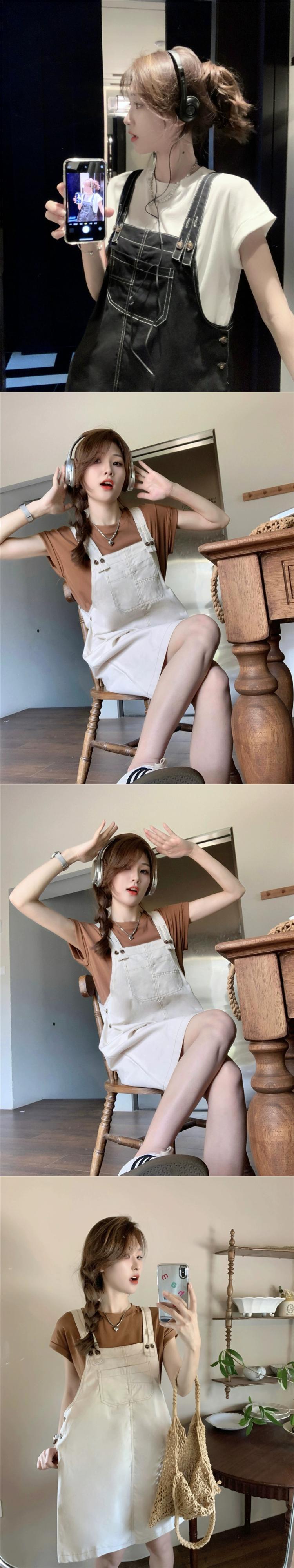 色:白いTシャツ,コーヒーTシャツ,ブラックストラップドレス,アプリコットストラップドレス