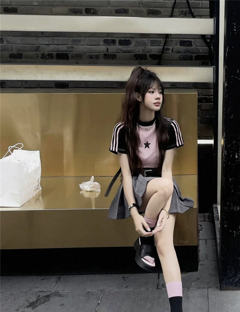 配色ラグランショルダー半袖Tシャツレディース2023年夏新作アメリカンスタイルレトロ小さいスリムショートトップ サマー 夏物 8571656216271724