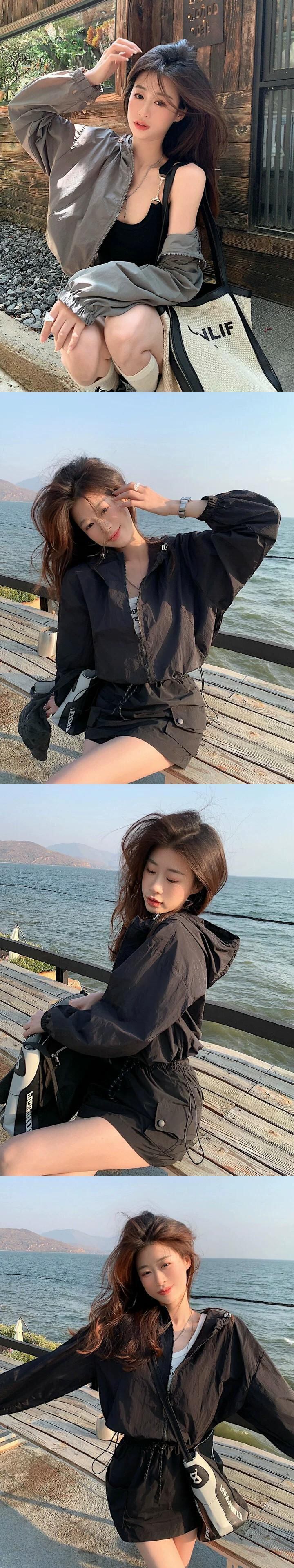 グレーのフード付き日焼け止め女性の夏の薄いセクション UV 保護 2023 新しいカジュアルオールマッチショートジャケットコート サマー 夏物 85716656491377