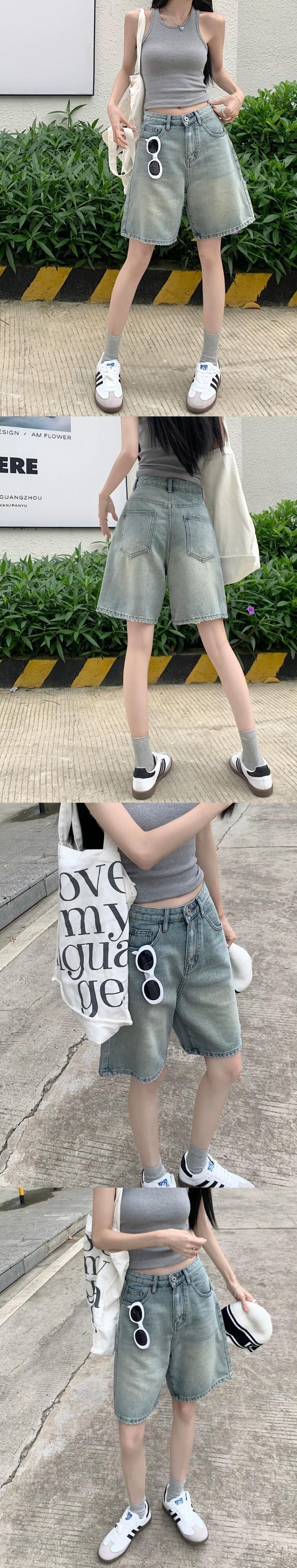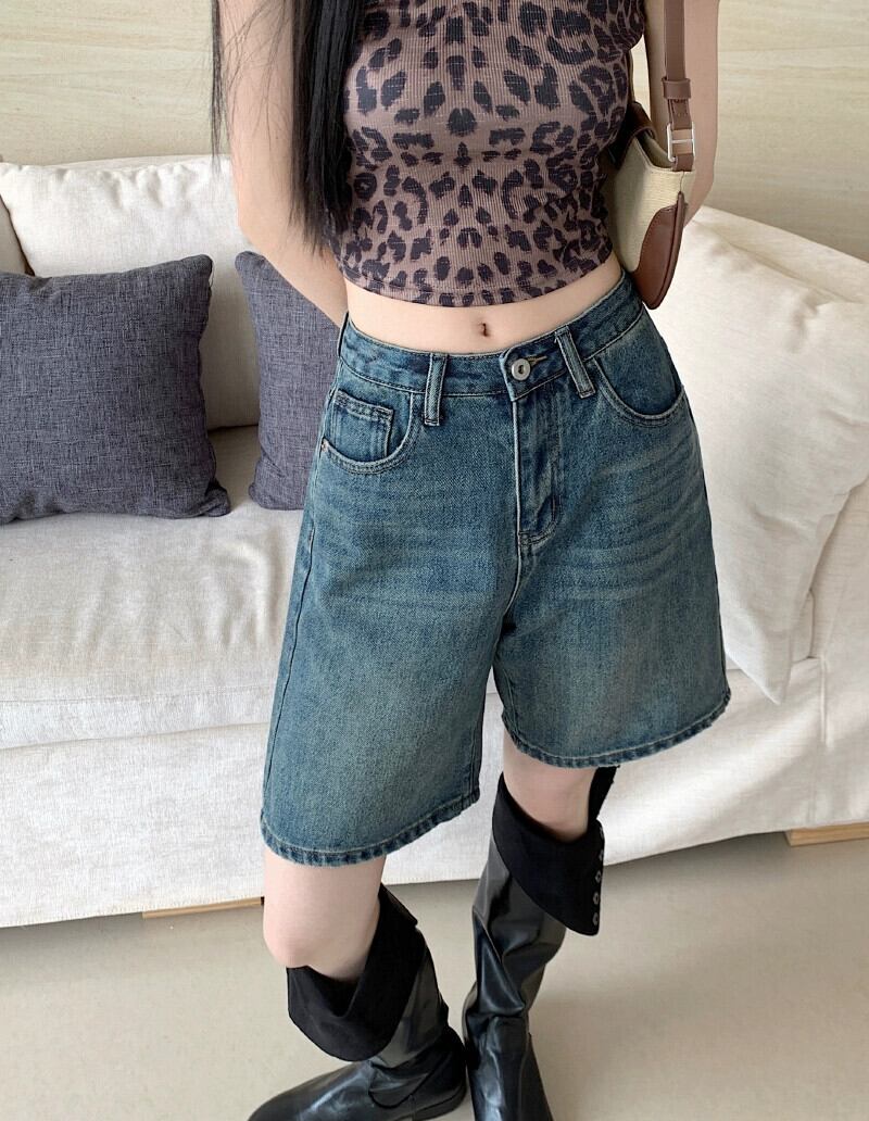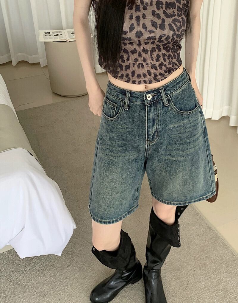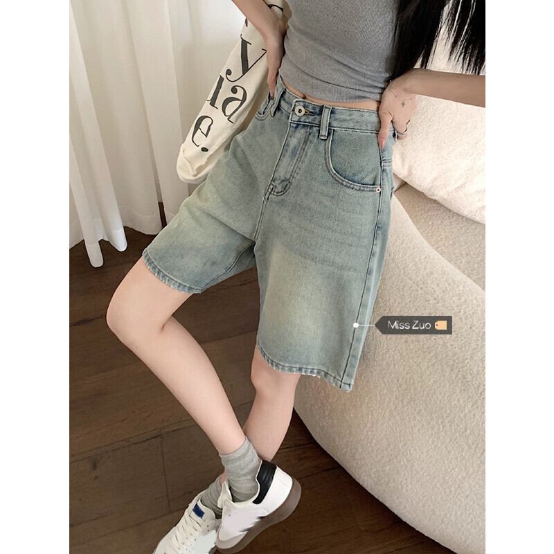 ライトブルーデニムショートパンツレディース夏アメリカンレトロ5点パンツ小さい背が高くウエストゆったりストレートワイドレッグパンツ サマー 夏物 ショーツ ブルマー 8571687823573777