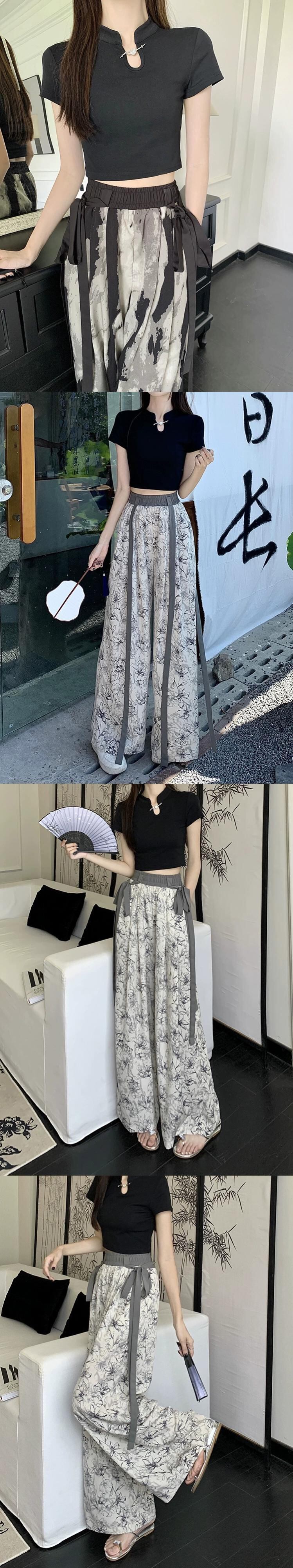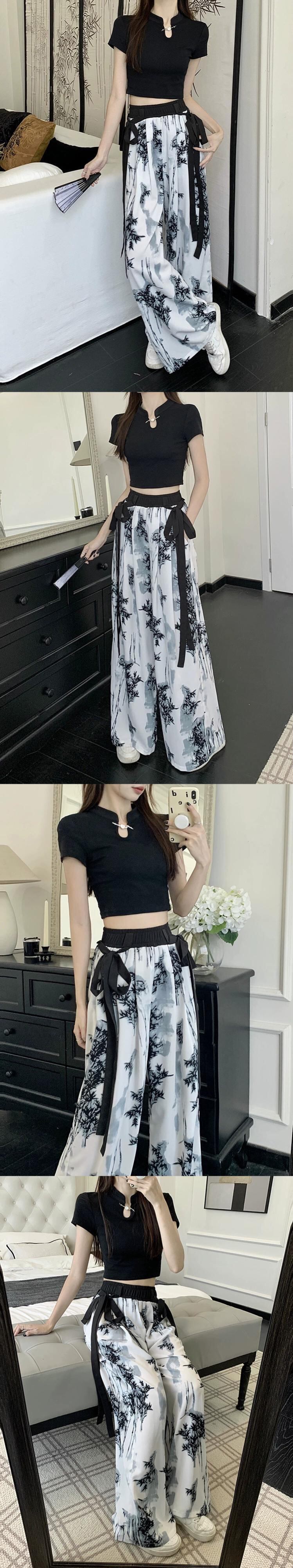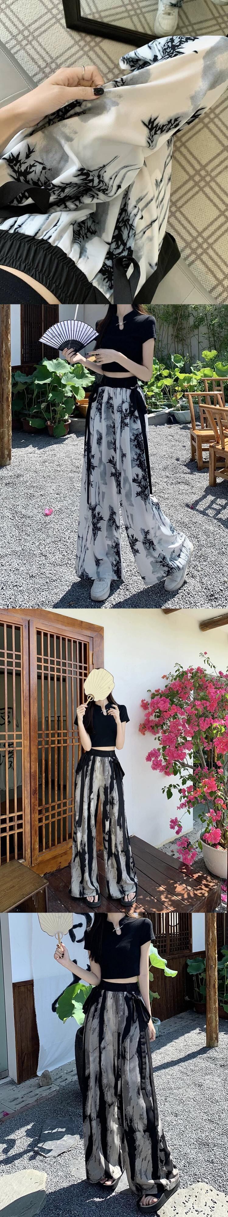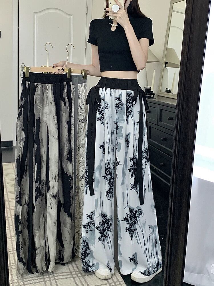 中国風国民風水墨画ワイドレッグパンツ女性の夏の薄いセクションハイウエストドレープストレートルーズカジュアルモップパンツ ハイウェスト サマー 夏物 8571640456916467