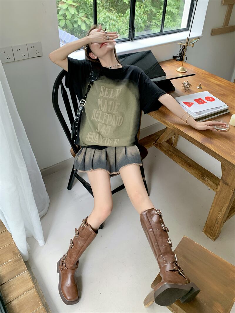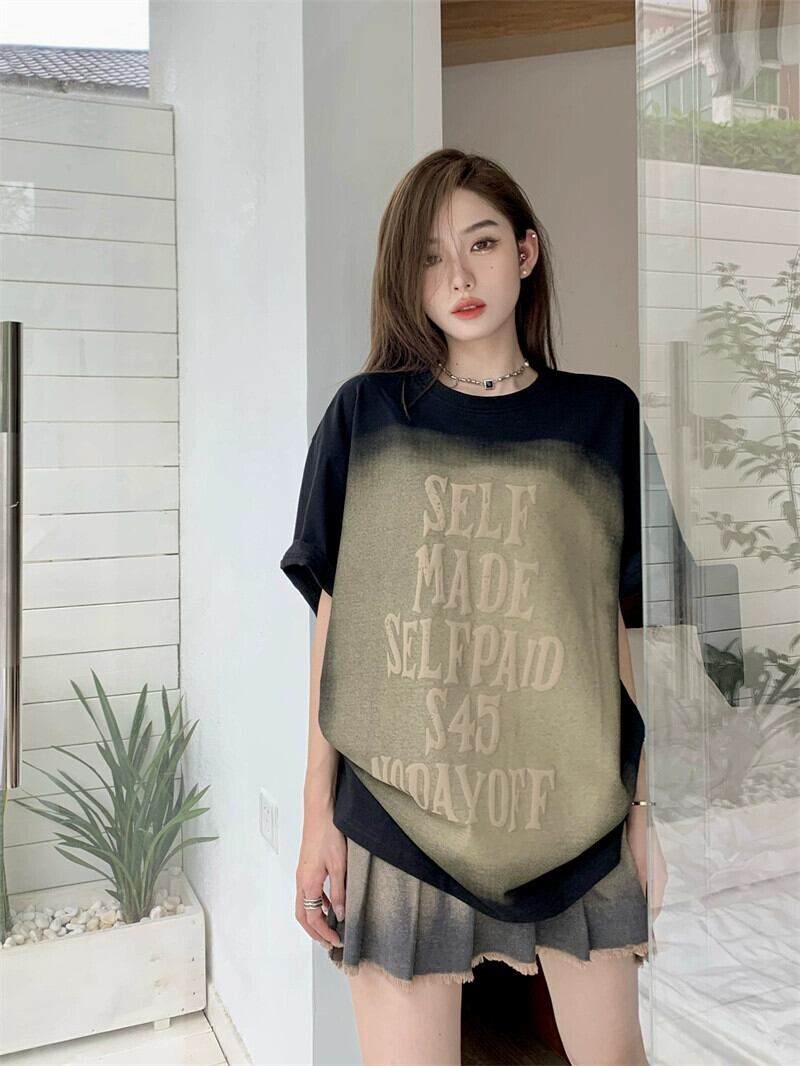 コントラストカラープリント半袖Tシャツレディース2023年夏新作アメリカンレトロニッチルーズハイエンドトレンディブランドトップ サマー 夏物 8571627335335870