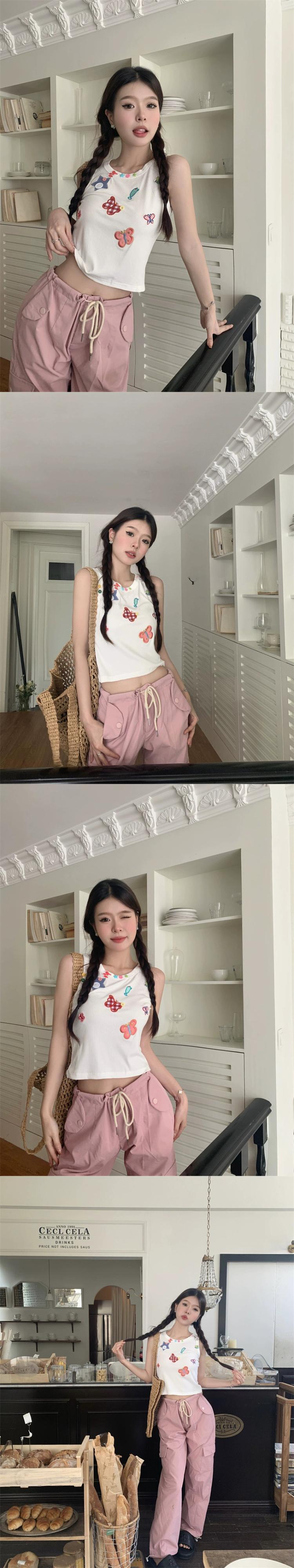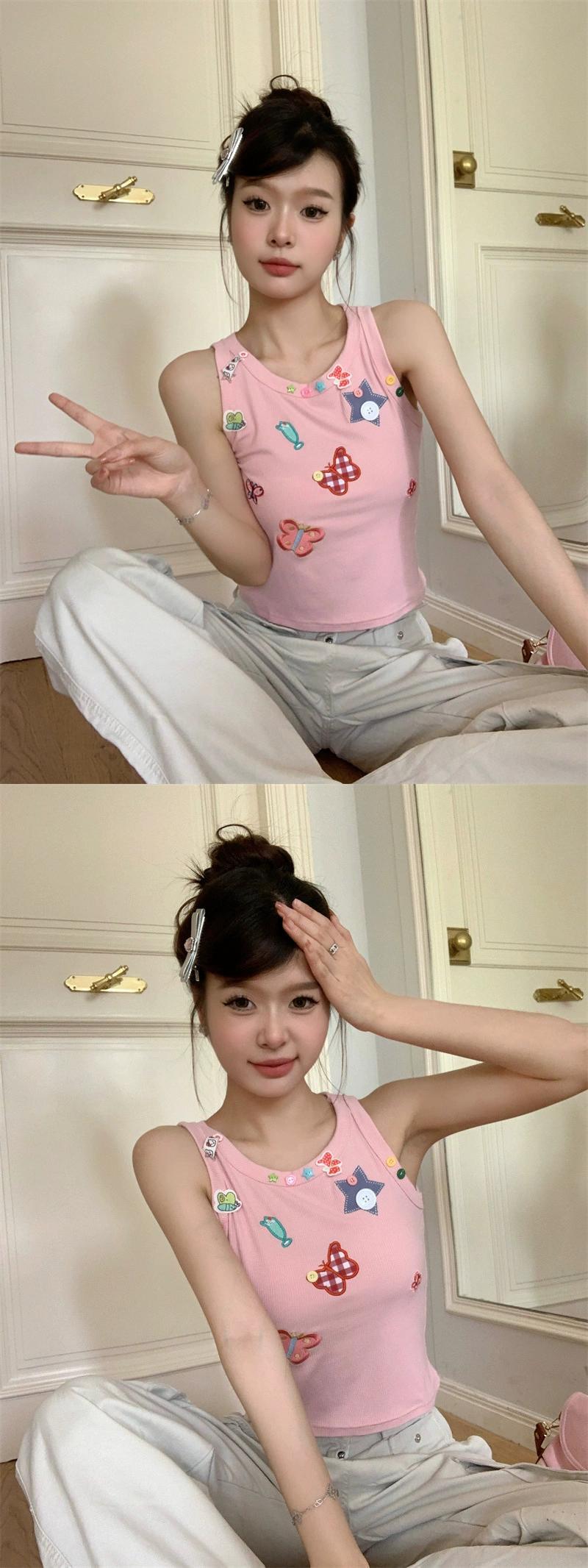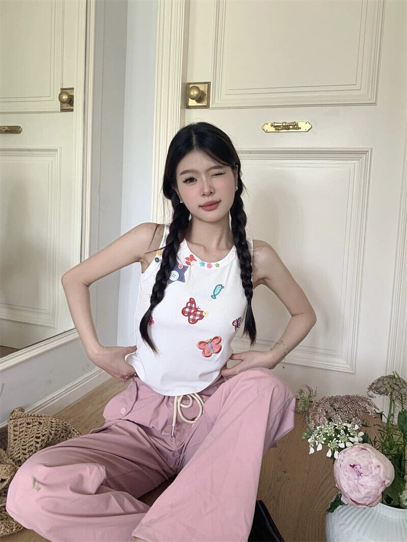 ドーパミン着用キャミソールレディースアウター夏蝶刺繍甘い小さなトップスショートノースリーブボトムス 半袖 ハーフスリーブ 大人ガーリー スウィート キュート カジュアル サマー 夏物 8571657144501840