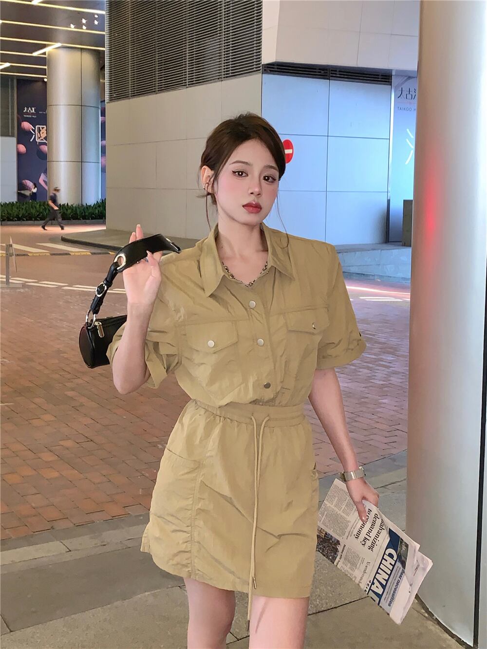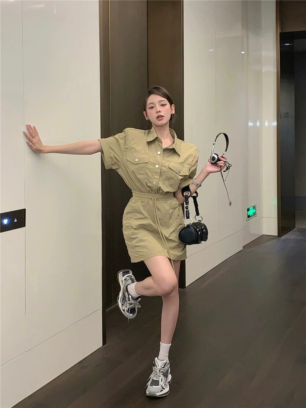 カーキツーリングドレス女性の夏の新しい香港スタイルのレトロな気質巾着ウエスト痩身ショートスカート サマー 夏物 8571629748931178