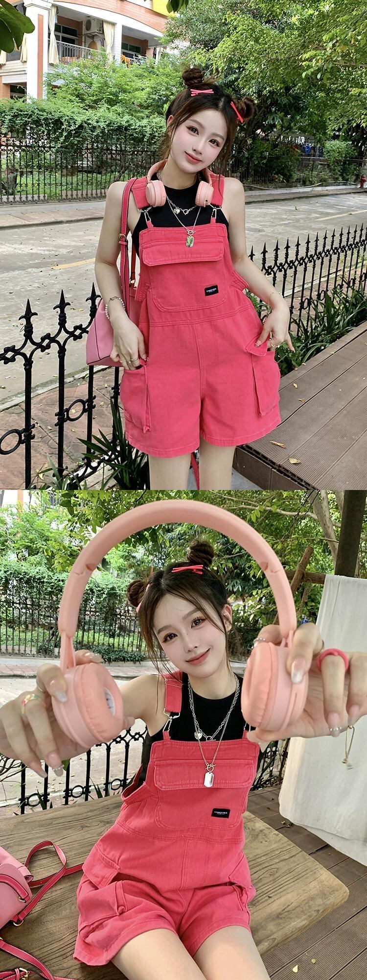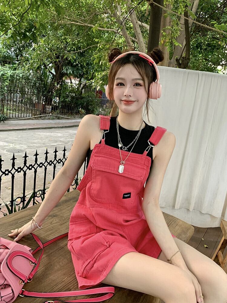 ローズレッドデニムサスペンダーショーツ女性の2023年夏の新しいドーパミンウェアと小さな年齢を減らすワイドレッグパンツ サマー 夏物 ブルマー 8571643648230308