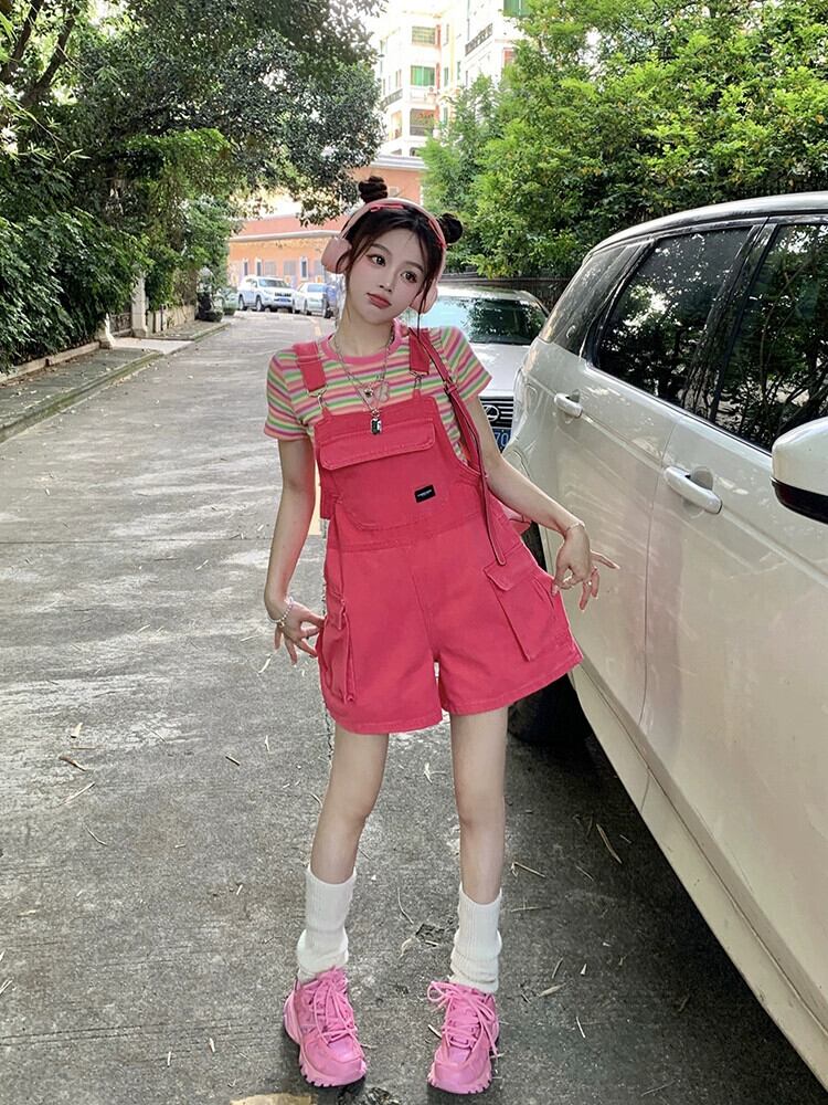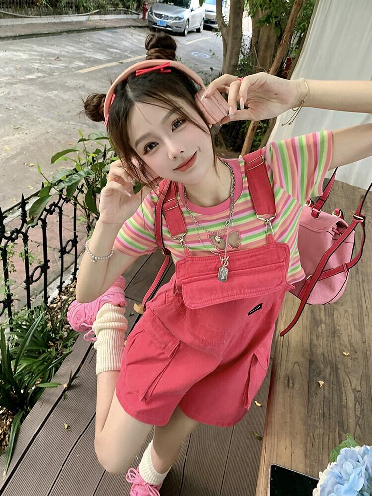 色:緑とピンクのストライプのTシャツ,ローズレッドのサスペンダーショーツ