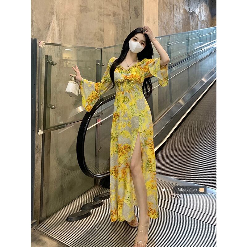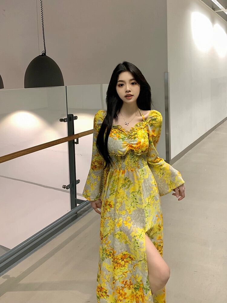 黄色のジャージープリントドレス女性の夏の気質高級感美しい海辺の休暇ビーチスリットロングスカート サマー 夏物 8571631839016474