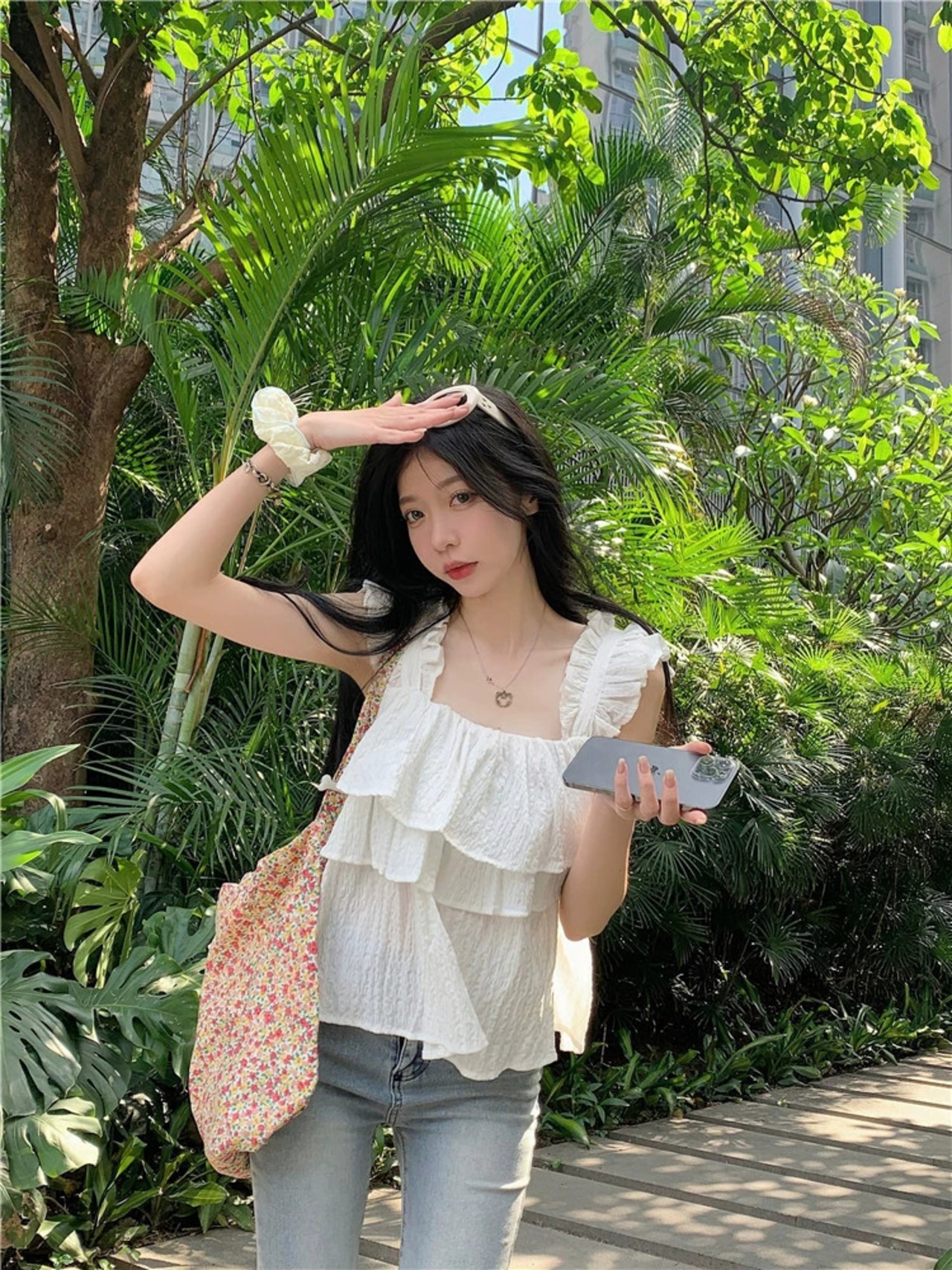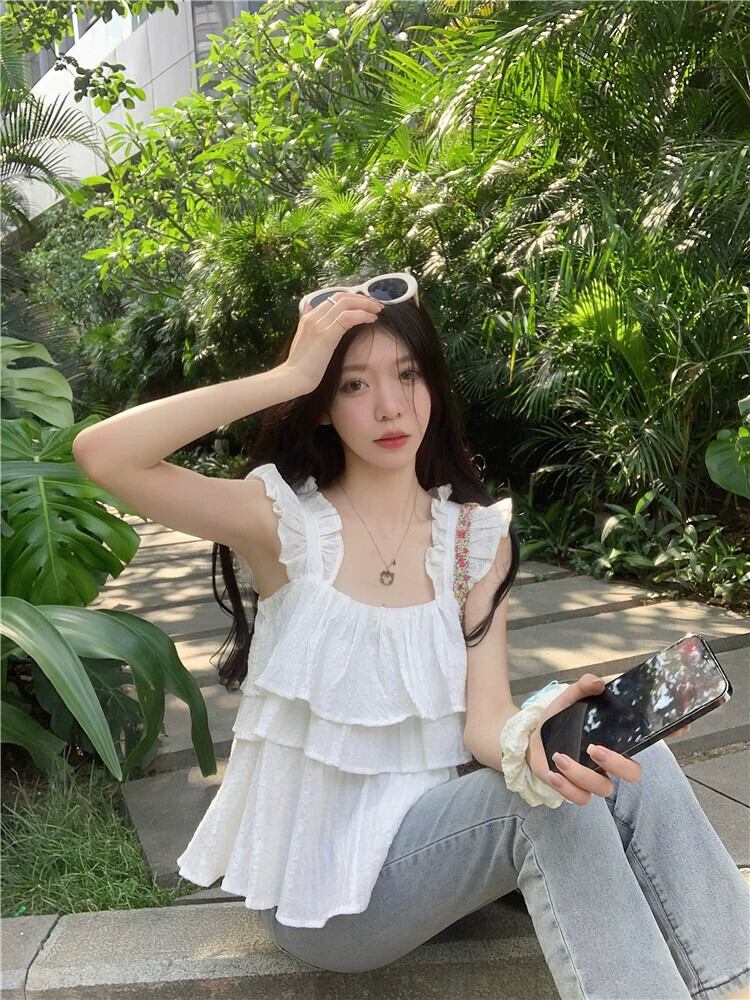 Xiaofei スリーブスクエアカラートップ女性の夏 2023 新しい甘い eign スタイル年齢削減カバー腹フリル黒シャツ ブラック 大人ガーリー スウィート キュート カジュアル サマー 夏物 スクウェア 8571627459186948