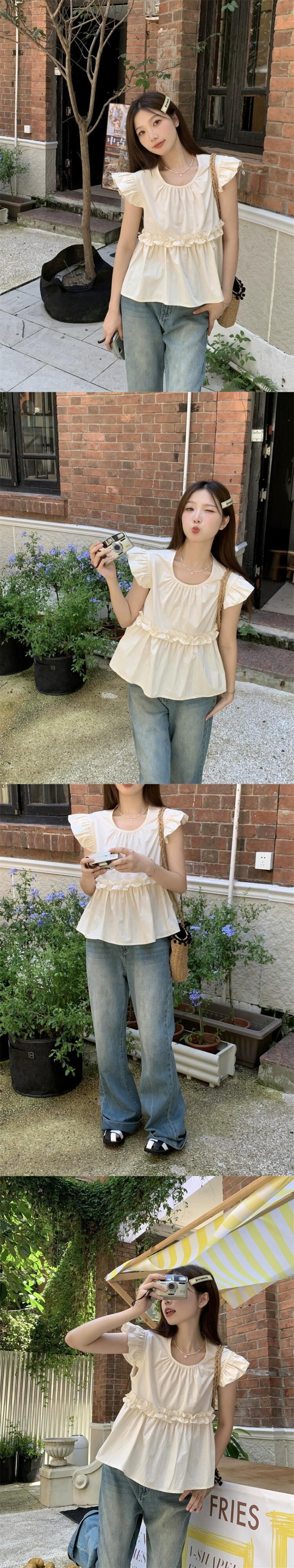 小さなフライングスリーブカバーベリートップ女性の2023年夏新しいユニークなデザインセンス純粋で甘い年齢を減らすピンクのシャツ 大人ガーリー スウィート キュート カジュアル サマー 夏物 ピュア 85716959497473