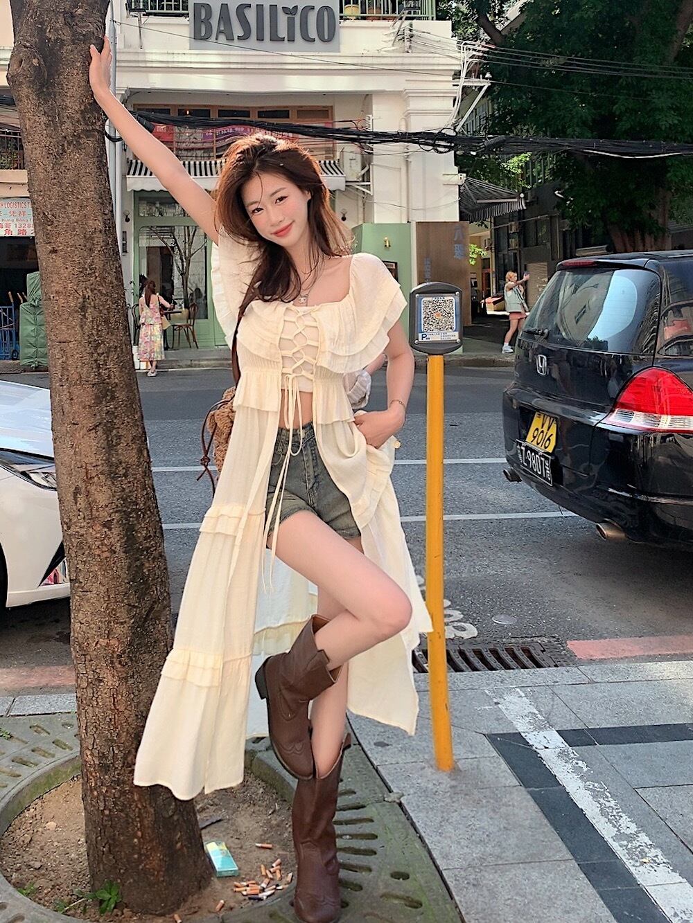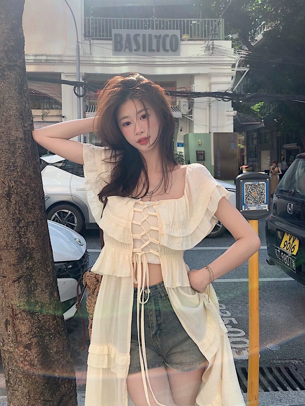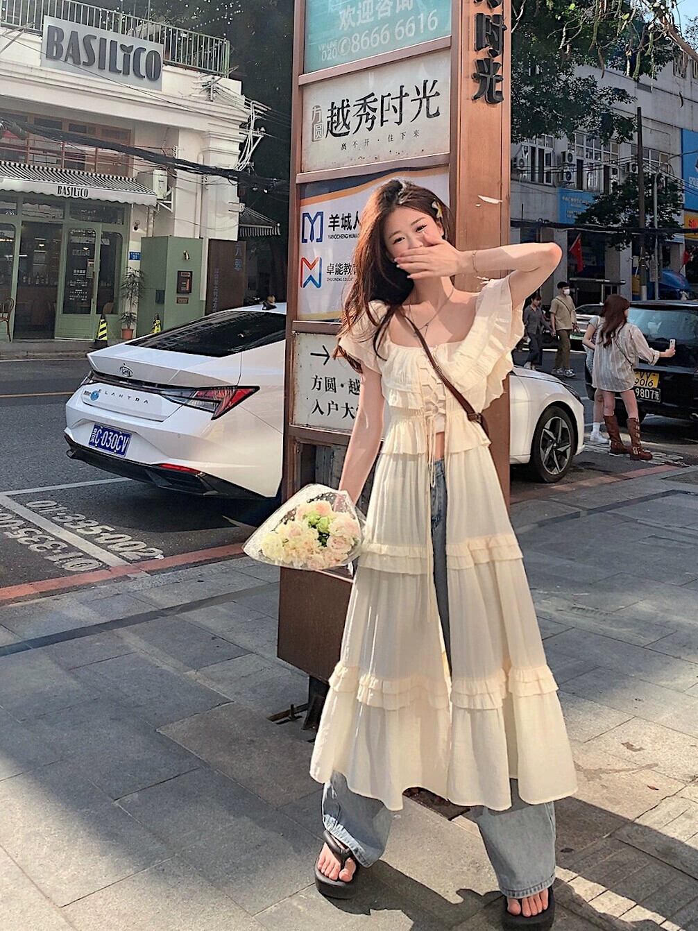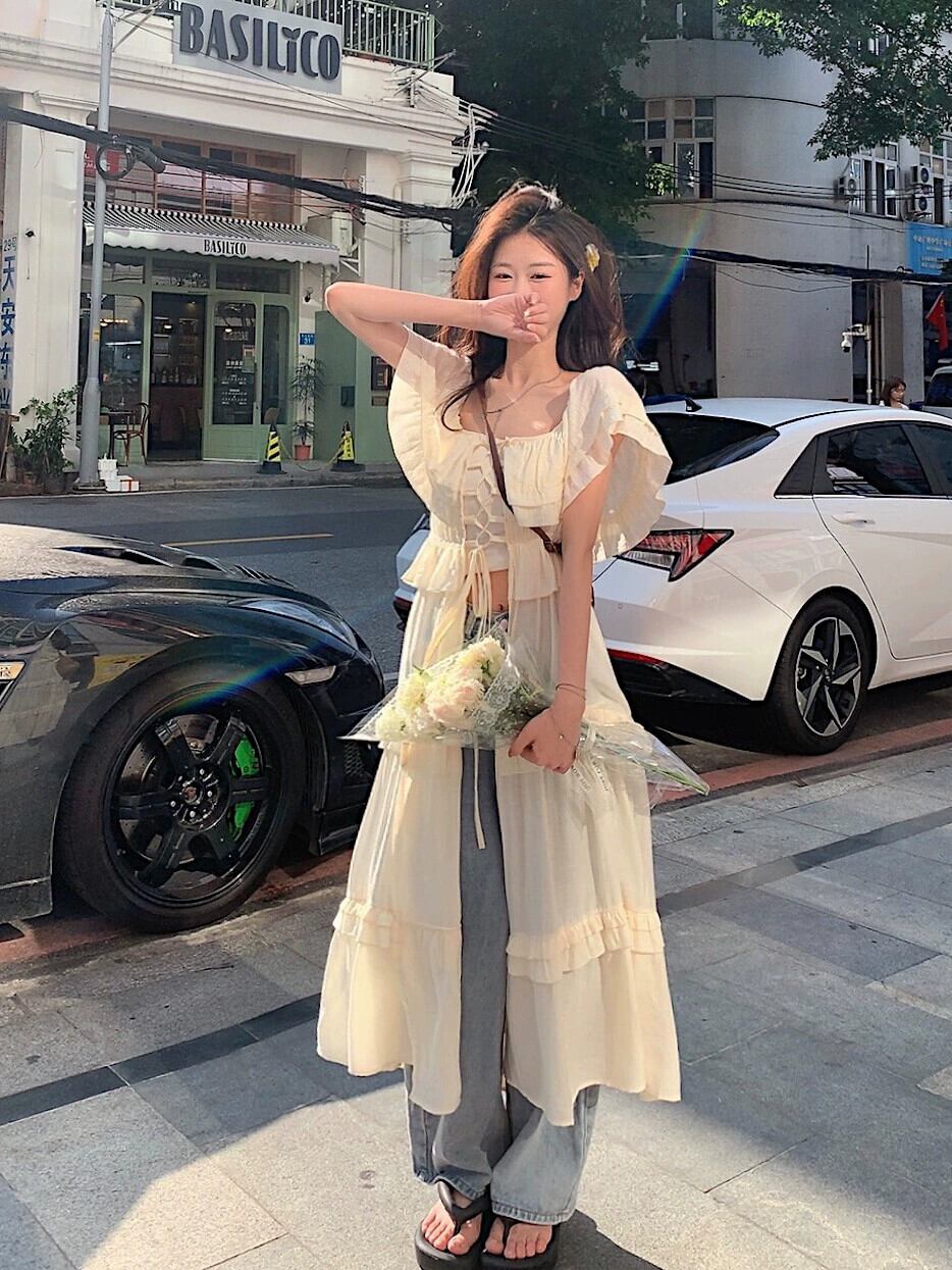 ワンショルダードレスレディースサマーデザインセンススプライシング日焼け止めタイアップホリデーウィンドブラウスとフリルロングスカート 夏物 8571665517973808