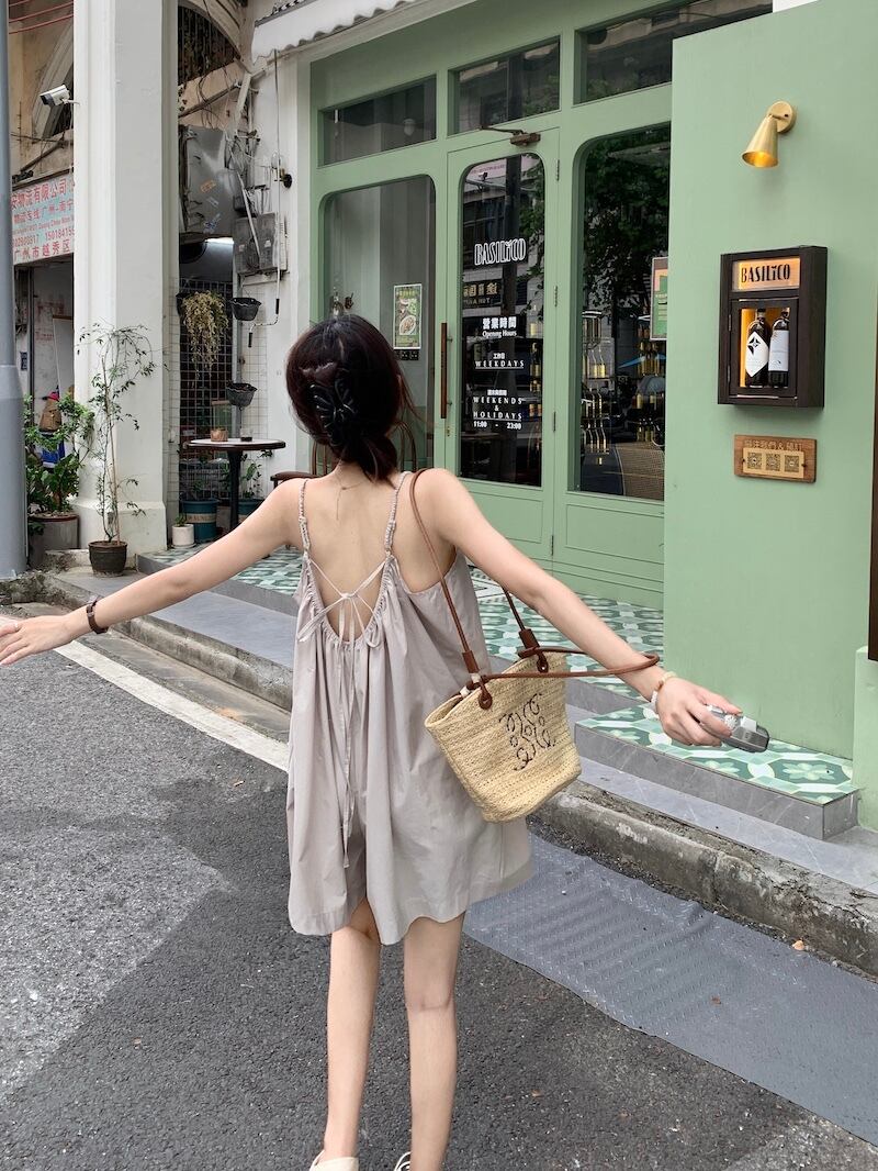 ライトグレーのスリングワンピースショーツ女性の夏薄いジャンプスーツ 2023 新しいファッションバックレスワイドレッグパンツ サマー 夏物 ブルマー 857163637510256
