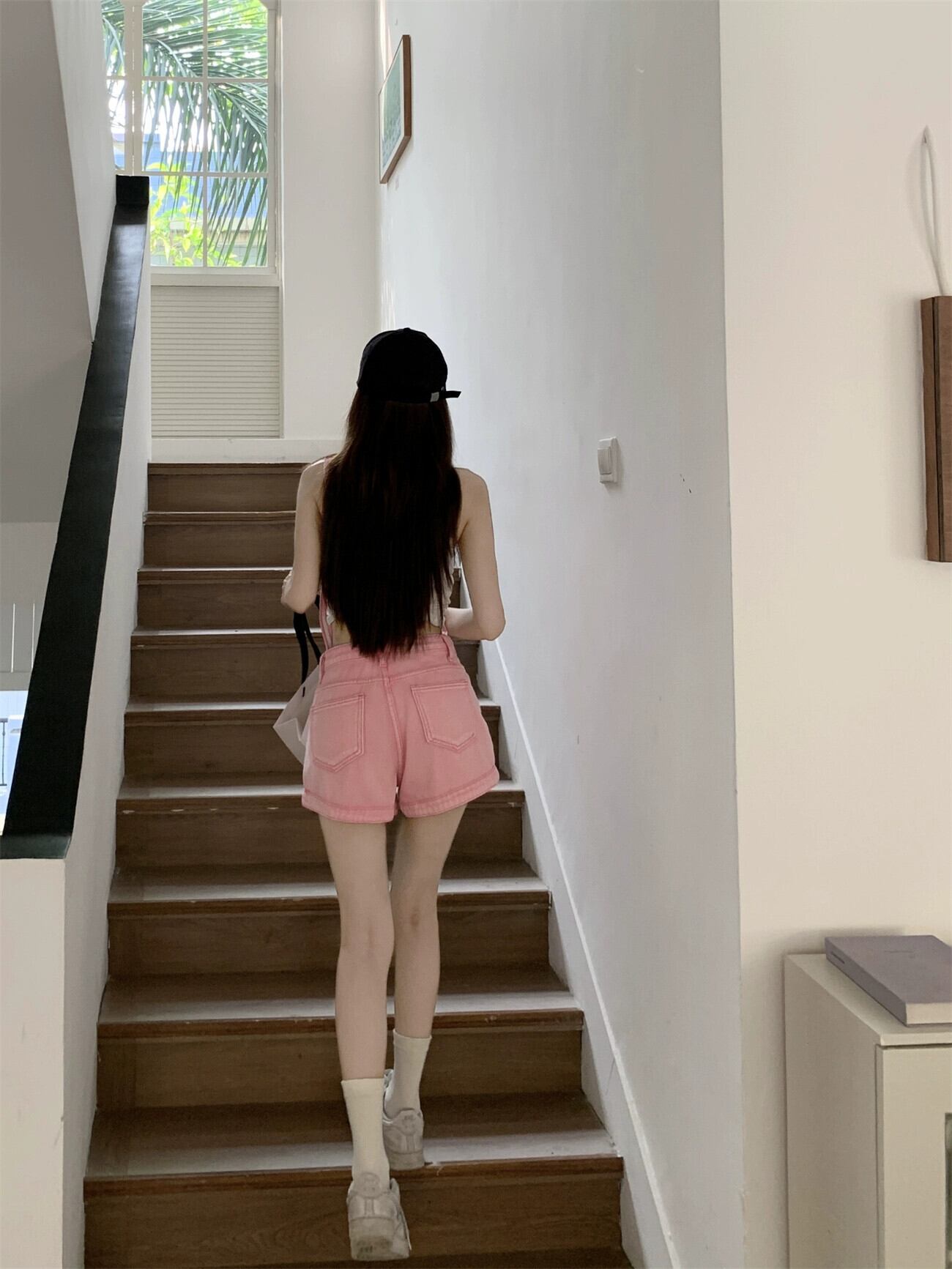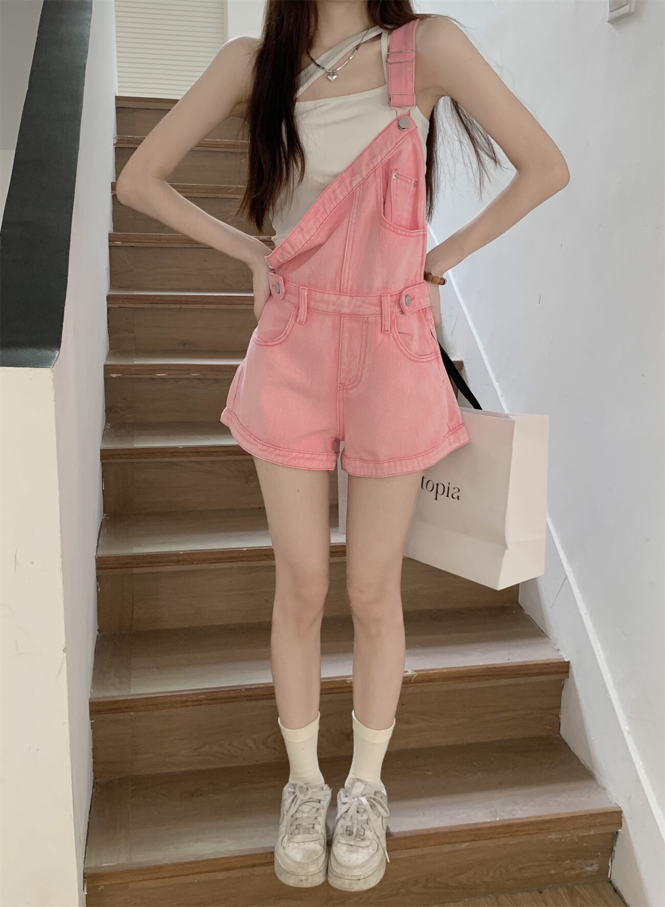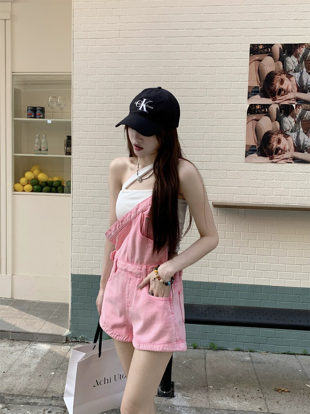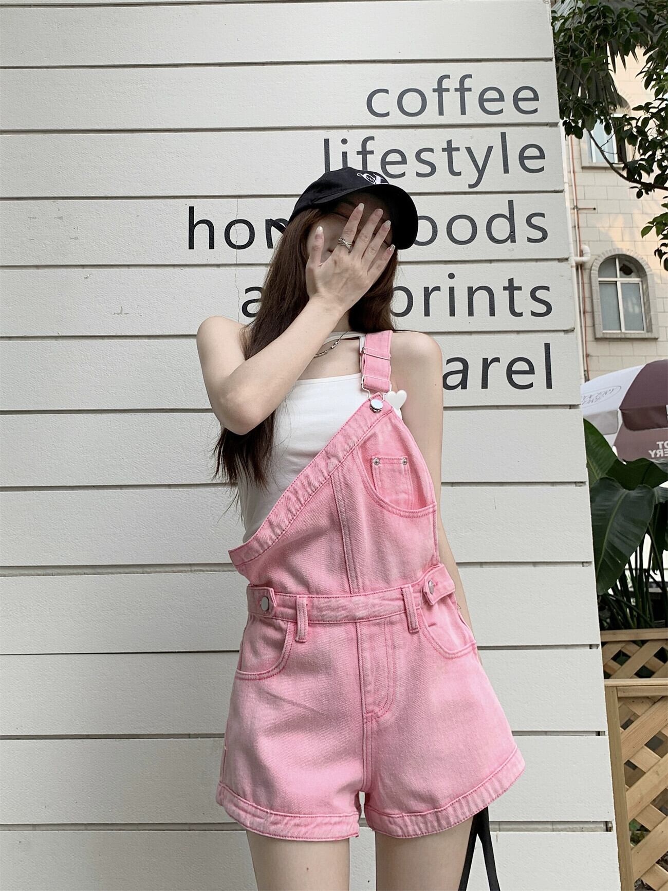 ピンクデニムサスペンダーショーツレディース夏ドーパミンウェアデザインセンス小不規則ワイドレッグパンツ サマー 夏物 ブルマー 8571653995545121