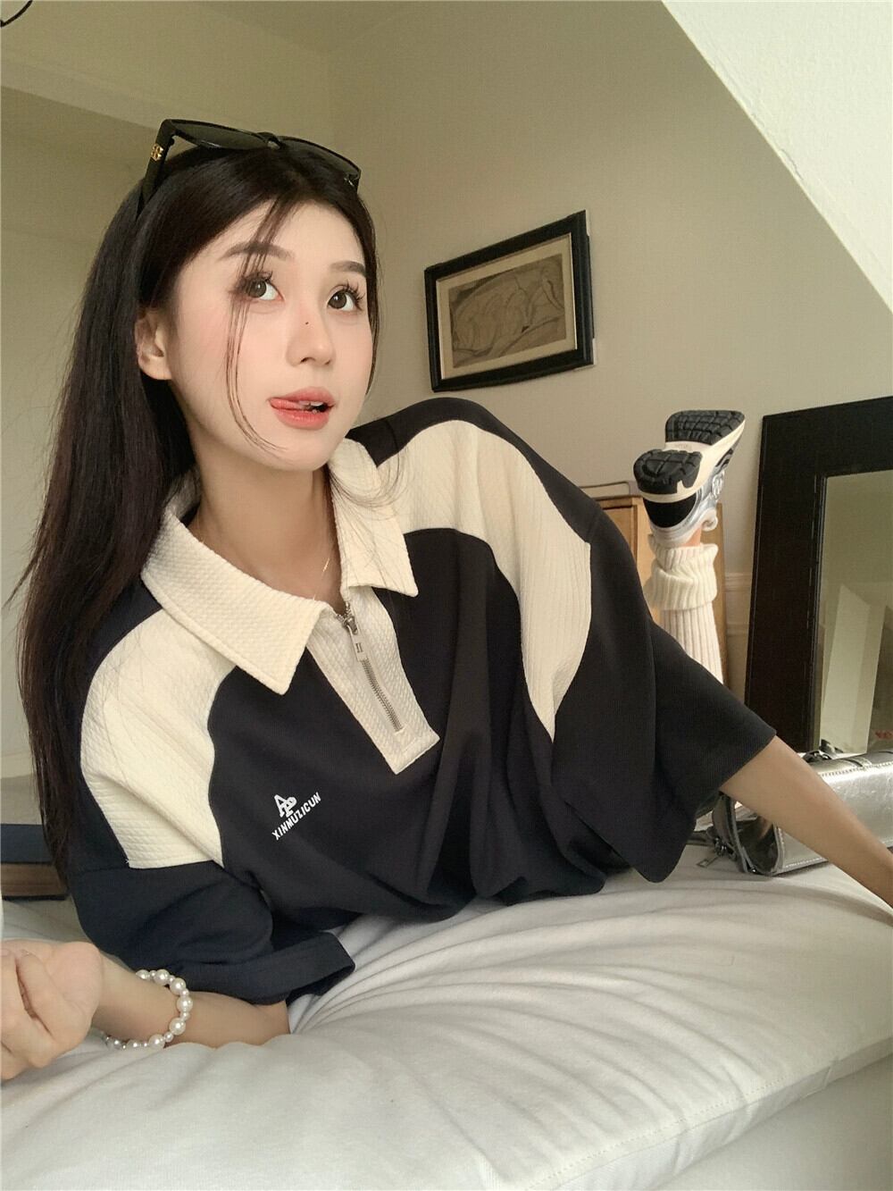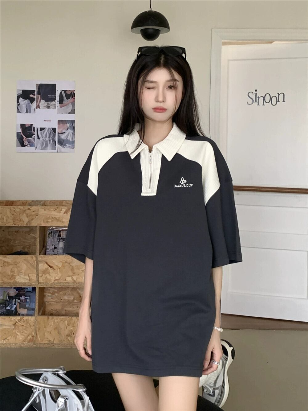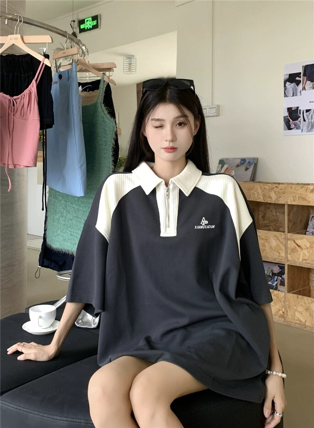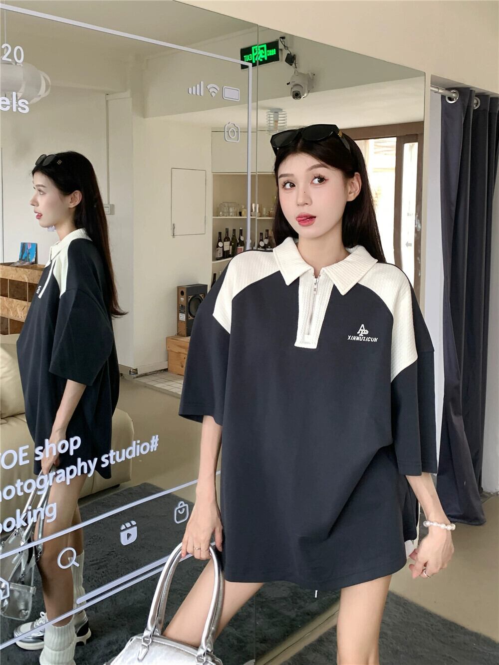 ポロ襟コントラストカラー半袖Tシャツレディース夏アメリカンレトロオーバーサイズゆったりレイジー風ミドル丈トップス サマー 夏物 8571689458841719
