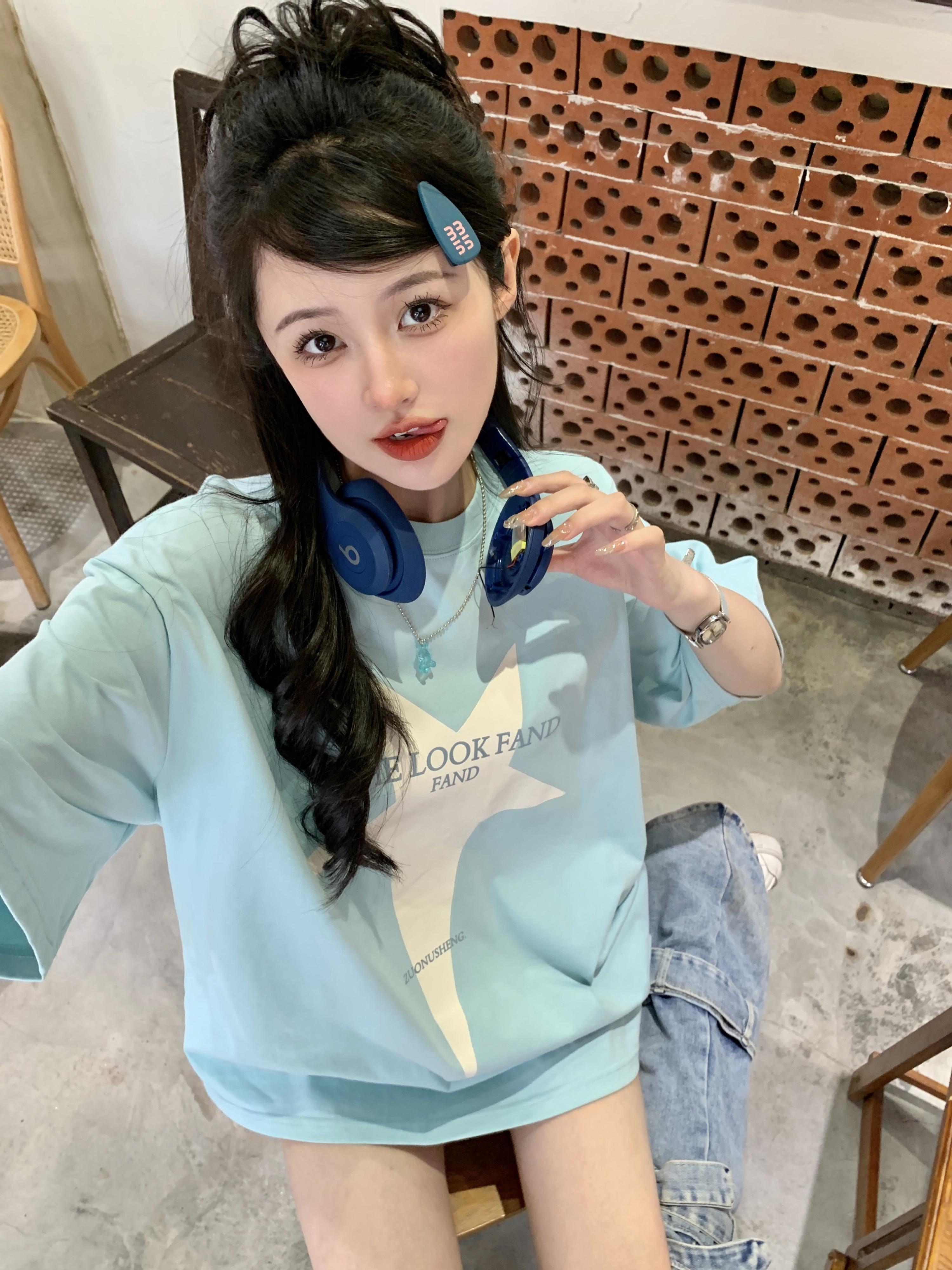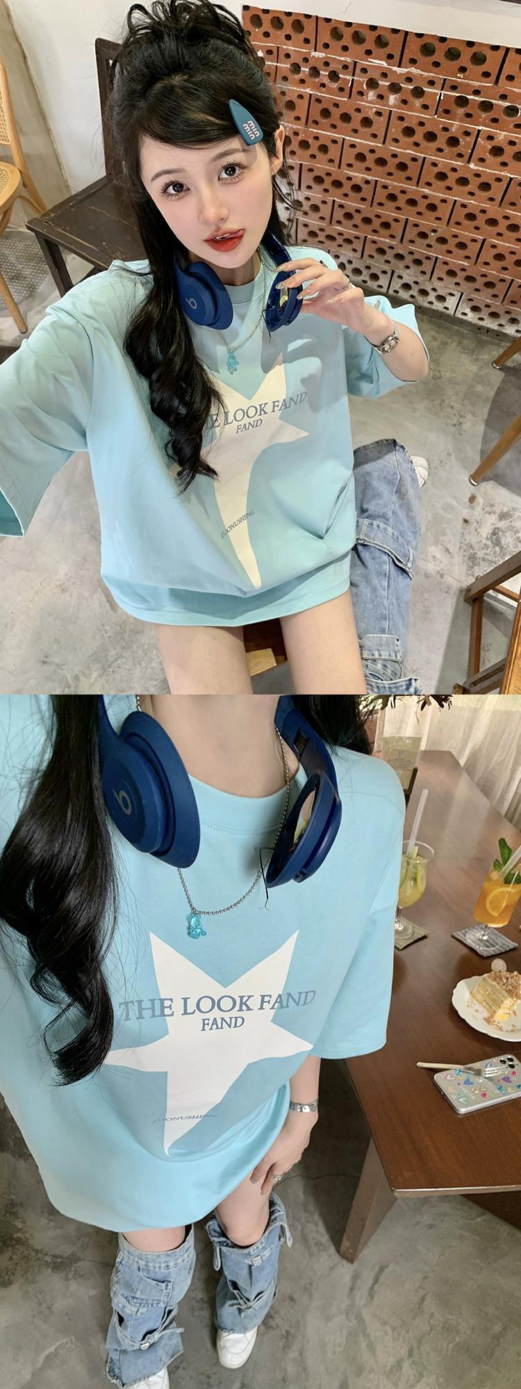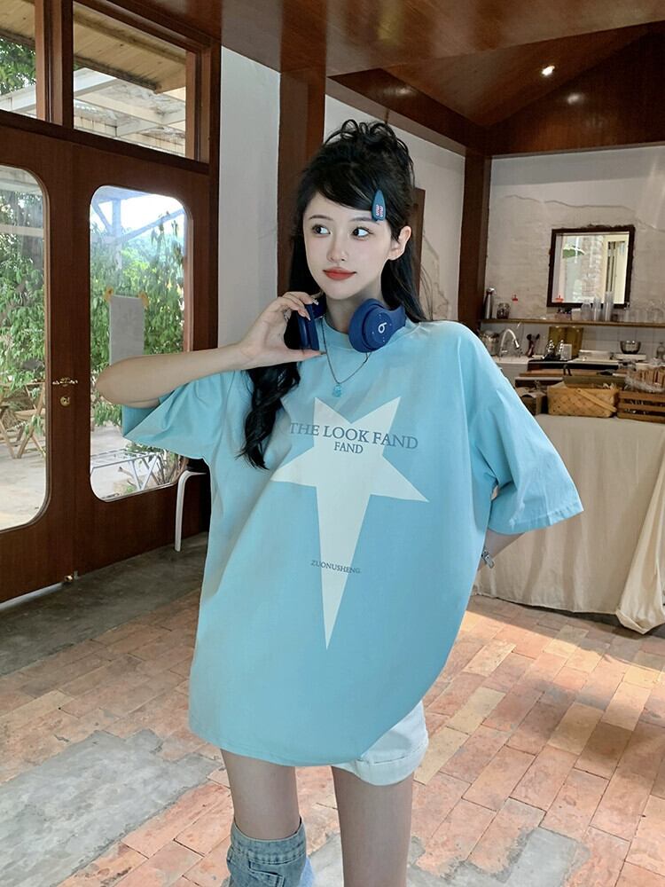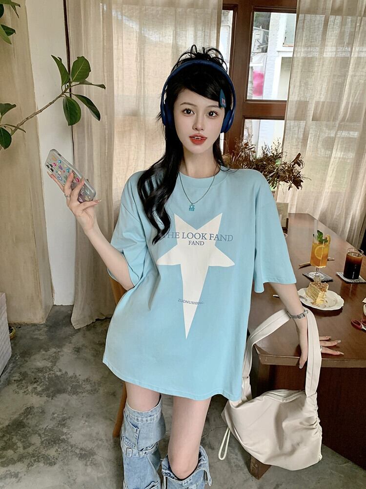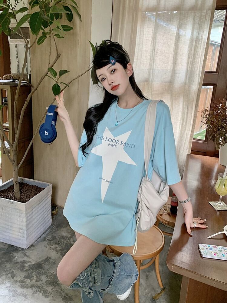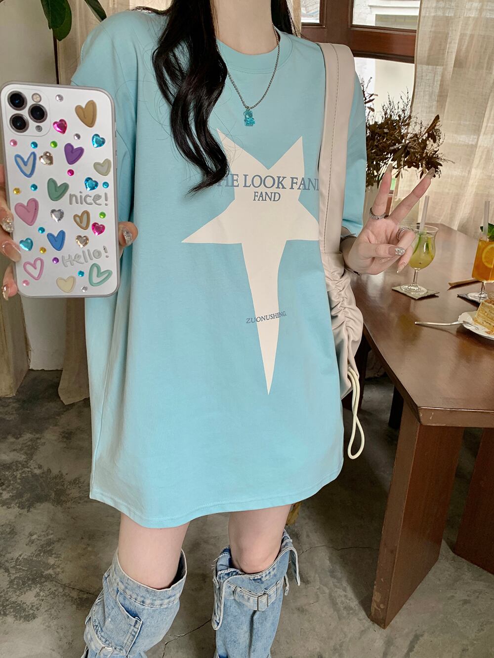 ドーパミンウェアプリント半袖Tシャツレディース夏新作ティファニーブルールーズミッドレングスお尻カバートップ サマー 夏物 857166599989777