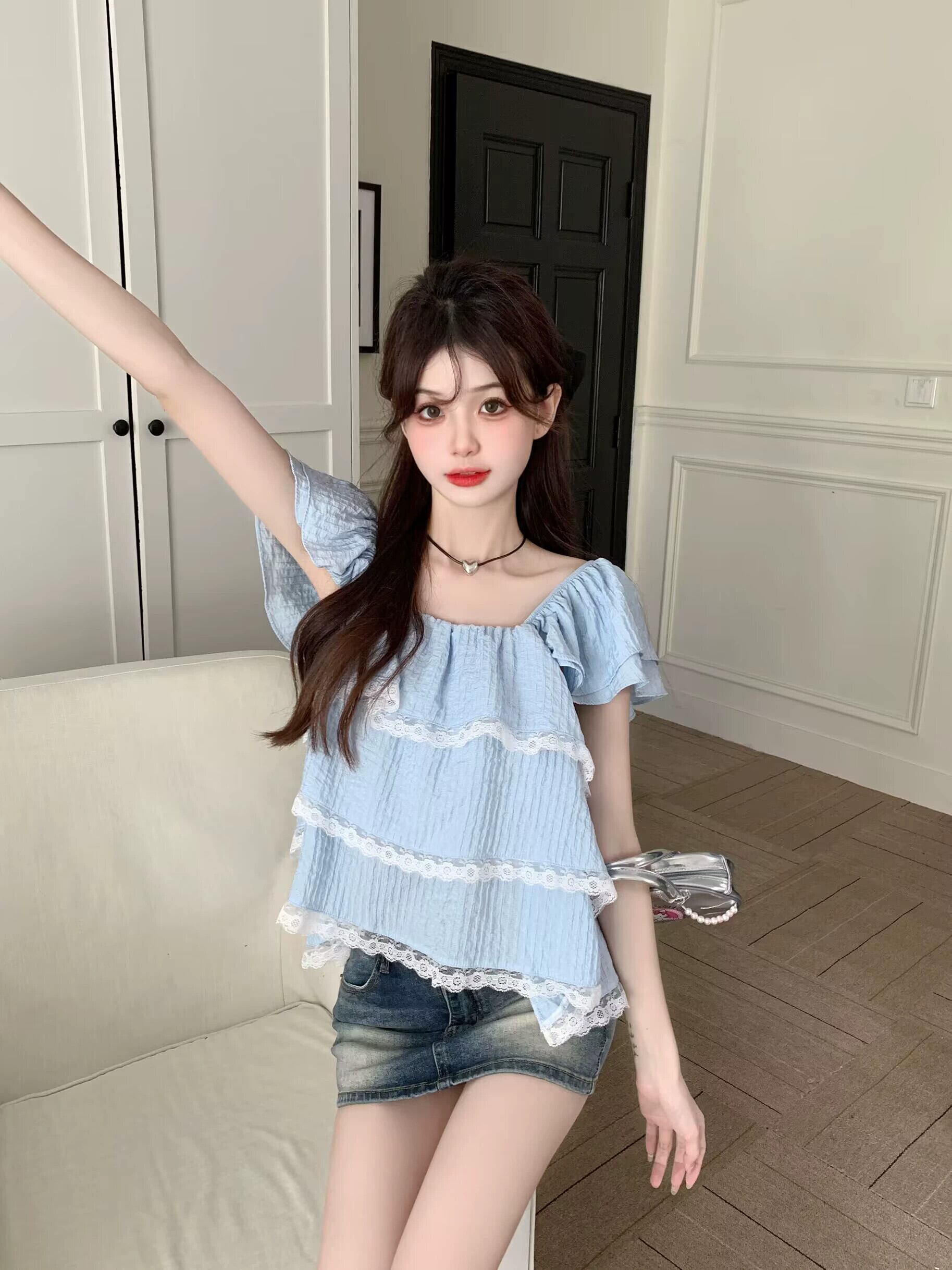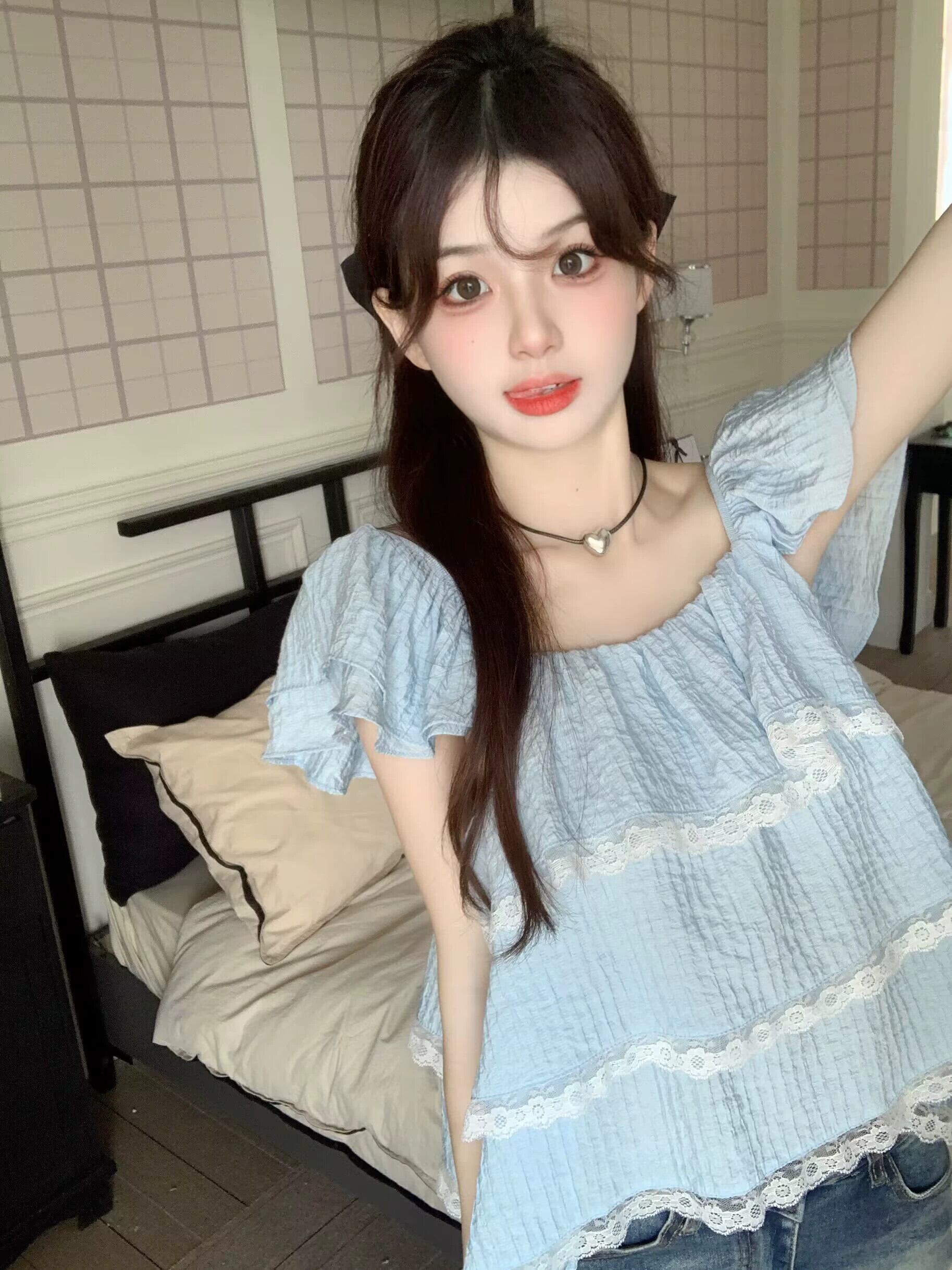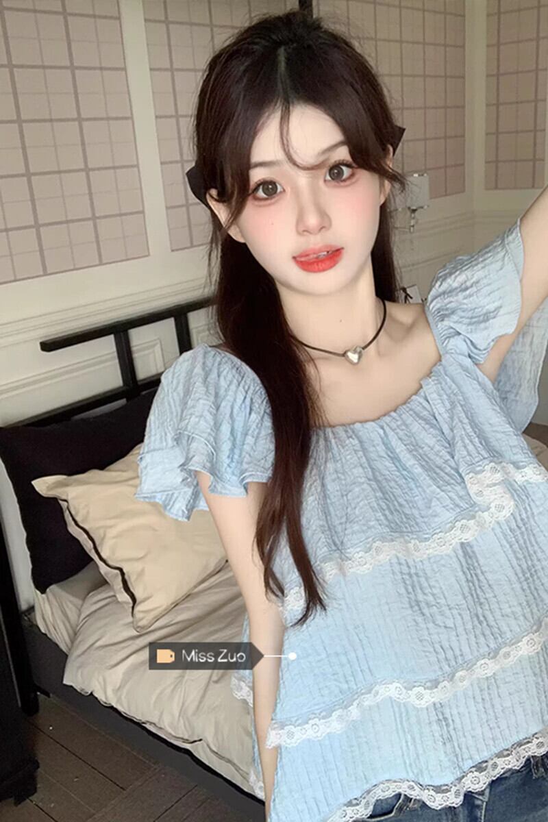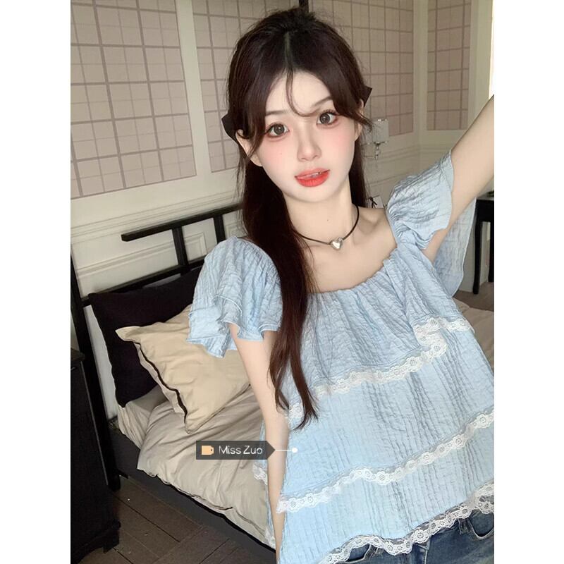 Feifei スリーブドールシャツトップ女性の夏の 2023 新しい甘くて年齢を減らすレースレースの小さな青いシャツ ブルー 大人ガーリー スウィート キュート カジュアル サマー 夏物 8571635166159500