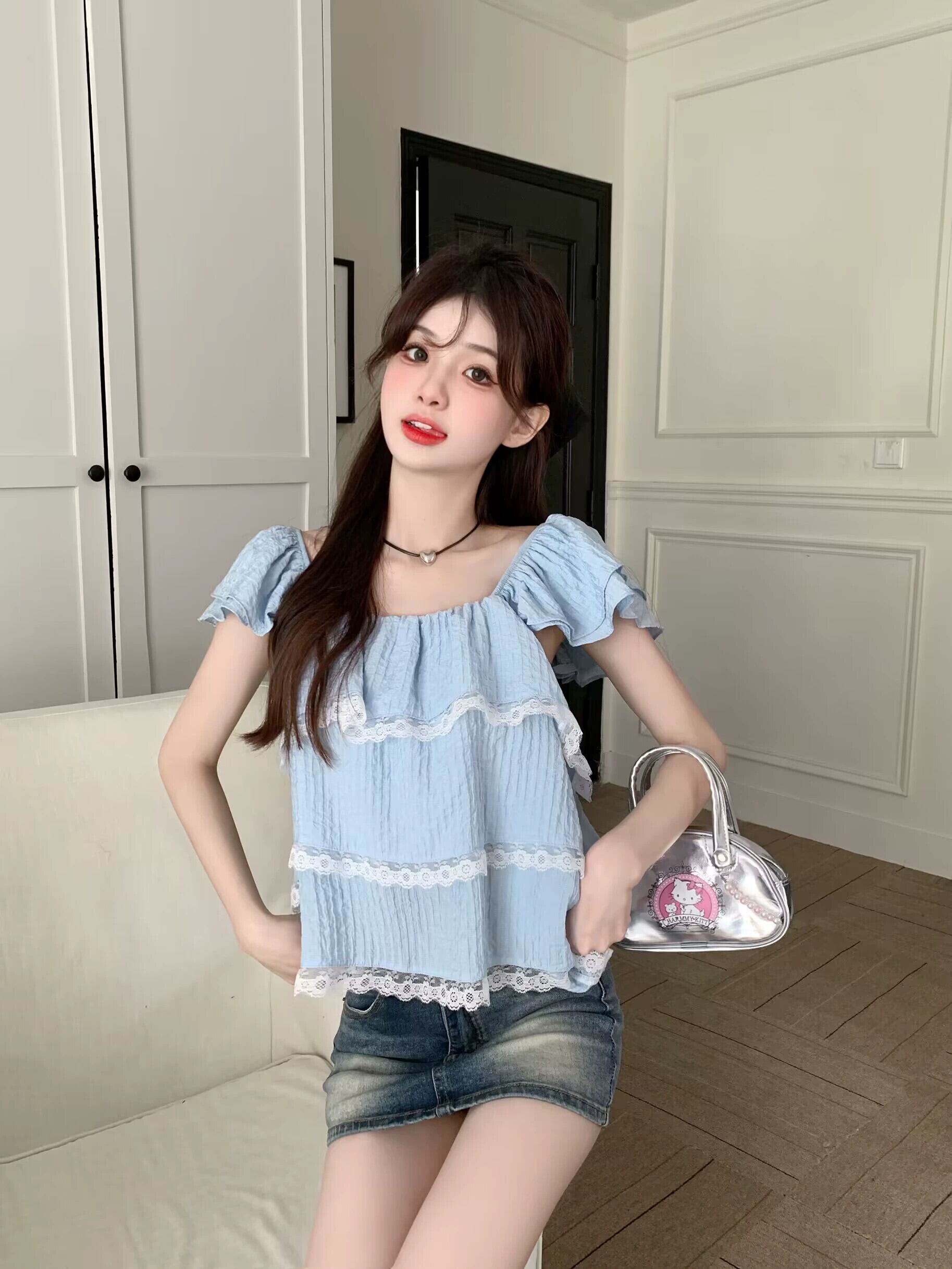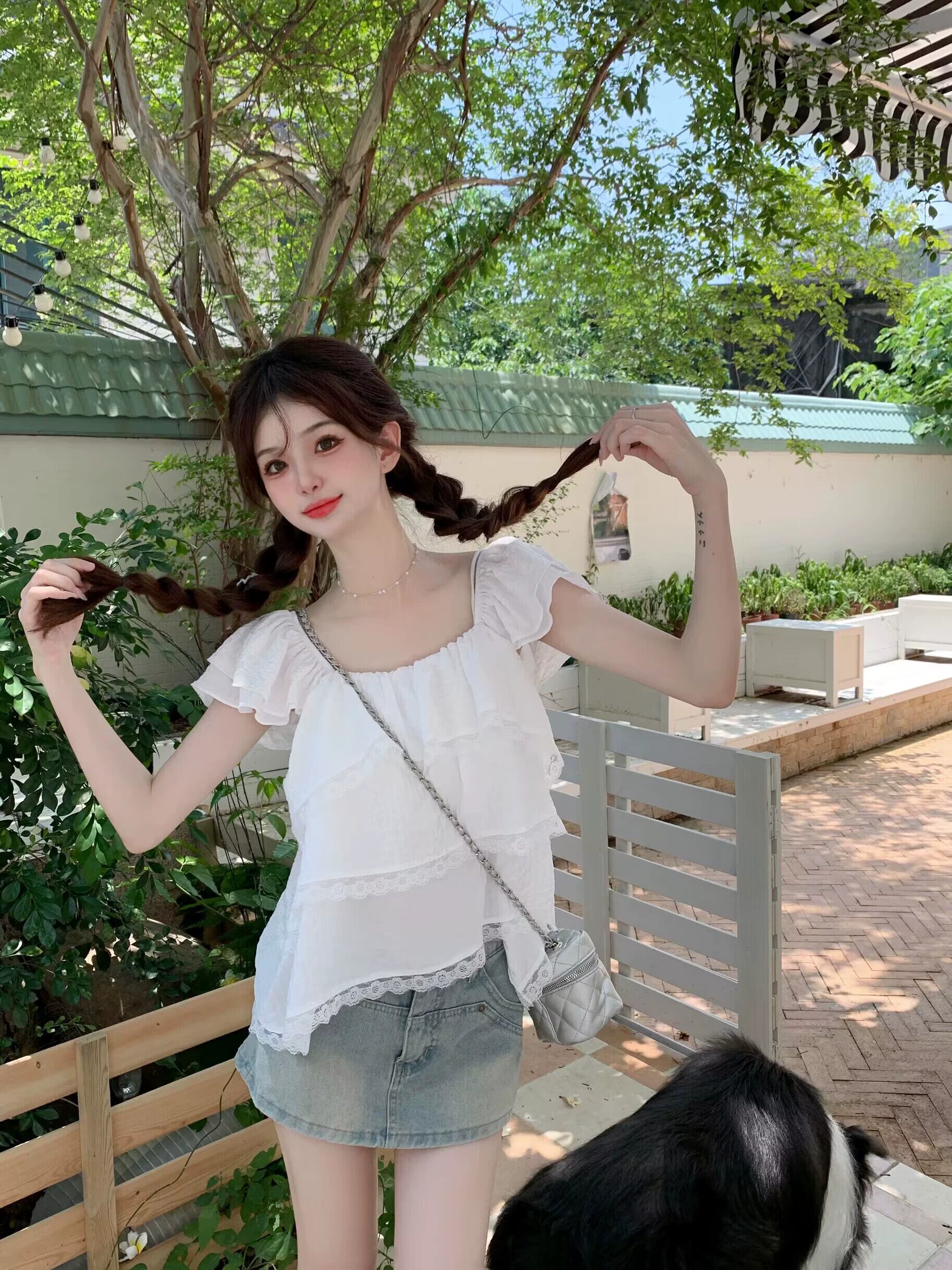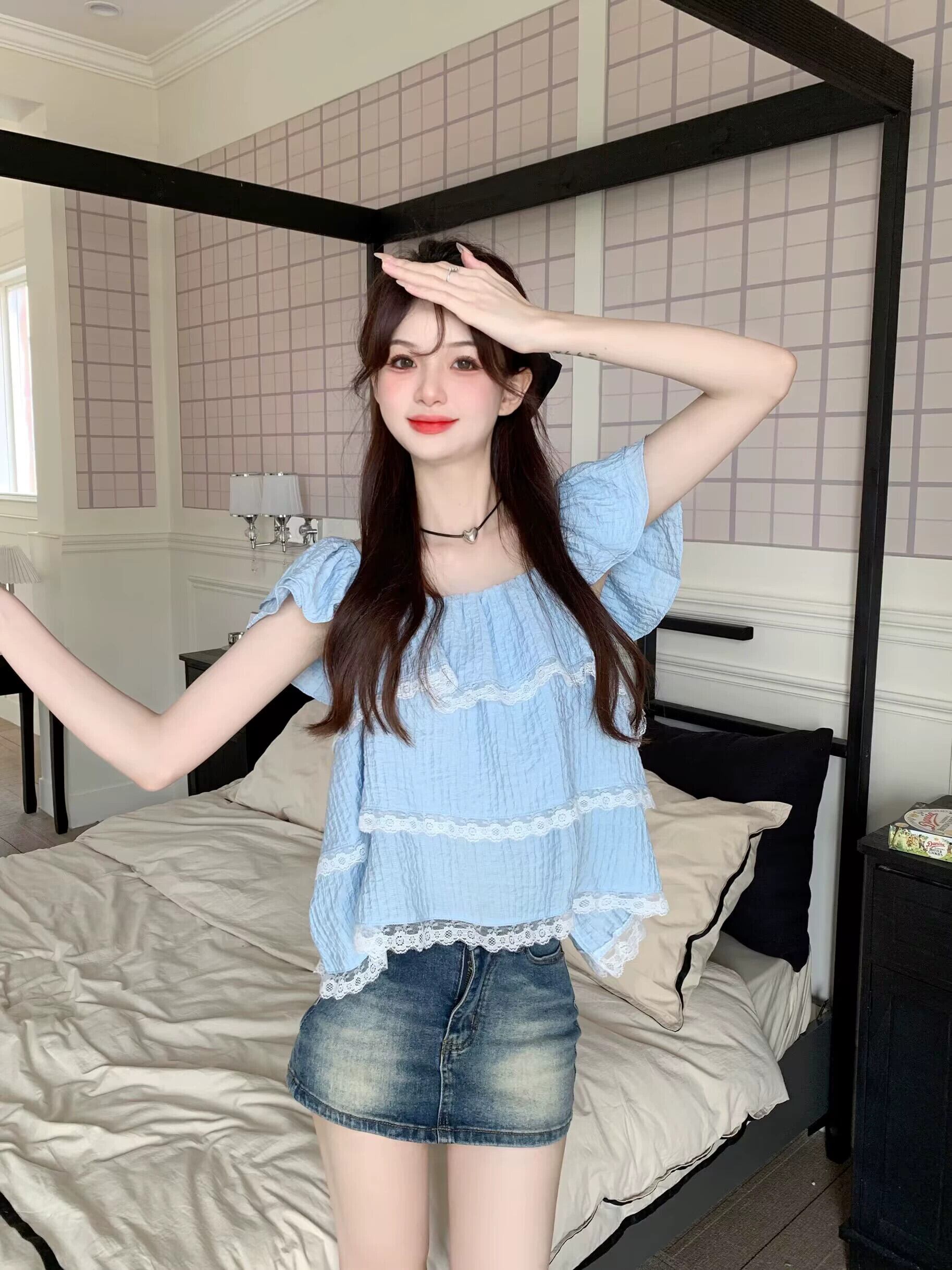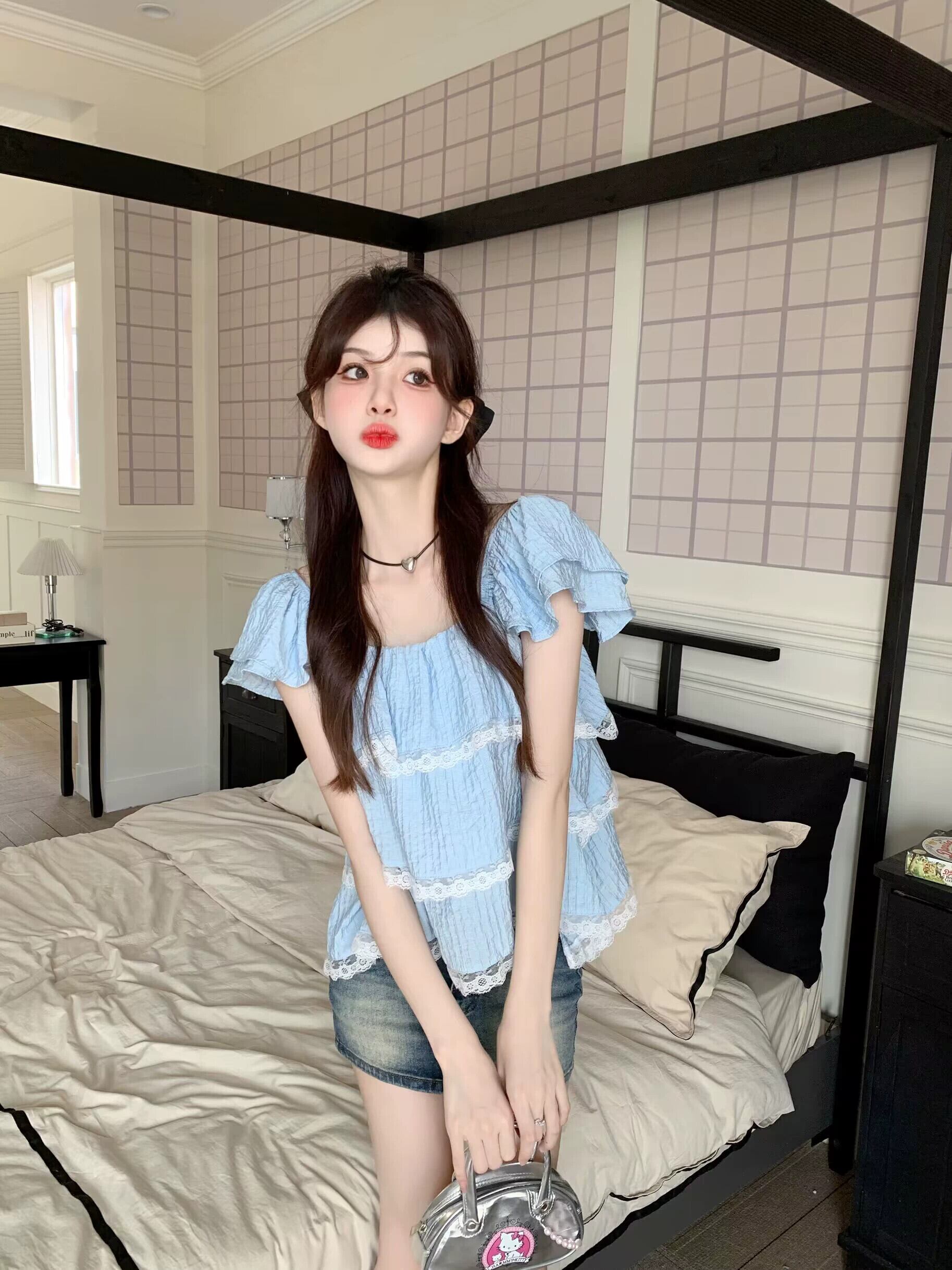 Feifei スリーブドールシャツトップ女性の夏の 2023 新しい甘くて年齢を減らすレースレースの小さな青いシャツ ブルー 大人ガーリー スウィート キュート カジュアル サマー 夏物 8571635166159500
