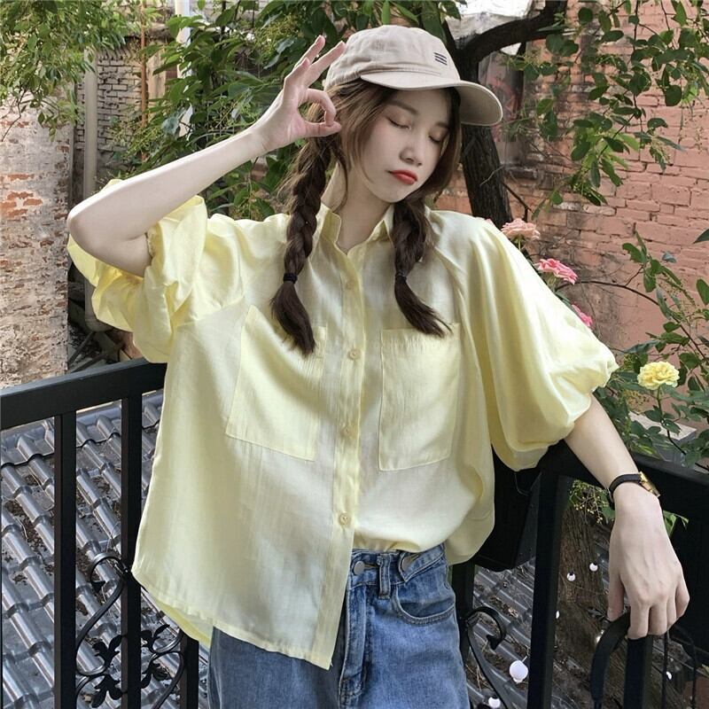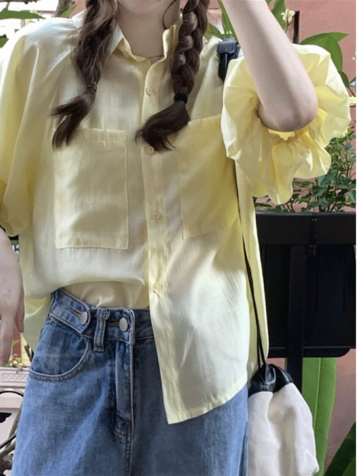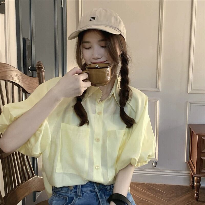 パフスリーブトップレディース2023夏新作フレンチスタイル優しい気質ハイレベルルーズブルー半袖シャツ サマー 夏物 8571673716588687