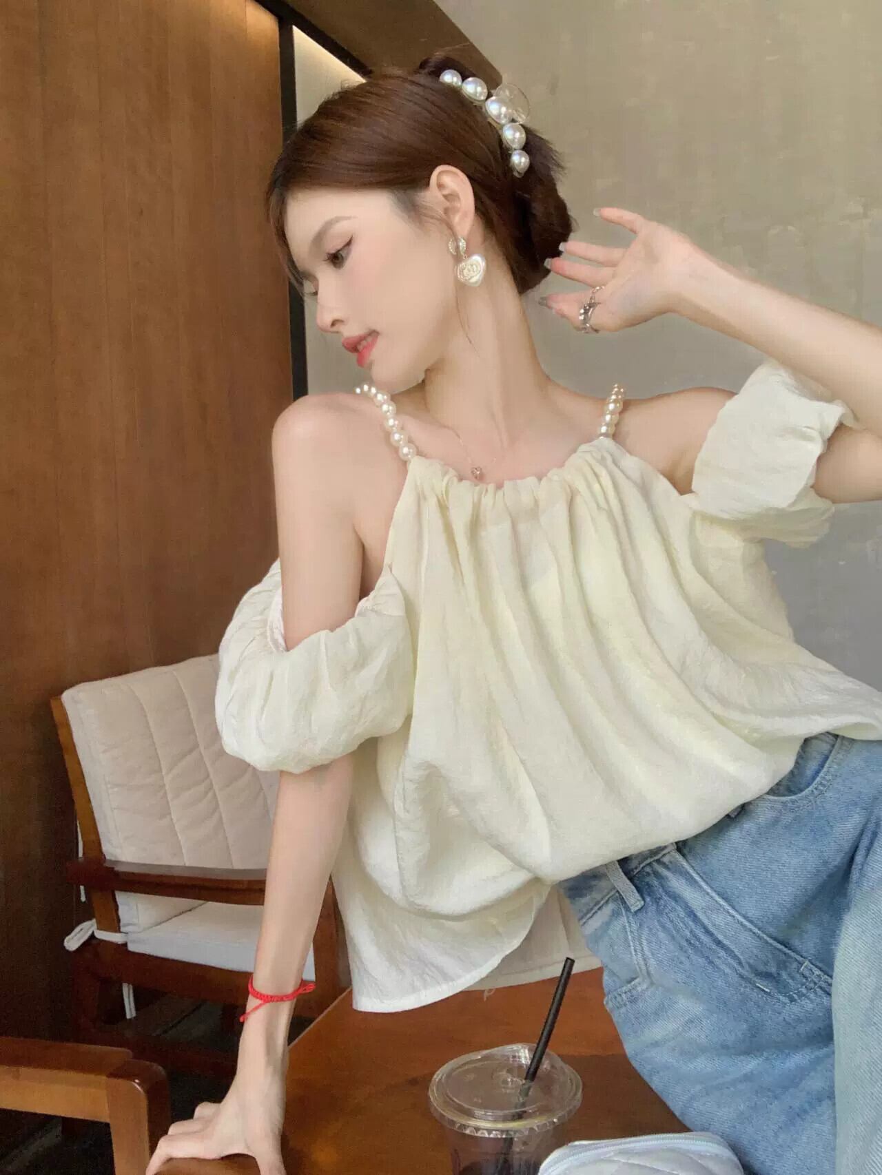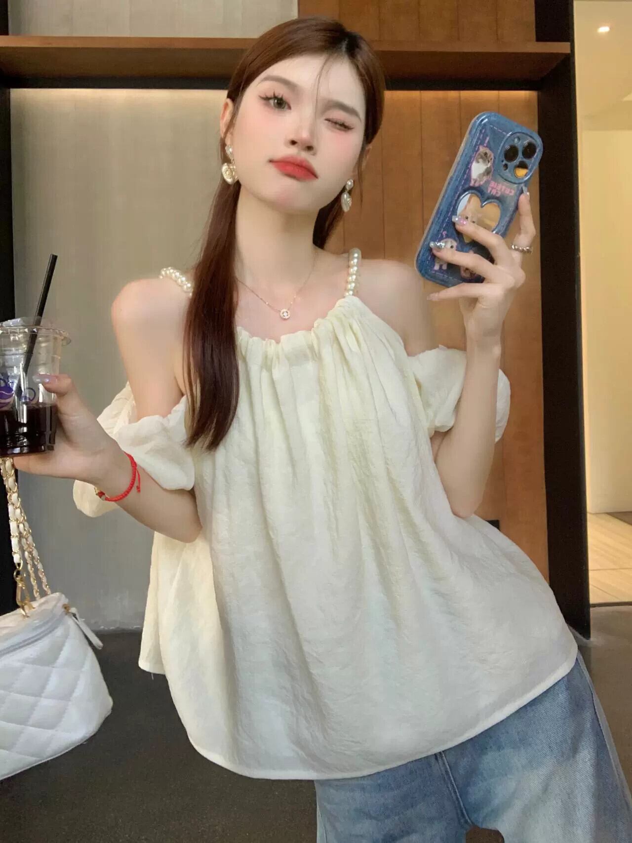 ホルターネックストラップレスシフォントップ女性の夏の 2023 新しいフレンチニッチスーパー妖精美しいファッションパフスリーブシャツ サマー 夏物 8571611586404444
