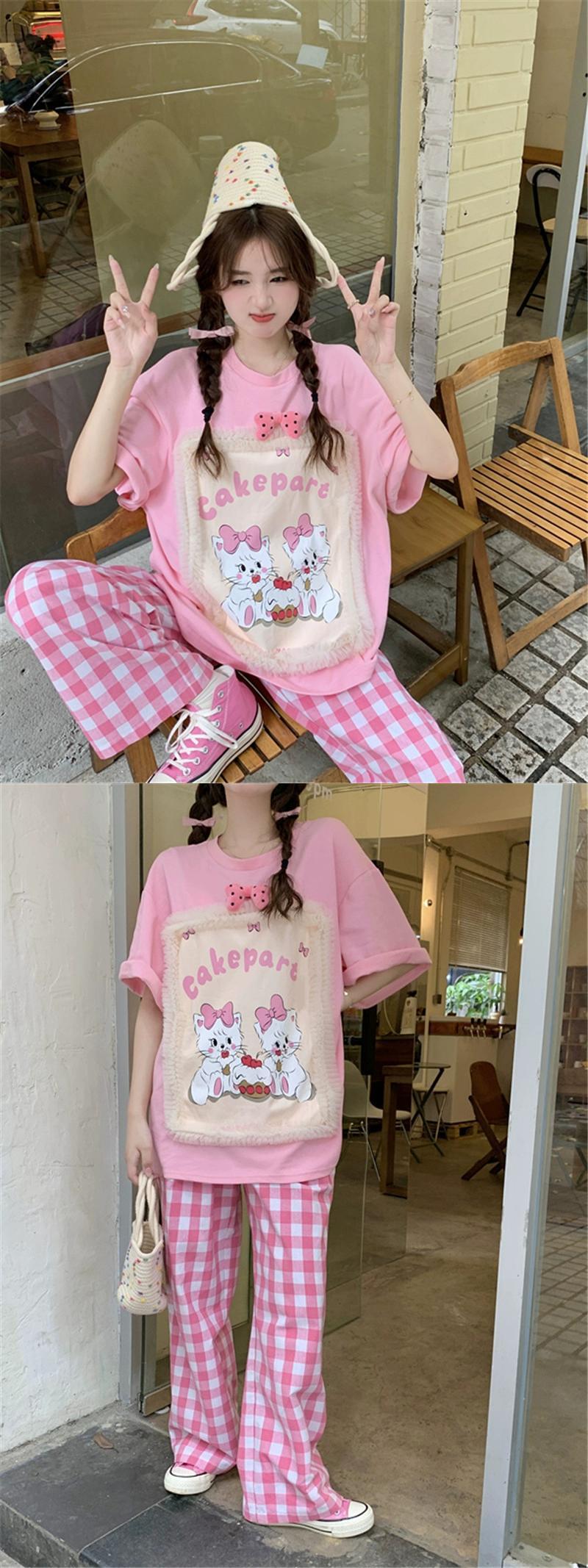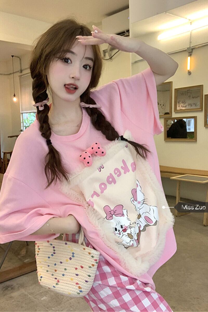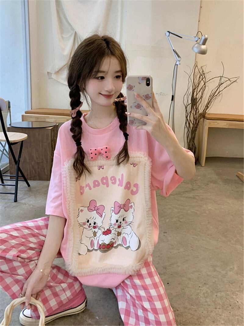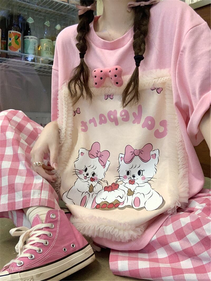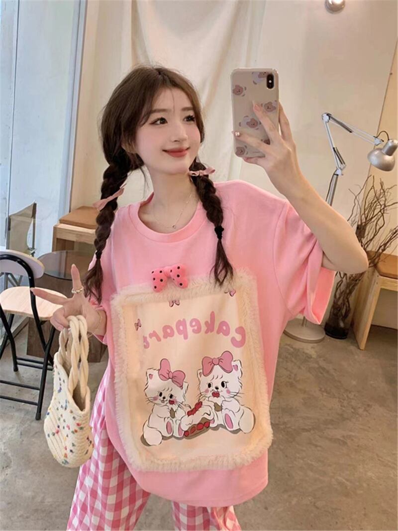 ピンクの半袖 T シャツの女性の夏のドーパミン着用、重工業の漫画のプリント、甘い年齢を減らす eign スタイルのルーズ トップ 大人ガーリー スウィート キュート カジュアル サマー 夏物 Tシャツ 8571690632918317