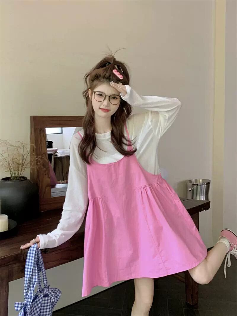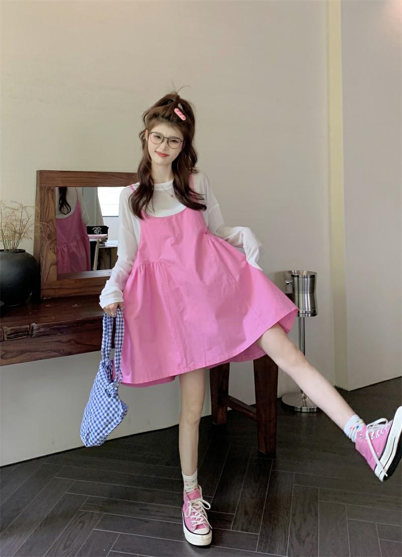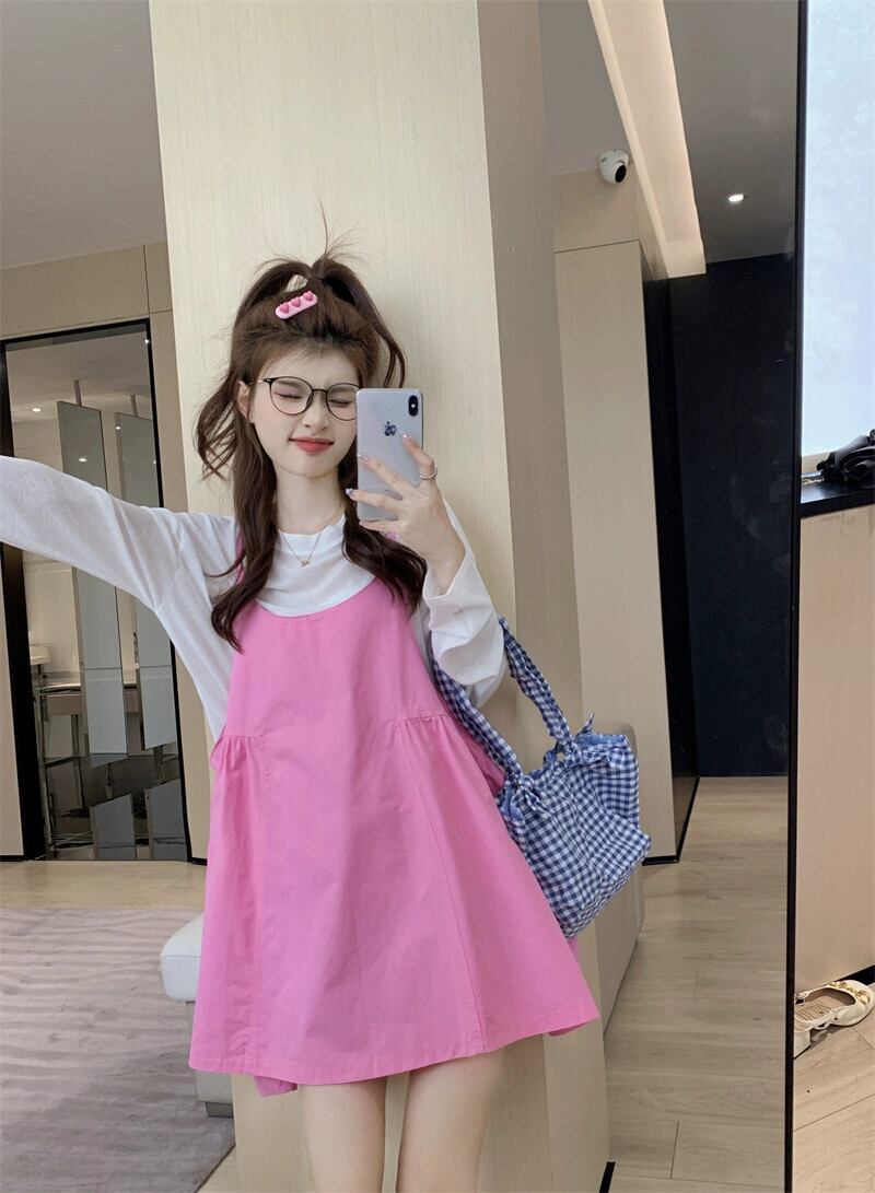 色:白い日焼け止めT,ピンクのサスペンダードレス