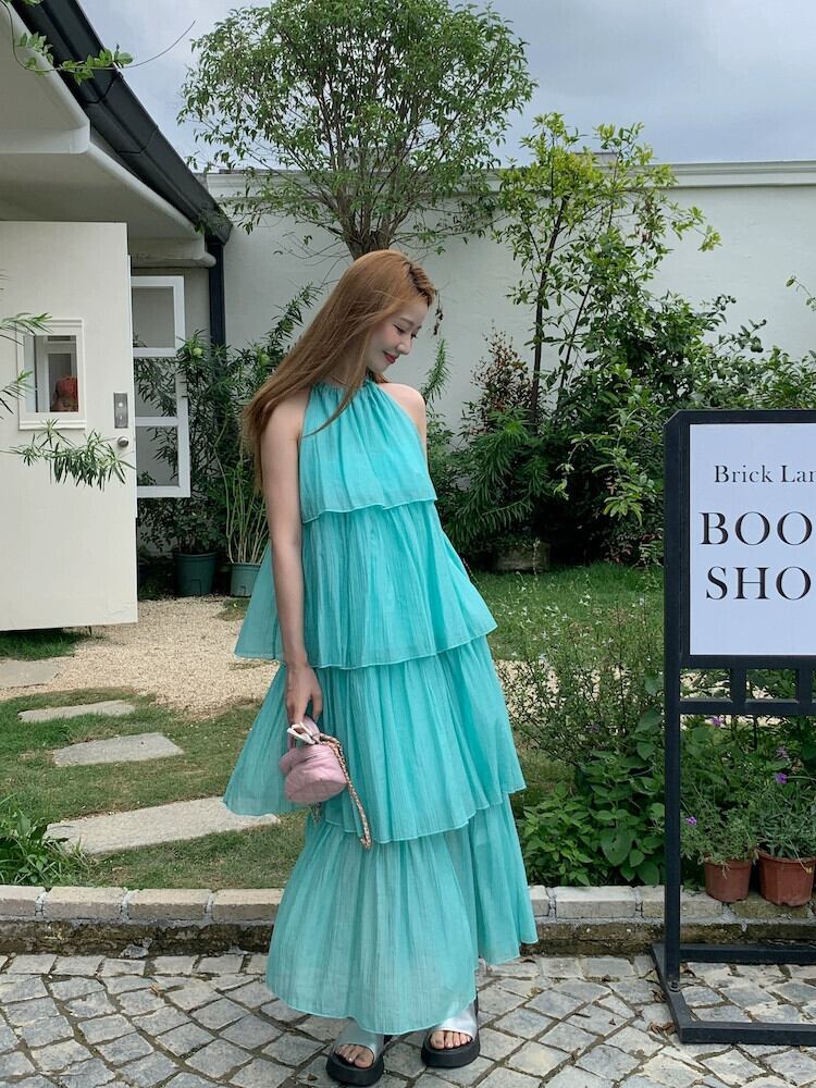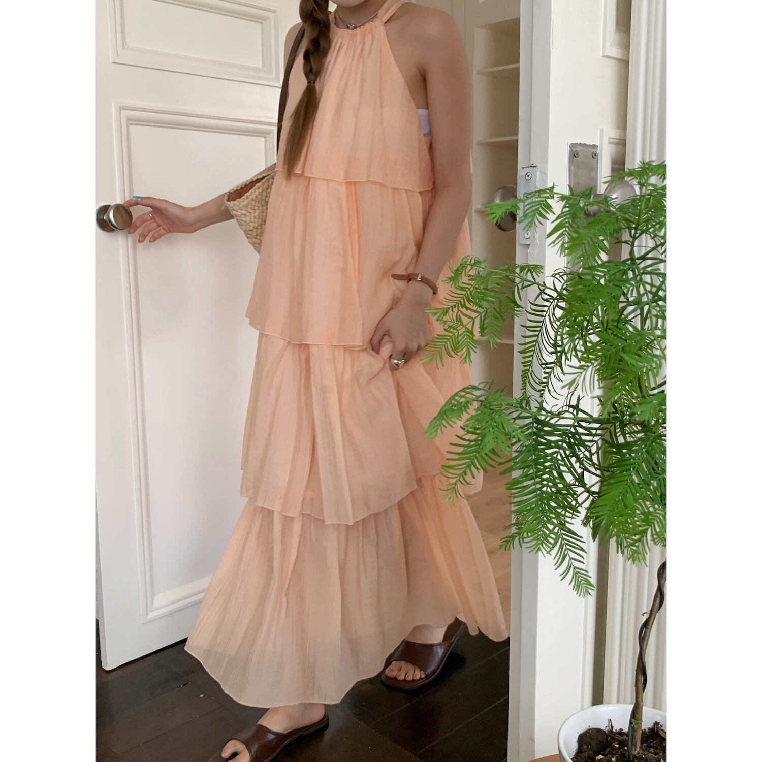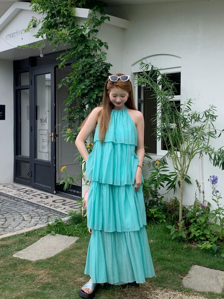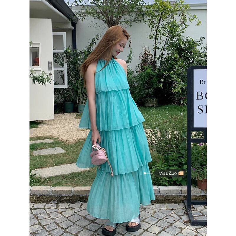 湖ブルー吊りネックドレス女性の夏の新しい層ケーキスカート気質美しい海辺の休日のロングスカート サマー 夏物 8571658081406420