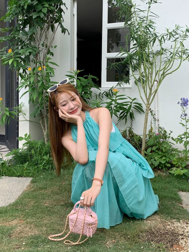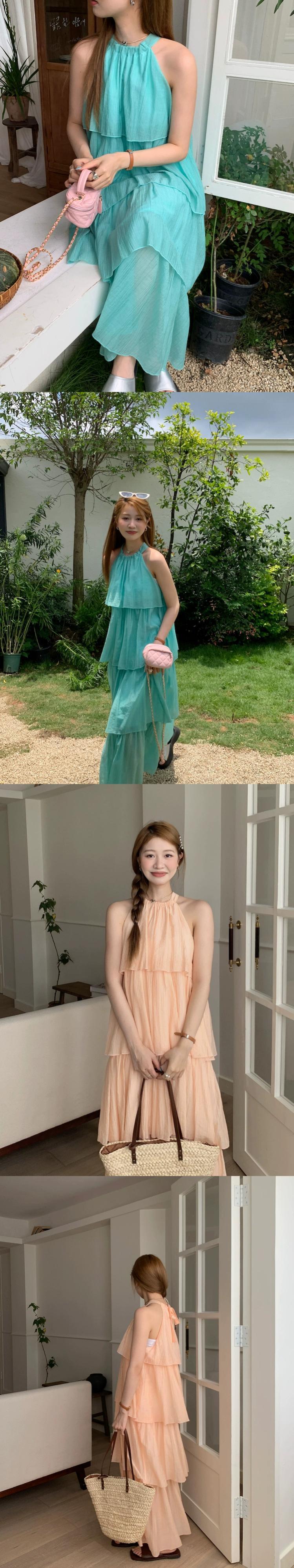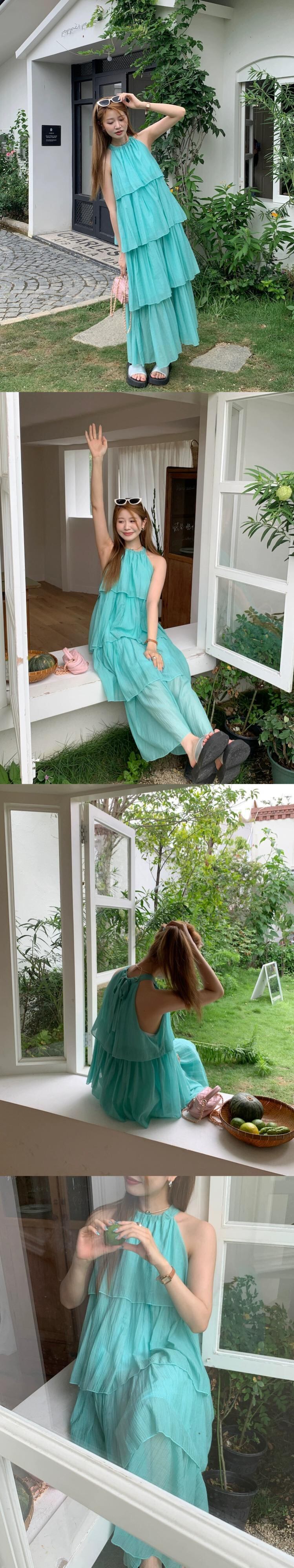 湖ブルー吊りネックドレス女性の夏の新しい層ケーキスカート気質美しい海辺の休日のロングスカート サマー 夏物 8571658081406420