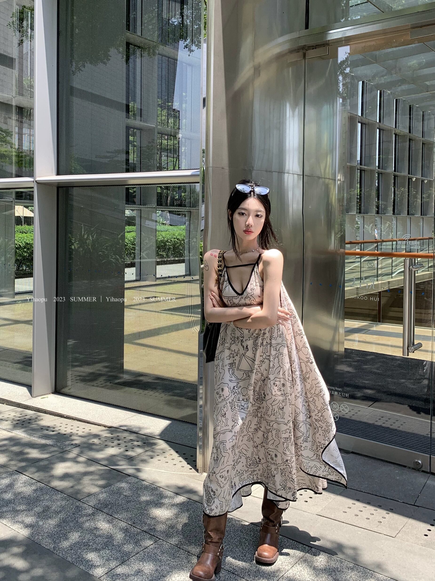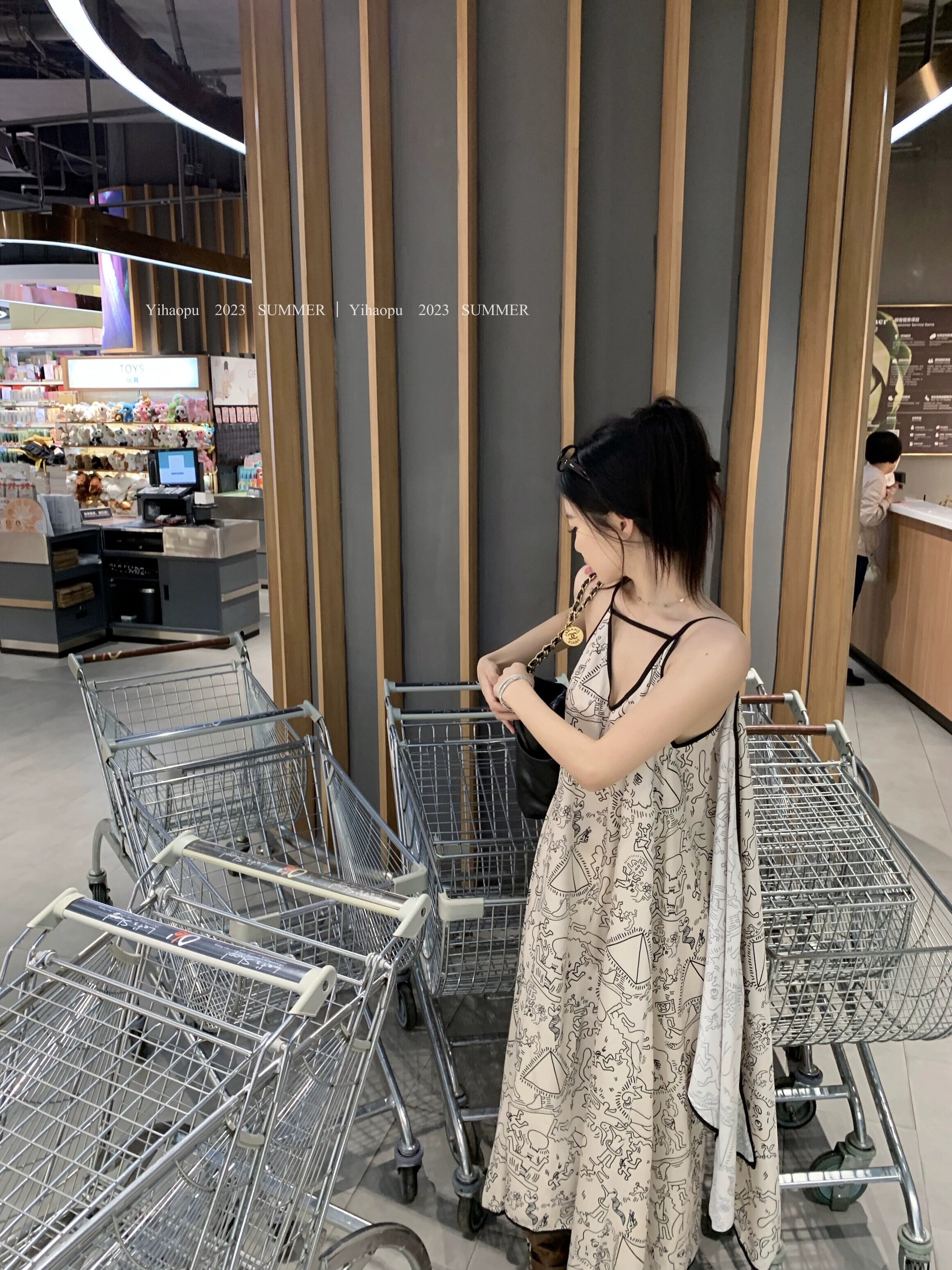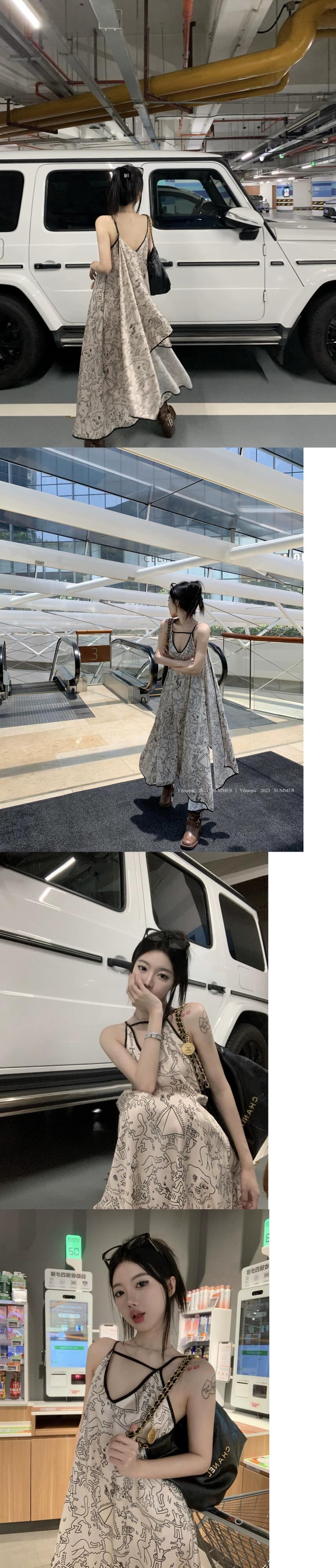 前後2着プリントサスペンダードレスレディース夏フレンチレトロルーズイレギュラーシーサイドホリデーロングスカート サマー 夏物 8571676458236723